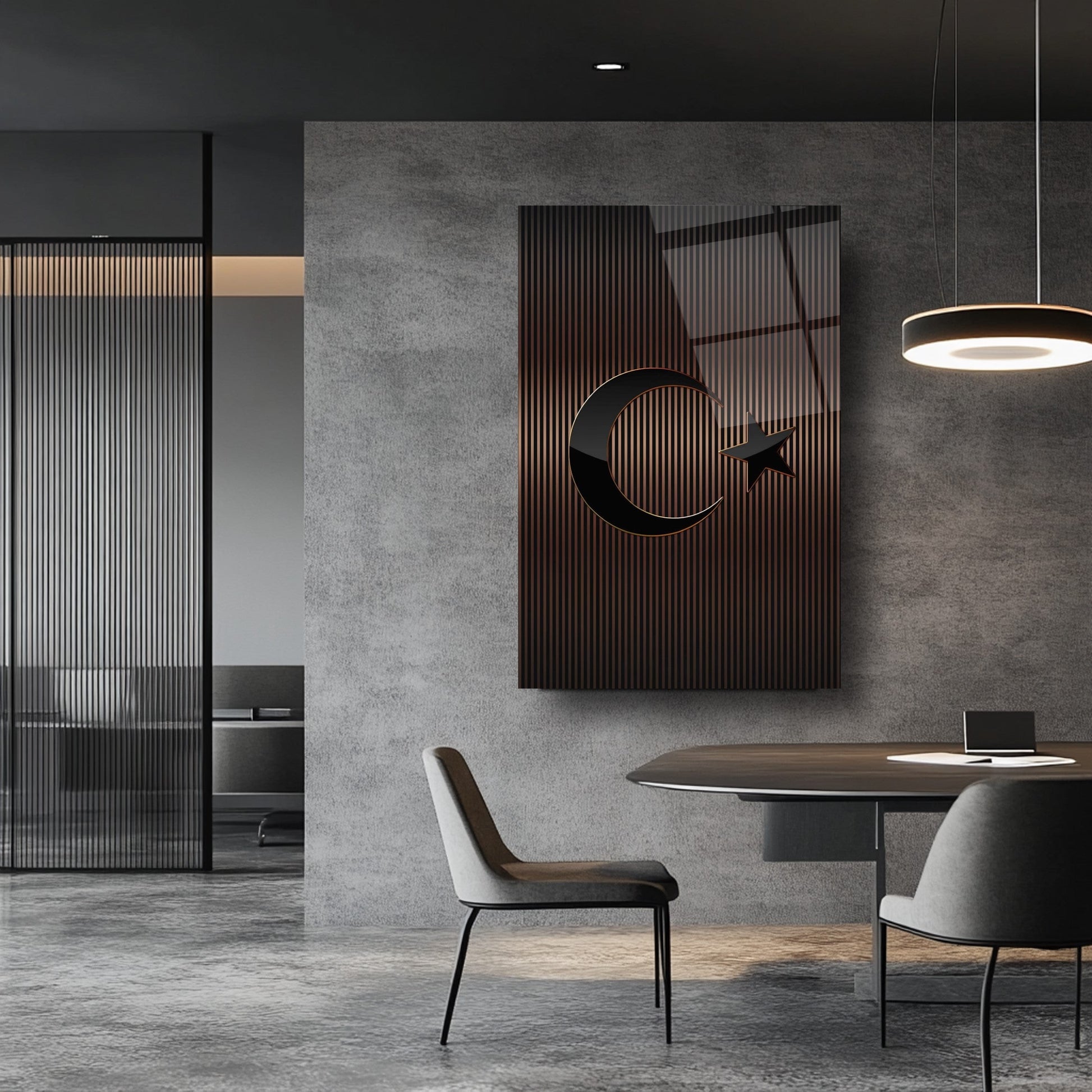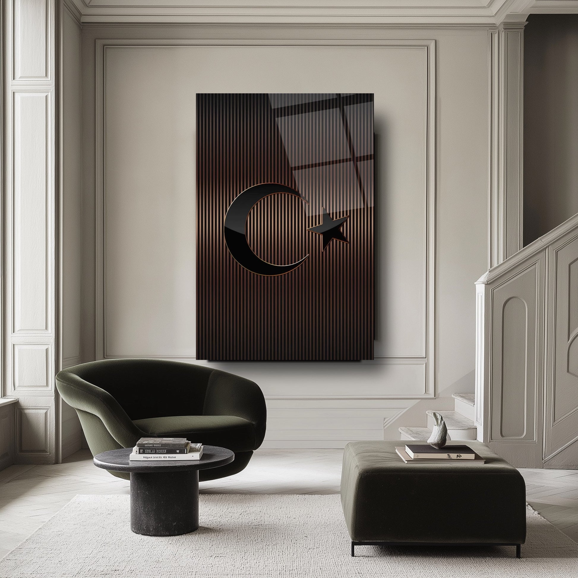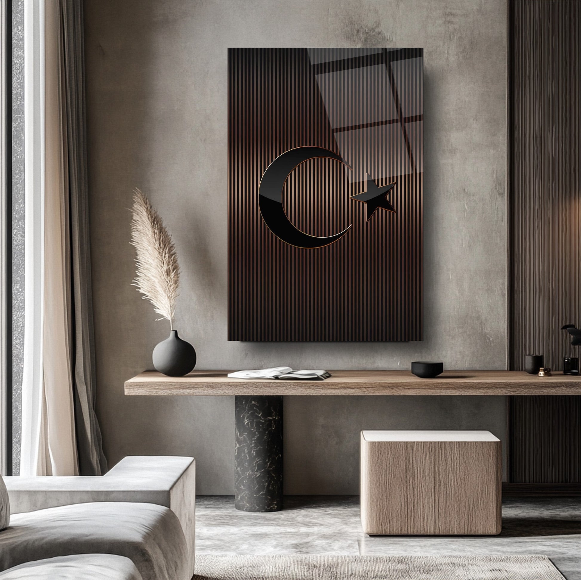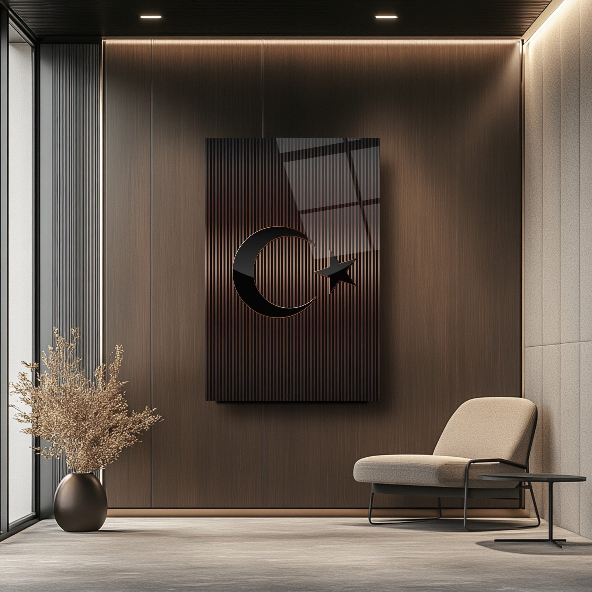 Mekânınıza prestijli bir dokunuş katın! Kahverengi tonlarındaki çizgili desen, Türk Bayrağı'nın zarif bir yorumunu sunar. Ofis ve makam odalarınızda şıklığıyla öne çıkar. UV baskı teknolojisiyle uygulanan yüksek çözünürlüklü baskı, renklerin solmasını engeller ve uzun ömürlü kullanım sağlar. Kırılmaz temperli cam yüzeyi, suya, neme ve çizilmeye karşı dayanıklıdır. Kolay montajı sayesinde hemen duvarınıza asılabilir. Evinize veya iş yerinize modern bir atmosfer kazandırmak için bu tablo mükemmel bir tercih olacaktır.