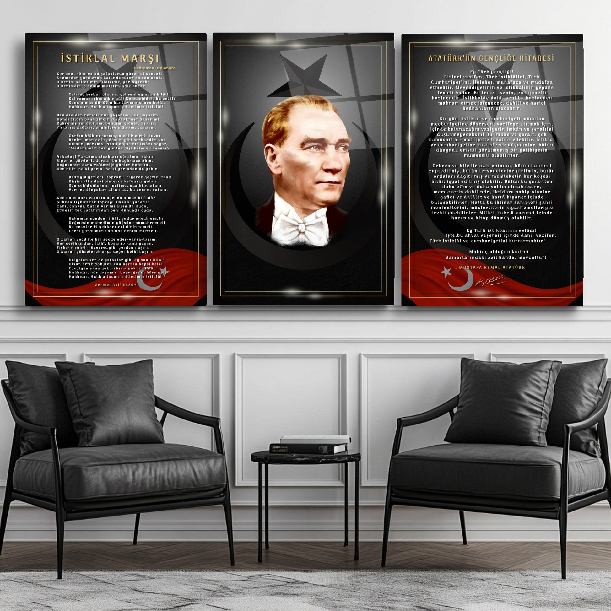 Bu set, sadece bir dekorasyon parçası olmanın ötesinde, bulunduğunuz ortama derin bir anlam katar. Her baktığınızda ay yıldızlı bayrağımızın asaletini, milli marşımızın anlam dolu dizelerini ve Büyük Önder'in vizyonunu hissedersiniz. Okul duvar dekorasyonunuzu veya ofisinizdeki makam odanızı bu anlamlı setle zenginleştirerek, çalışanlarınıza, ziyaretçilerinize ve öğrencilerinize milli bilinç aşılayın.