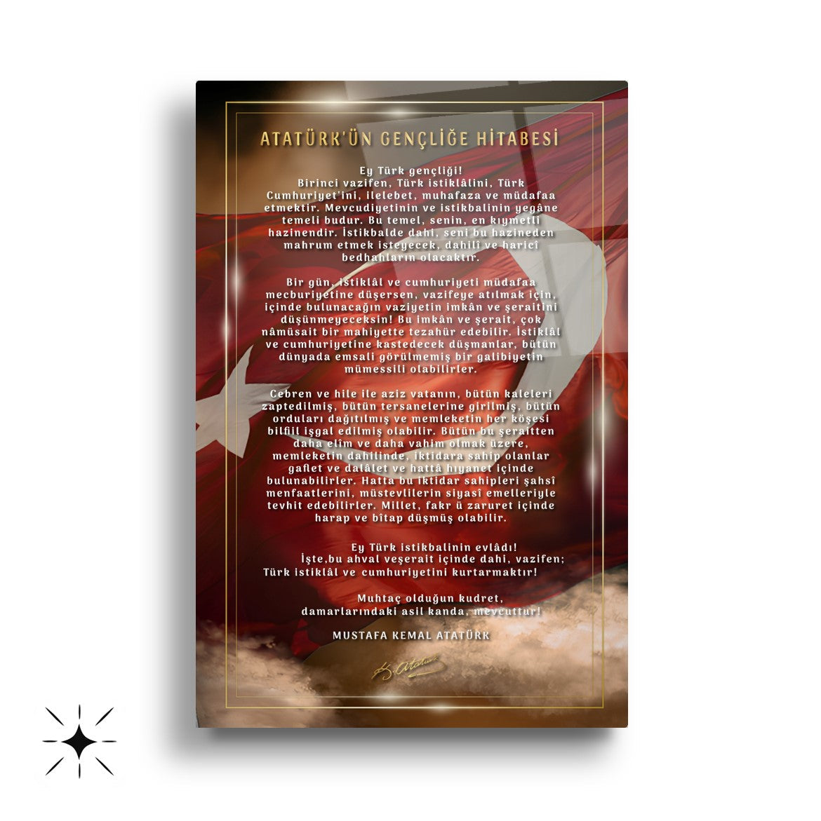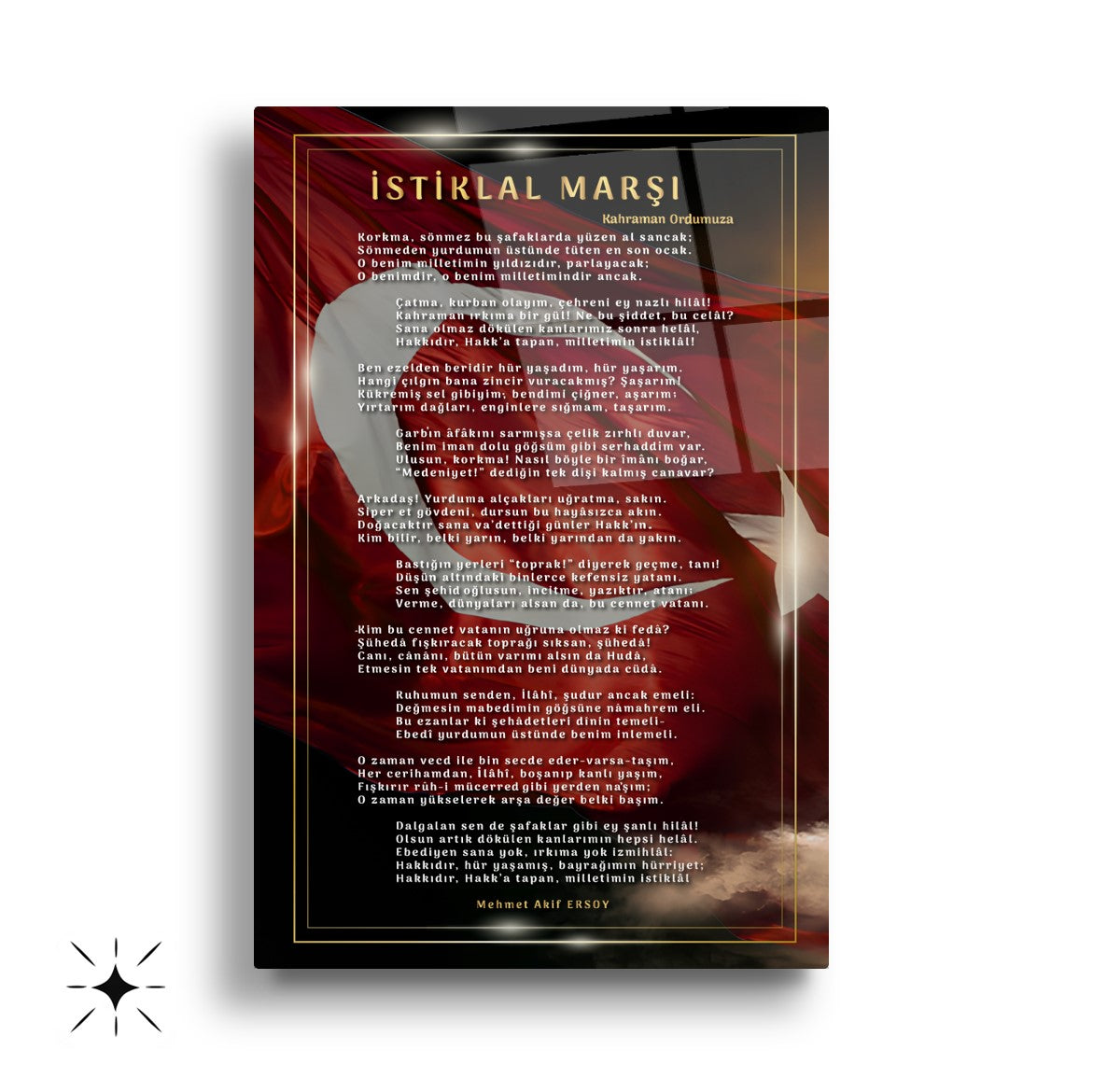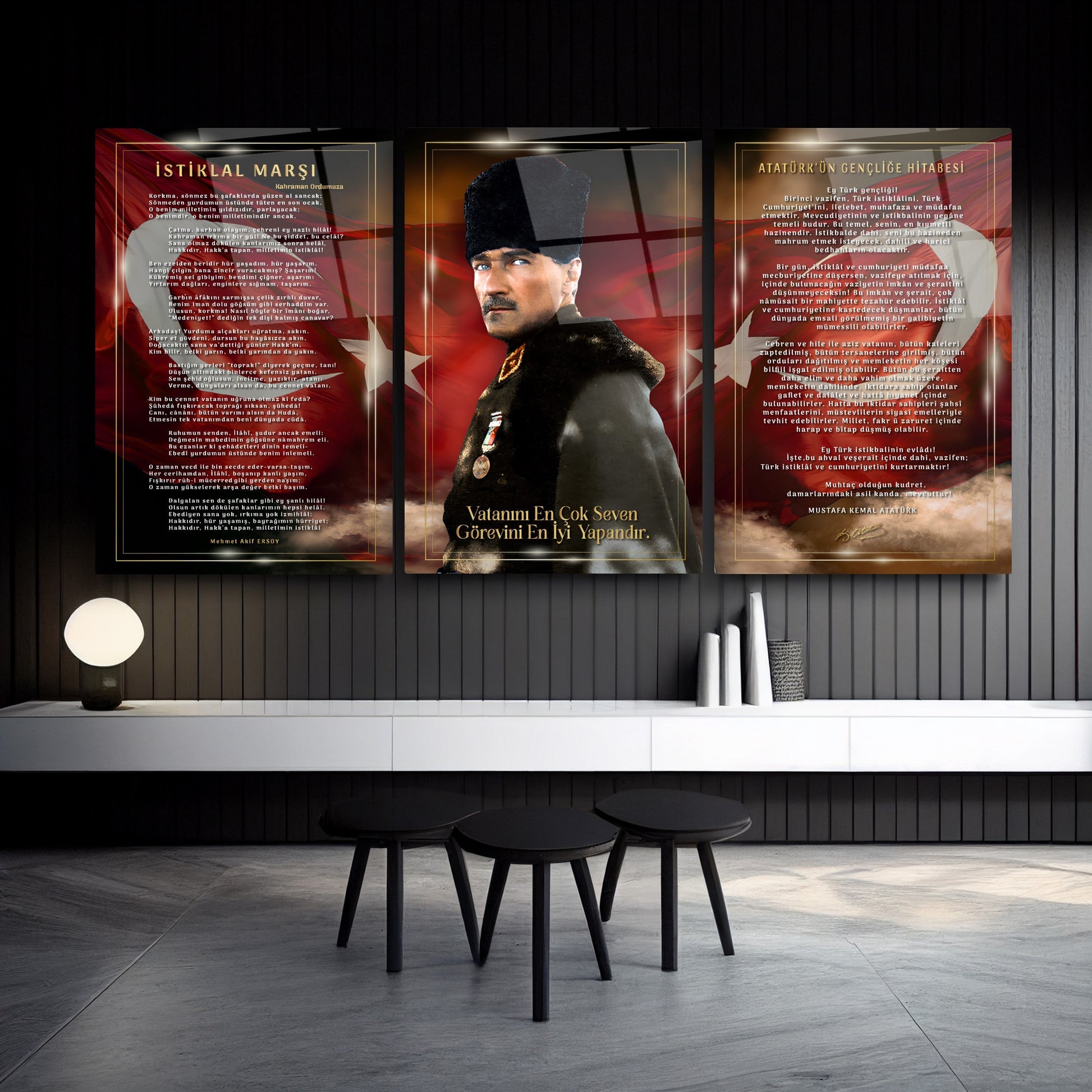 Bu özel gerçek cam tablo seti ile okullarınıza, kurumsal ofislerinize ve makam odalarınıza anlam katın. Atatürk köşesi ve kurumsal alanlar için mükemmel bir çözüm sunan bu set, İstiklal Marşı'mızın coşkusunu ve Atatürk'ün Gençliğe Hitabesi'nin yol gösteren sözlerini modern bir tasarımla birleştiriyor.