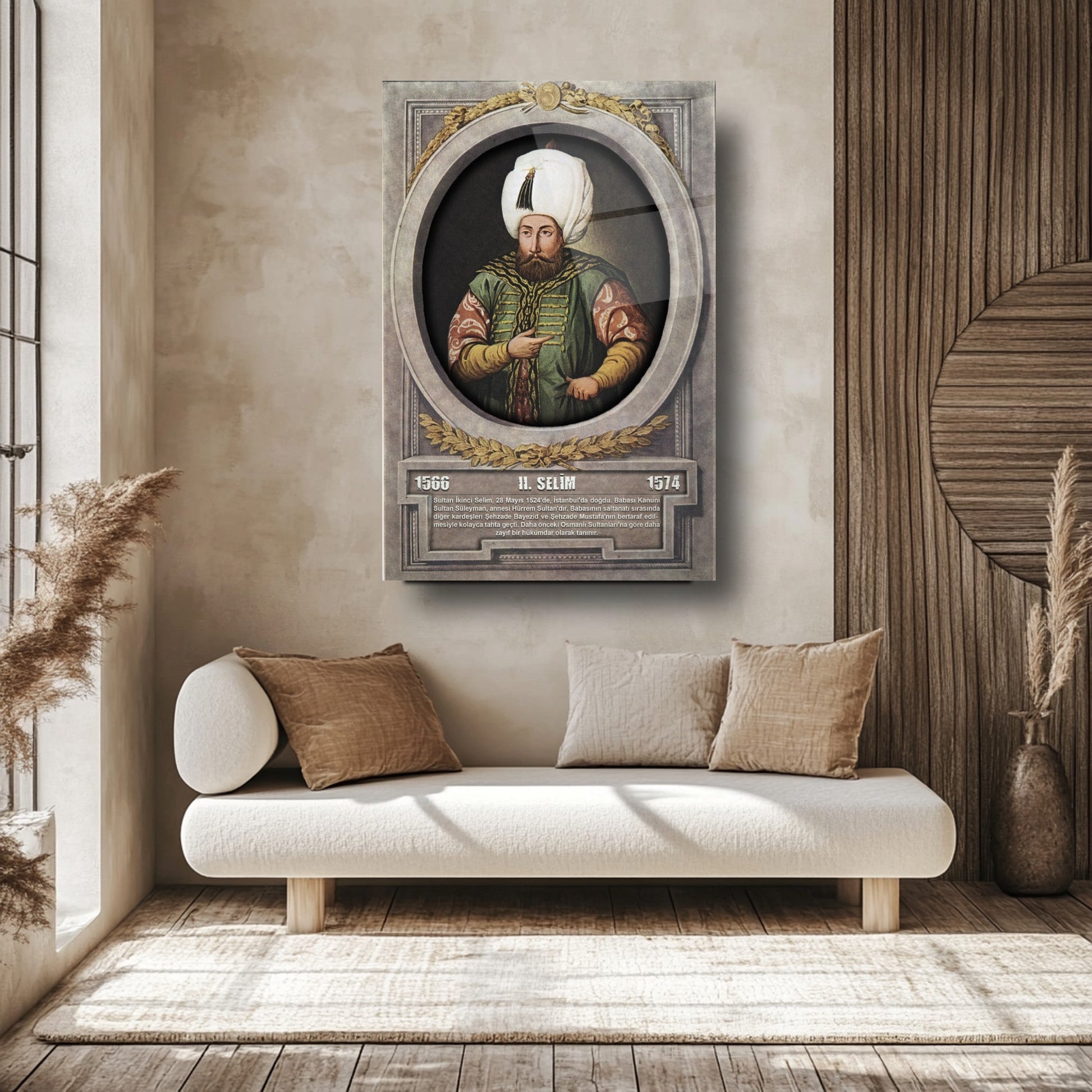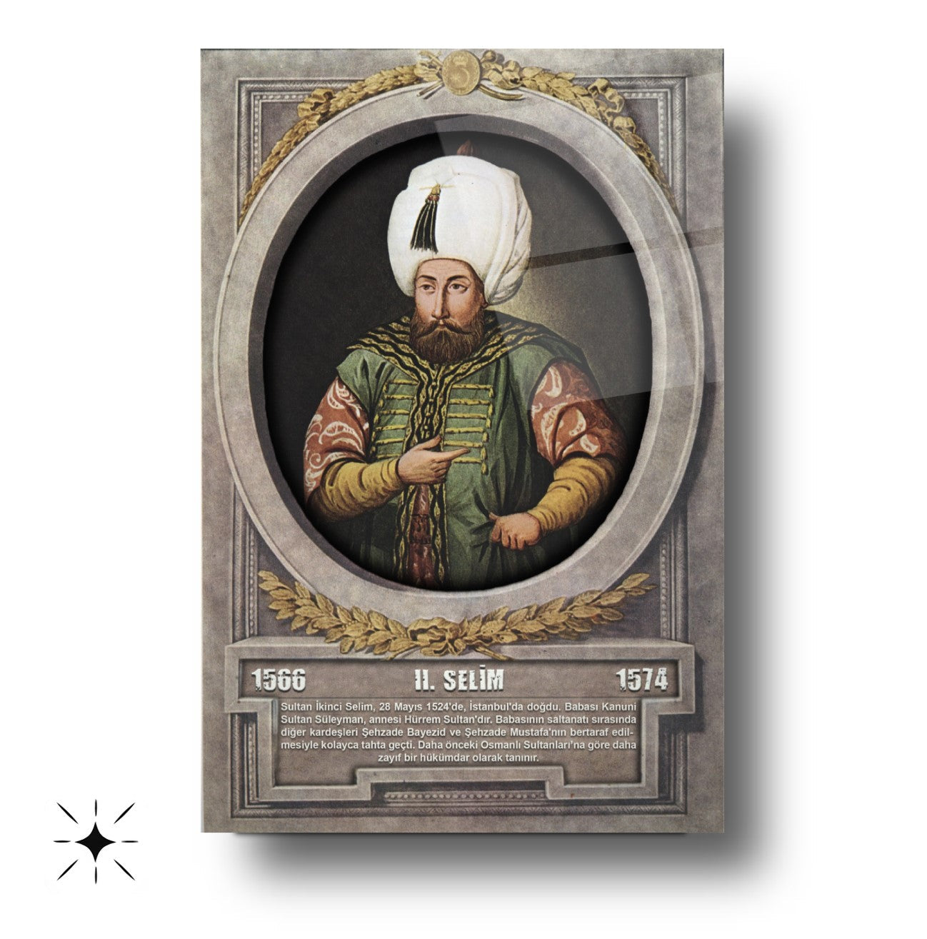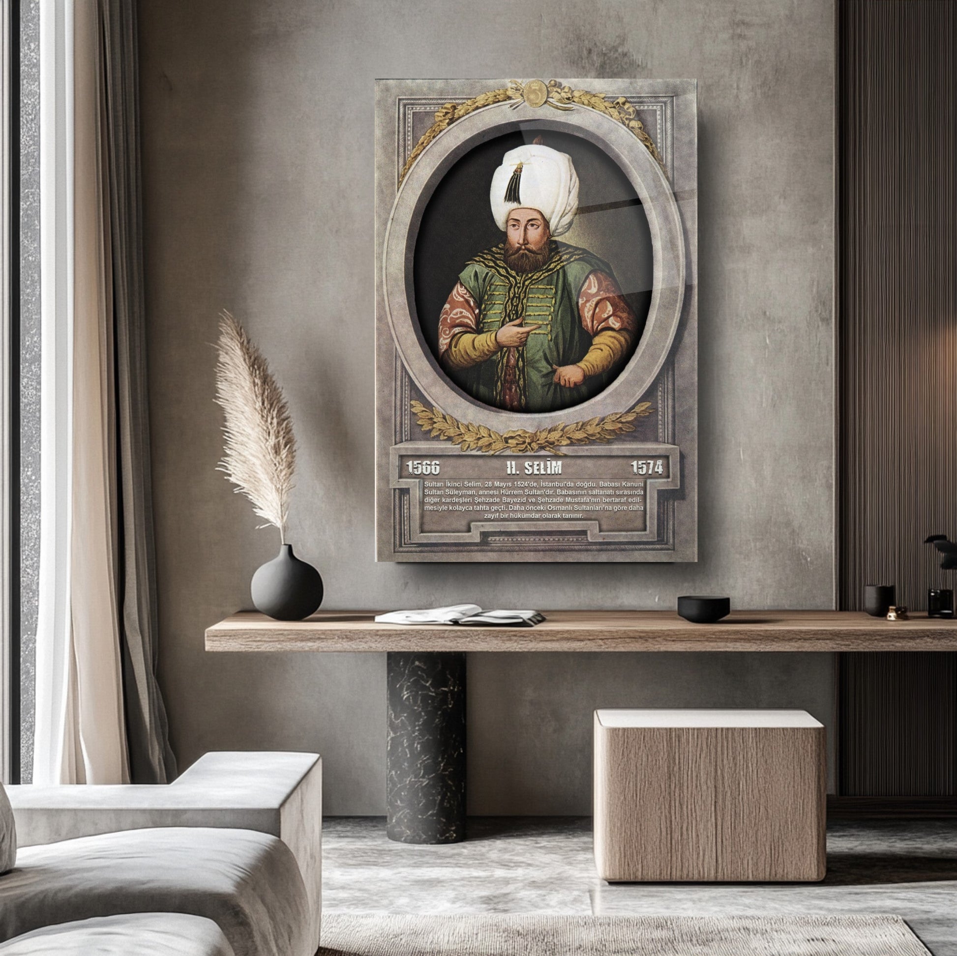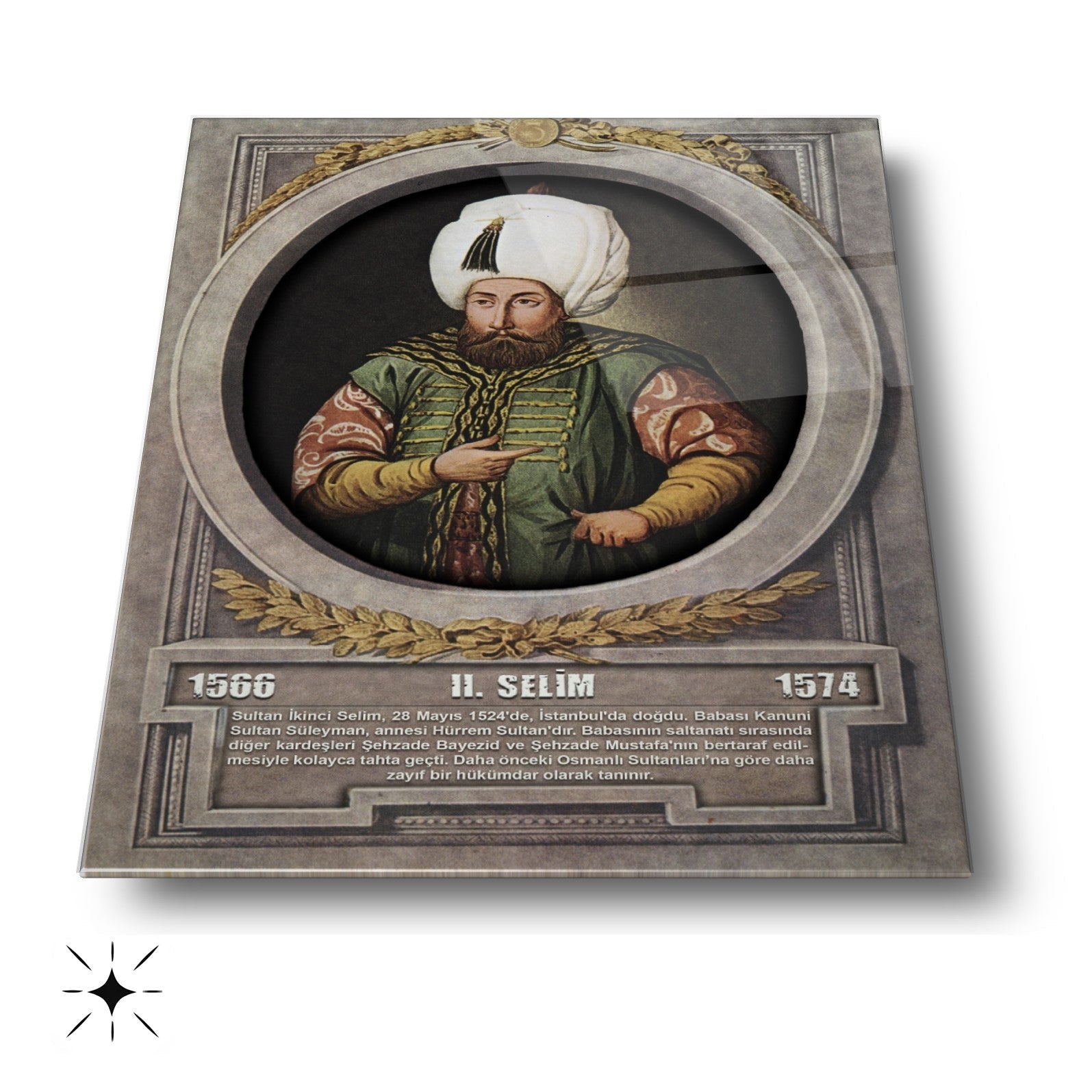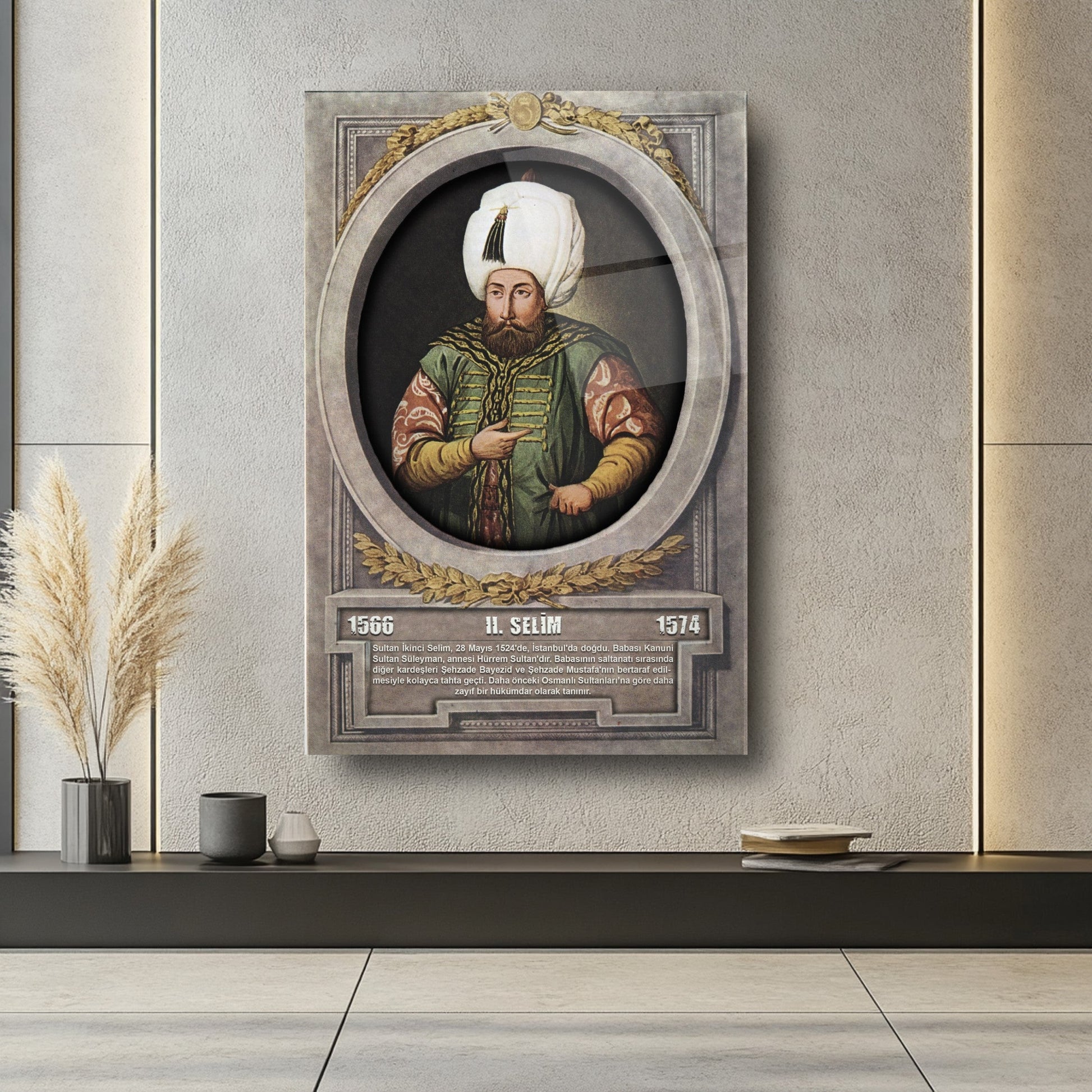 CamDeko'dan Osmanlı İmparatorluğu'nun önemli figürlerinden biriyle mekanlarınızı zenginleştiren özel bir eser: Osmanlı Padişahı II. Selim Modern Kırılmaz Cam Tablo! Kanuni'nin oğlu ve tarihimizin dikkat çeken padişahlarından II. Selim'in görkemli portresiyle okul, makam odası, ofis veya evinize tarihi bir asalet ve derinlik katın.