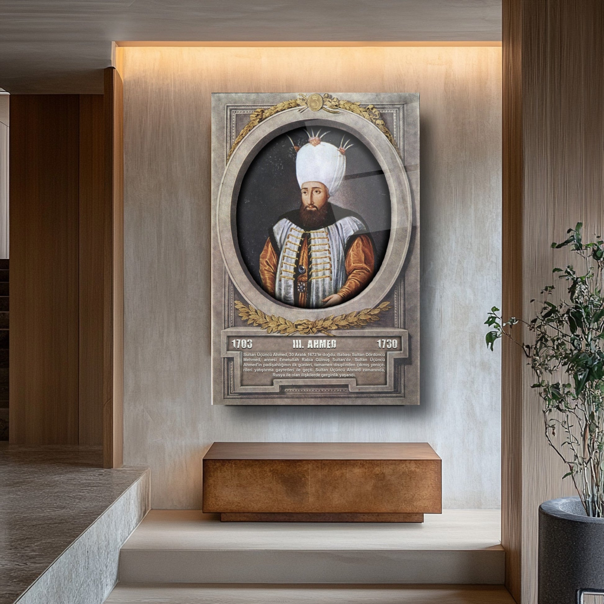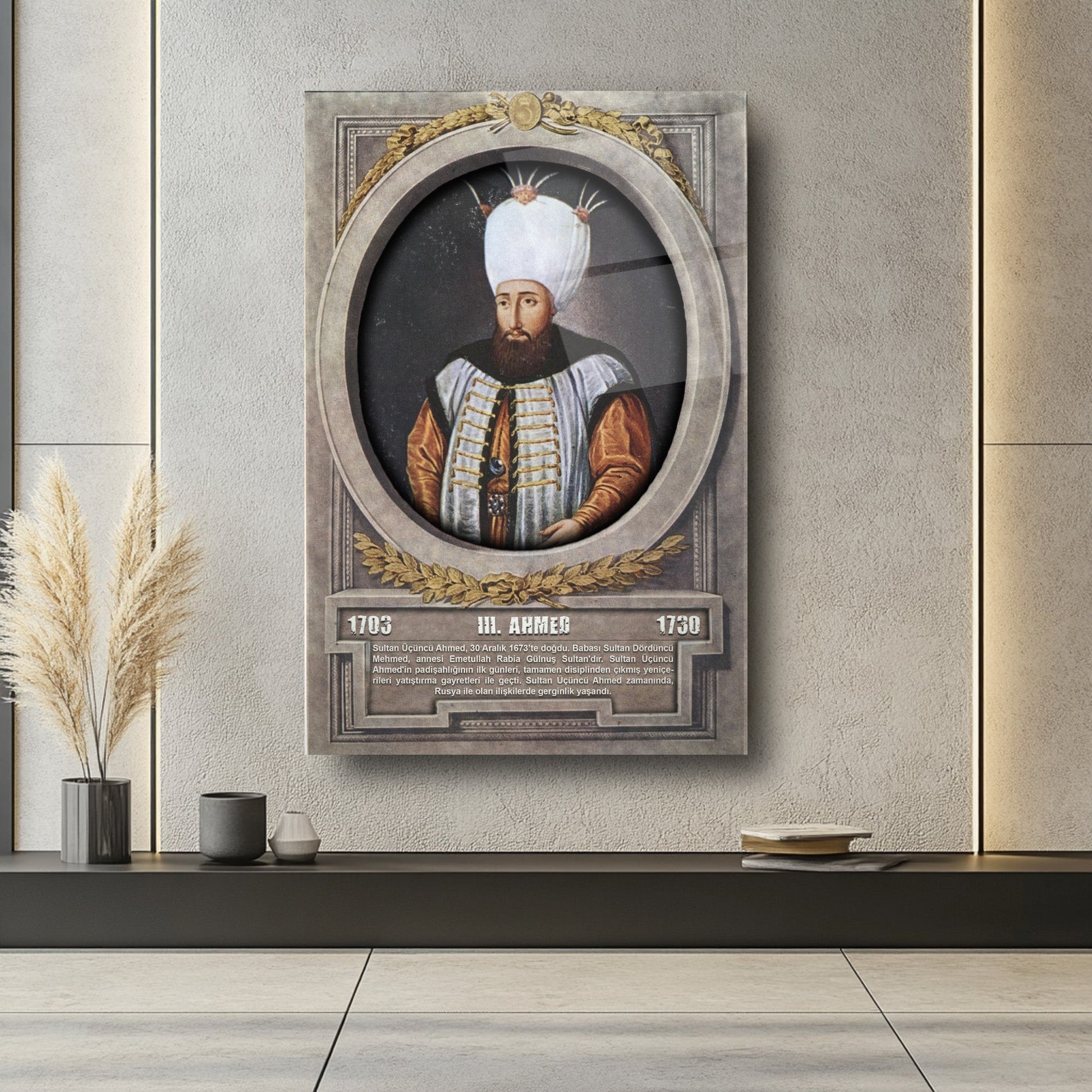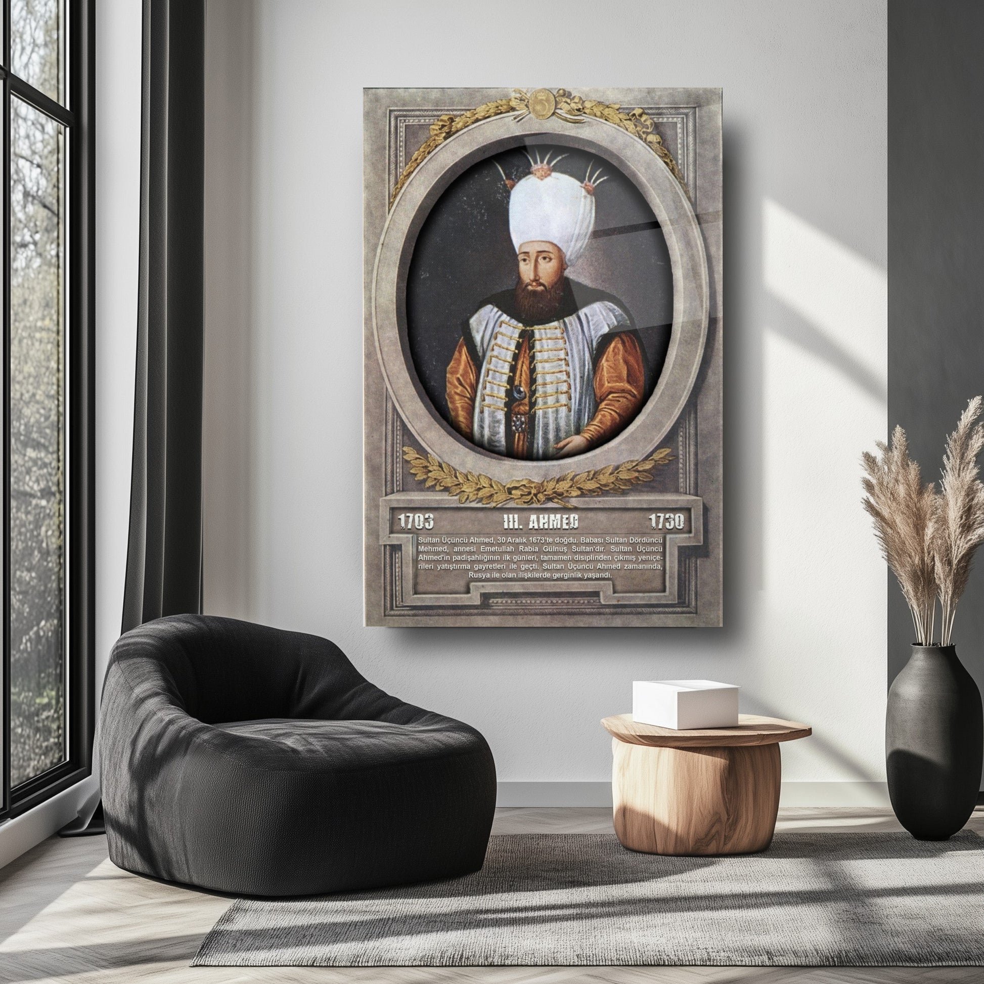 CamDeko'dan Osmanlı tarihinin en zarif dönemlerinden birinin temsilcisiyle mekanlarınızı zenginleştiren özel bir eser: Osmanlı Padişahı III. Ahmed Modern Kırılmaz Cam Tablo! Lale Devri'ne adını veren, kültürel ve sanatsal yeniliklerin mimarı III. Ahmed'in görkemli portresiyle okul, ofis veya evinize tarihi bir estetik ve ilham katın.