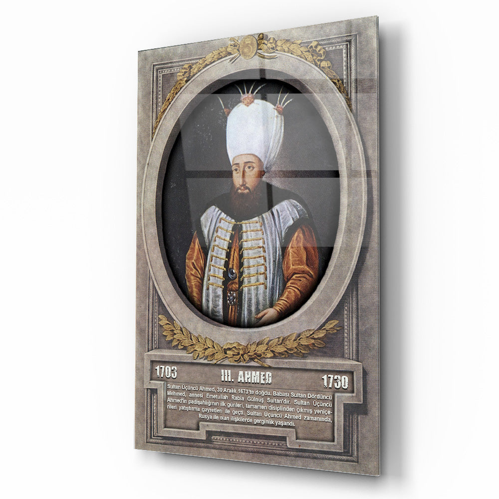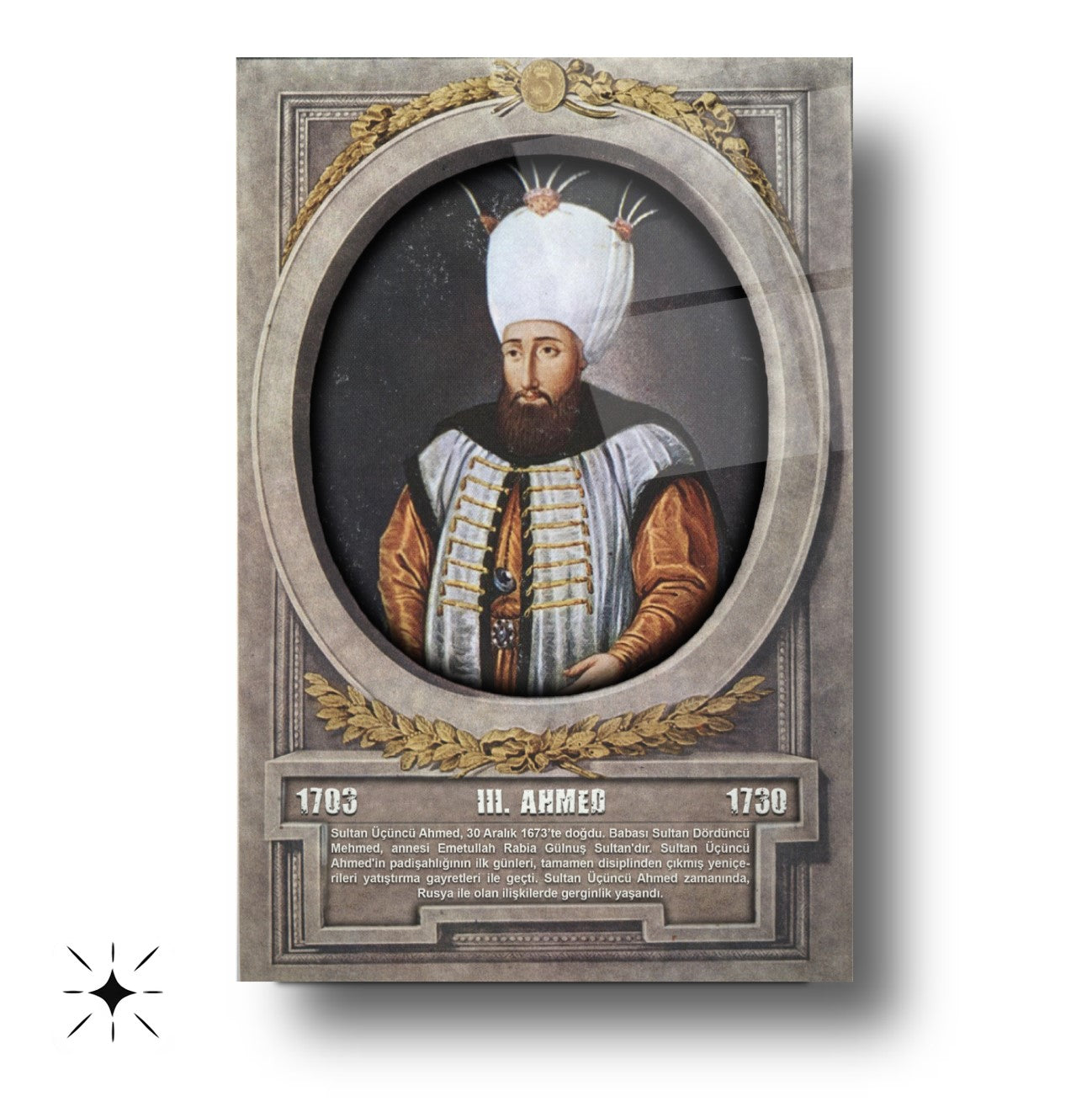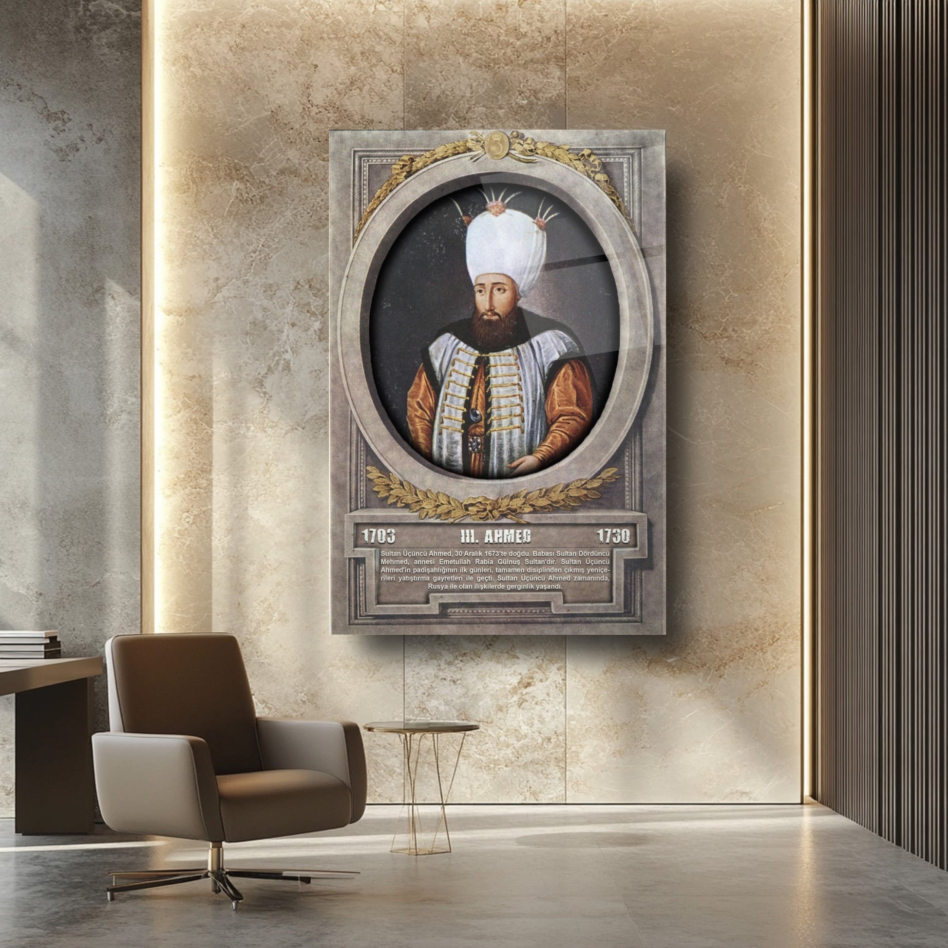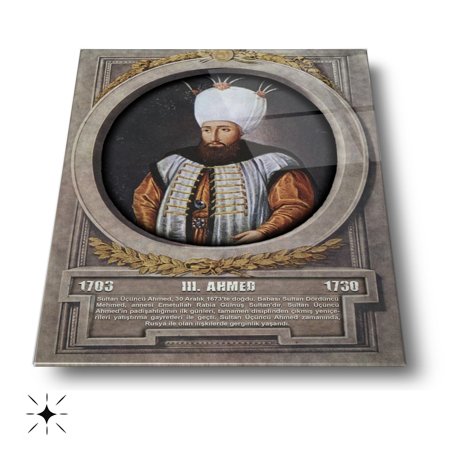 CamDeko'dan Osmanlı tarihinin en zarif dönemlerinden birinin temsilcisiyle mekanlarınızı zenginleştiren özel bir eser: Osmanlı Padişahı III. Ahmed Modern Kırılmaz Cam Tablo! Lale Devri'ne adını veren, kültürel ve sanatsal yeniliklerin mimarı III. Ahmed'in görkemli portresiyle okul, ofis veya evinize tarihi bir estetik ve ilham katın.