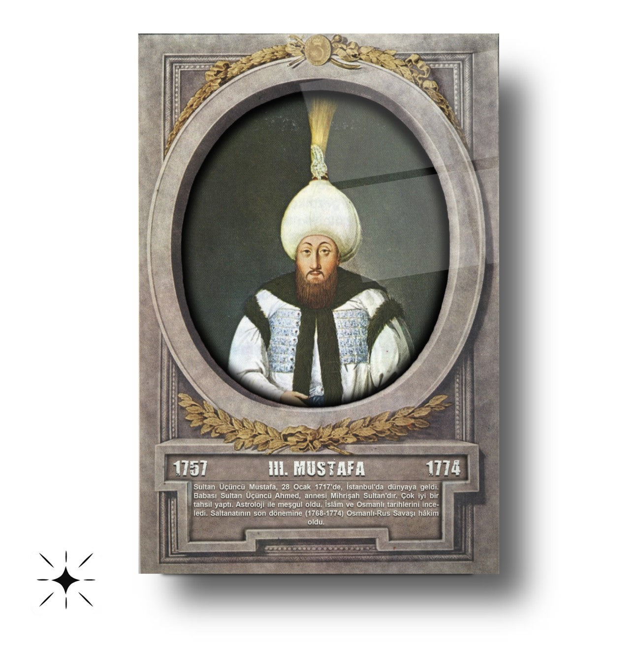 CamDeko'dan Osmanlı İmparatorluğu'nun yenilikçi padişahlarından biriyle mekanlarınızı zenginleştiren özel bir eser: Osmanlı Padişahı III. Mustafa Modern Kırılmaz Cam Tablo! Dönemindeki reform çabalarıyla bilinen III. Mustafa'nın görkemli portresiyle okul, ofis veya evinize tarihi bir derinlik ve ilham katın.