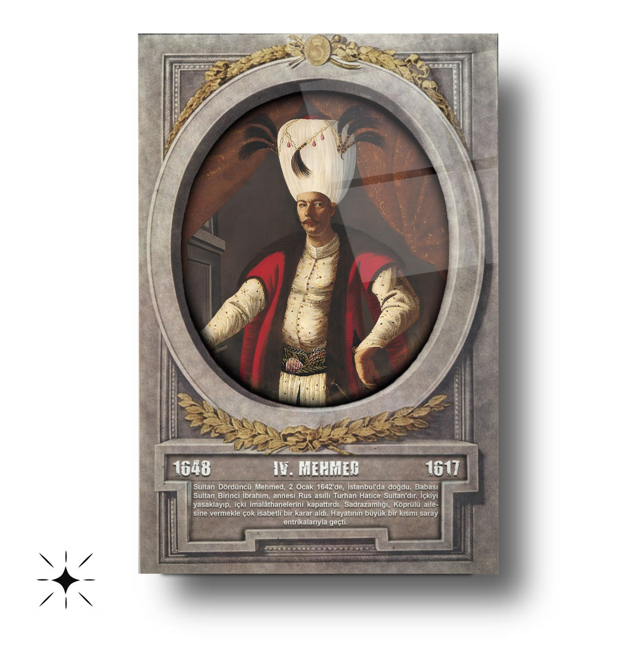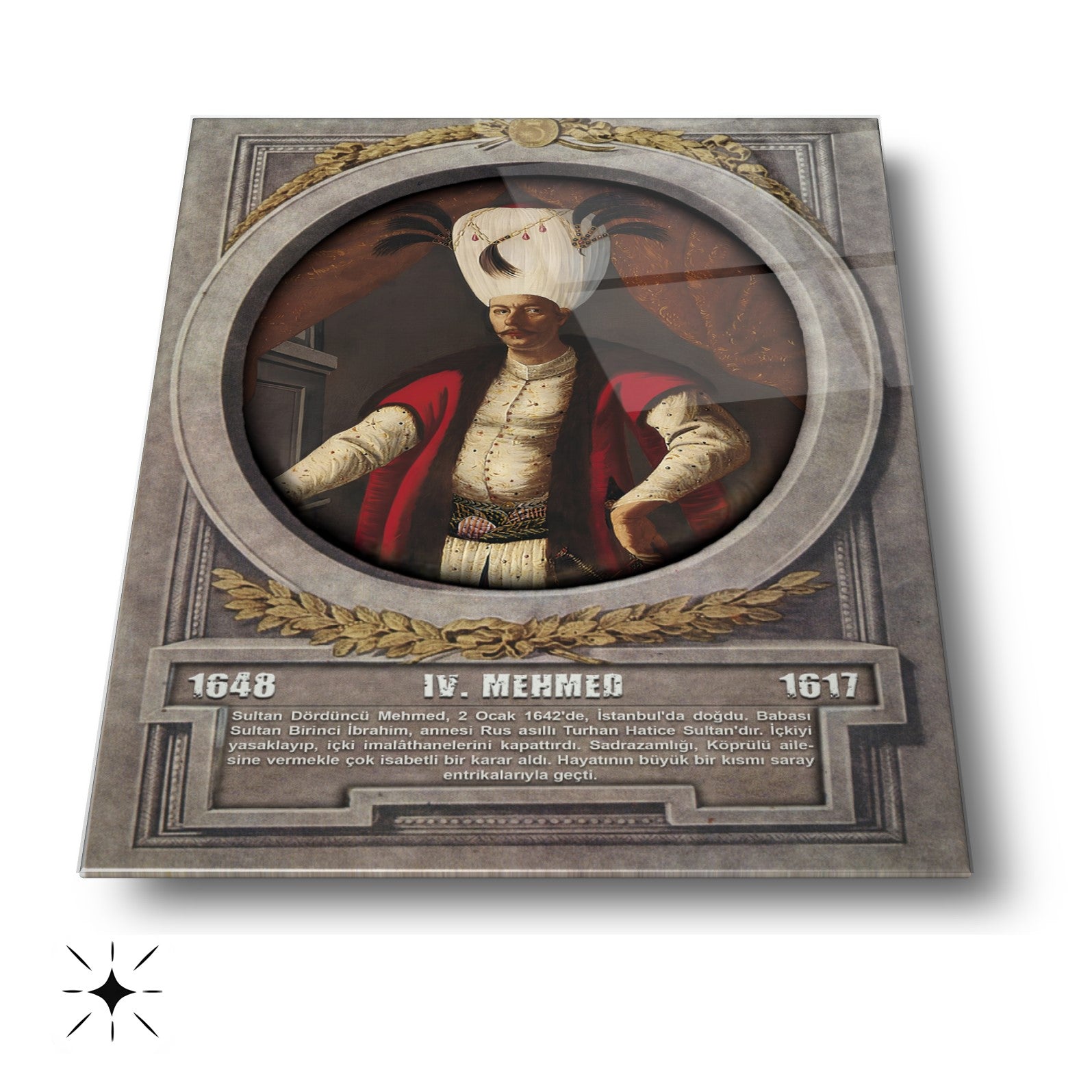 CamDeko'dan Osmanlı İmparatorluğu'nun önemli şahsiyetlerinden biriyle mekanlarınızı zenginleştiren özel bir eser: Osmanlı Padişahı IV. Mehmed Modern Kırılmaz Cam Tablo! Avcılık tutkusu ve dönemindeki önemli olaylarla bilinen IV. Mehmed'in görkemli portresiyle okul, ofis veya evinize tarihi bir derinlik ve ilham katın.