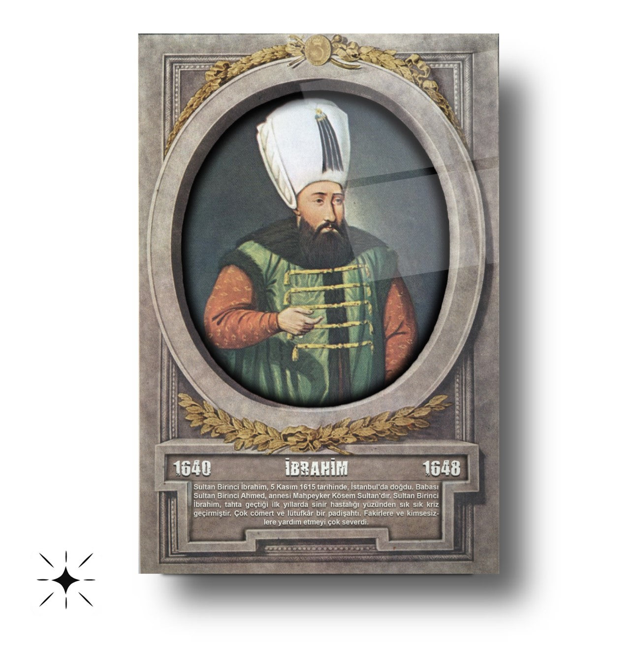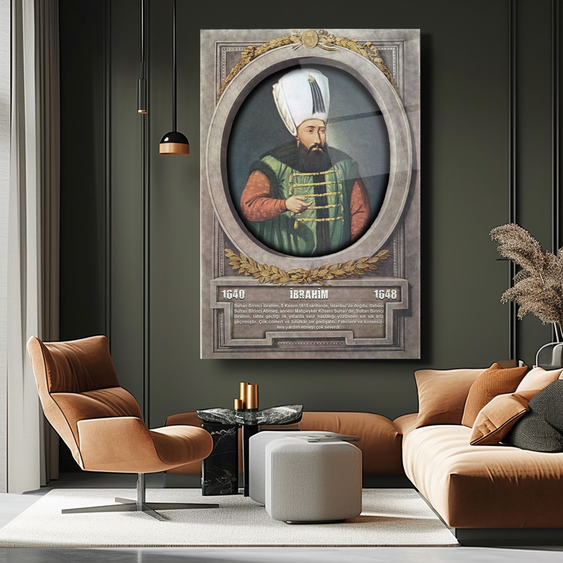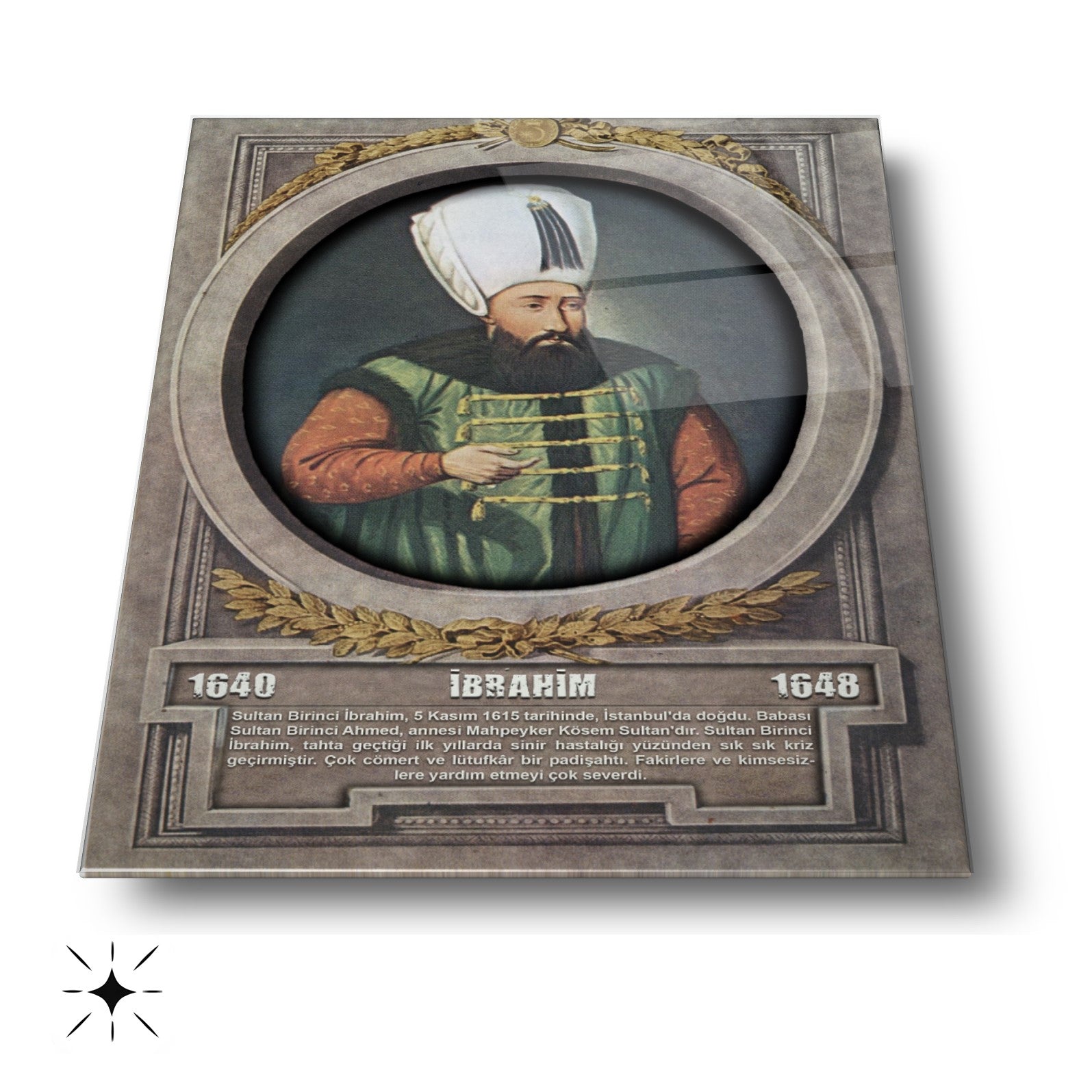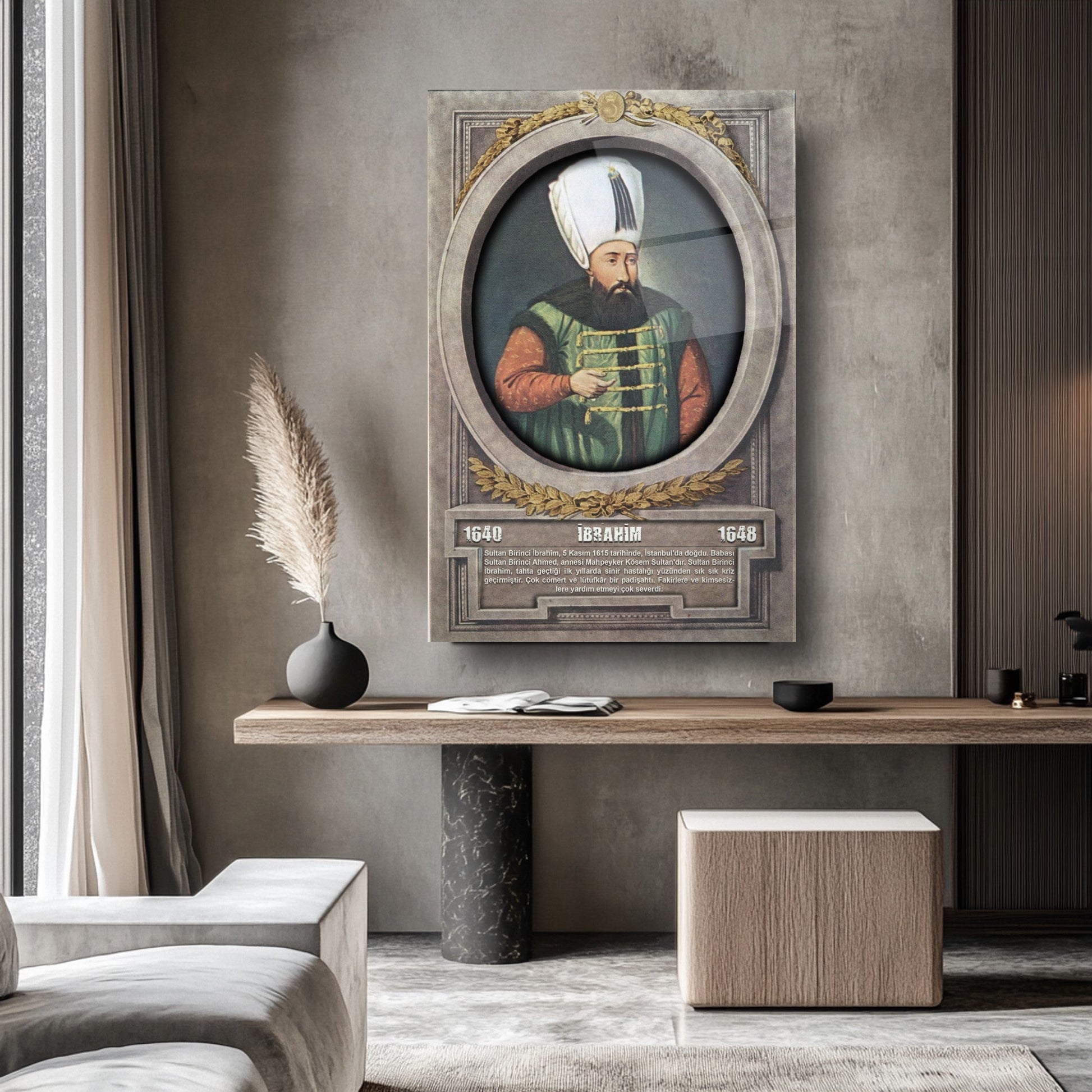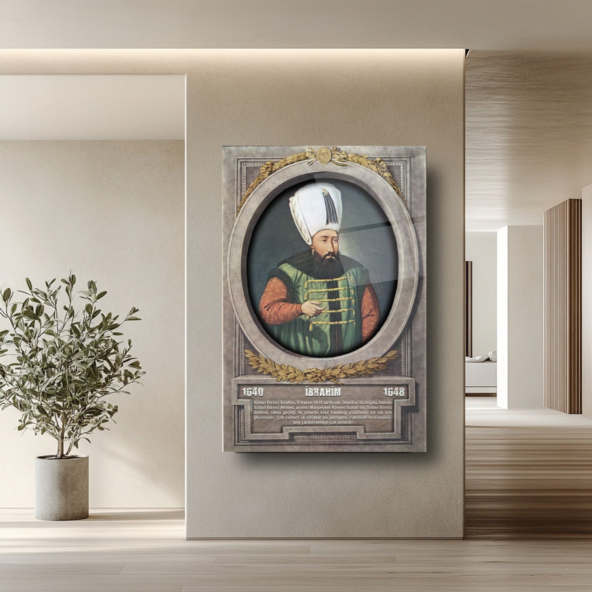 CamDeko'dan Osmanlı İmparatorluğu'nun önemli şahsiyetlerinden biriyle mekanlarınızı zenginleştiren özel bir eser: Osmanlı Padişahı İbrahim Modern Kırılmaz Cam Tablo! Döneminin karmaşık atmosferini yansıtan Sultan İbrahim'in portresiyle okul, makam odası, ofis veya evinize tarihi bir derinlik ve estetik katın.