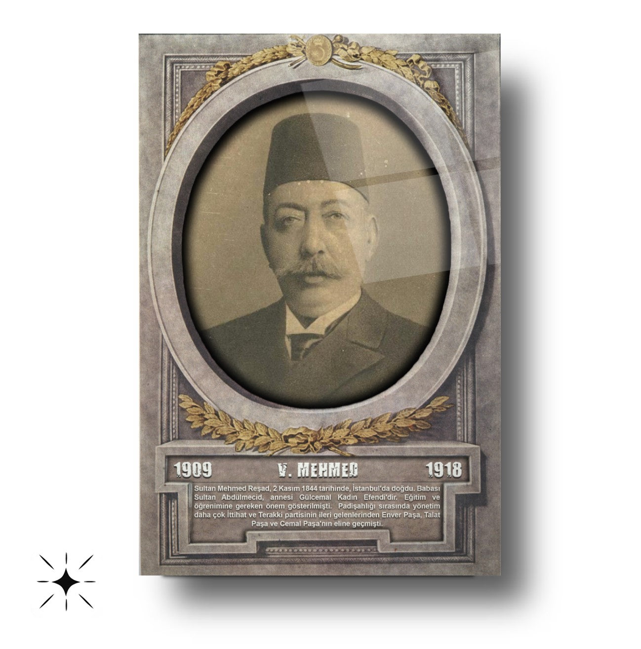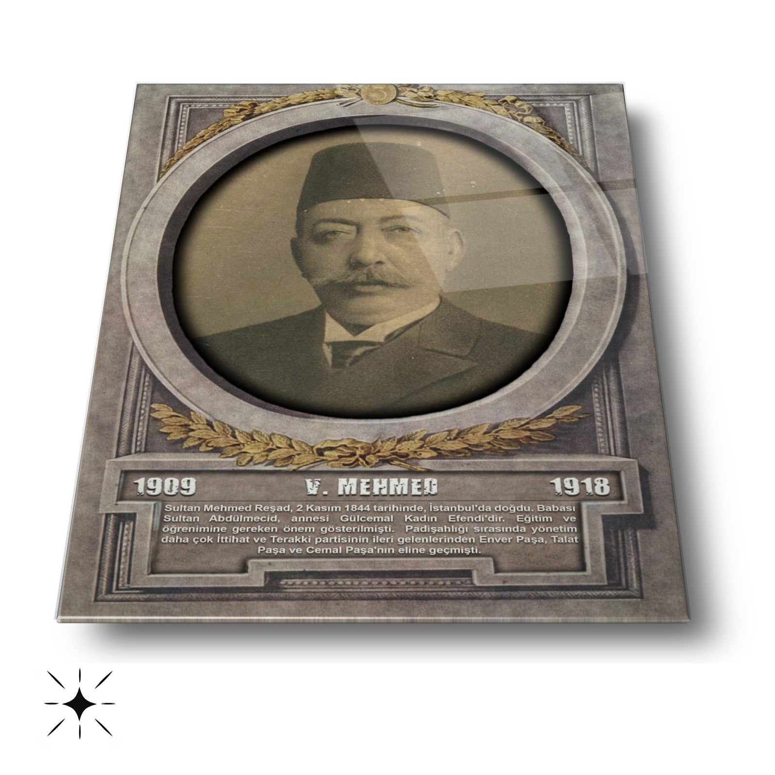CamDeko'dan Osmanlı İmparatorluğu'nun son dönem padişahlarından biriyle mekanlarınızı zenginleştiren özel bir eser: Osmanlı Padişahı Sultan Mehmed Reşad Modern Kırılmaz Temperli Cam Tablo! Zorlu bir döneme tanıklık eden Sultan Mehmed Reşad'ın görkemli portresiyle okul, makam odası, ofis veya evinize tarihi bir derinlik ve ilham katın.