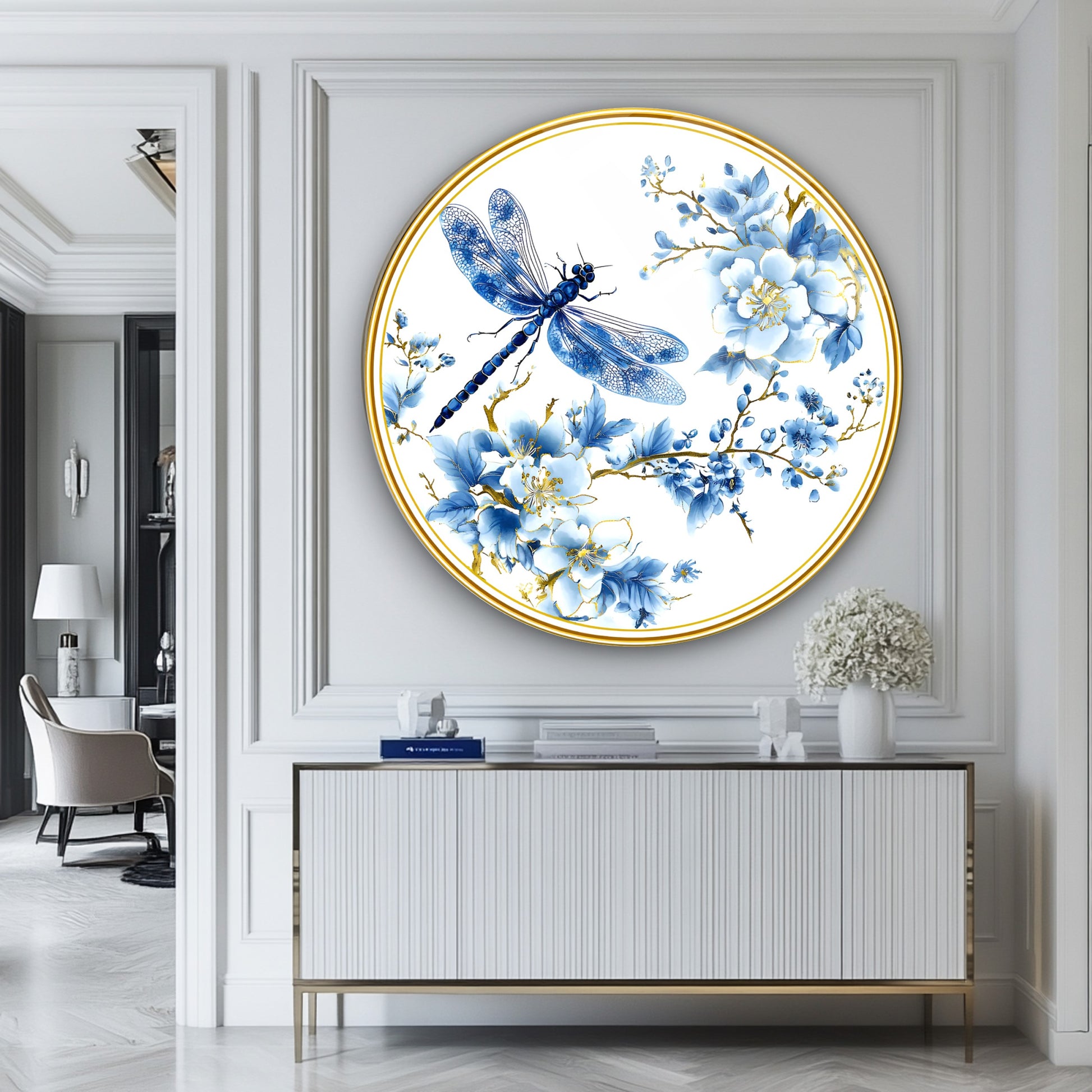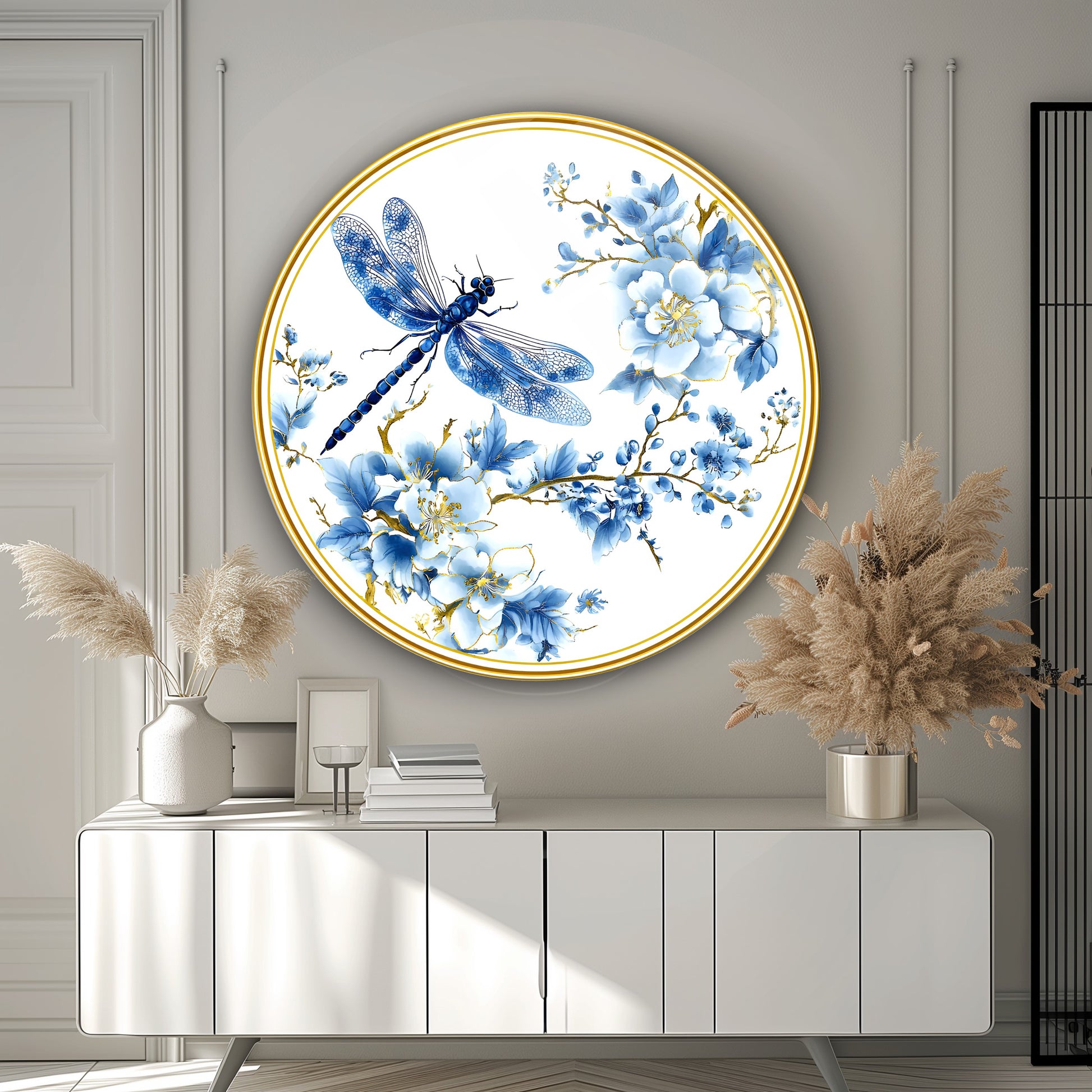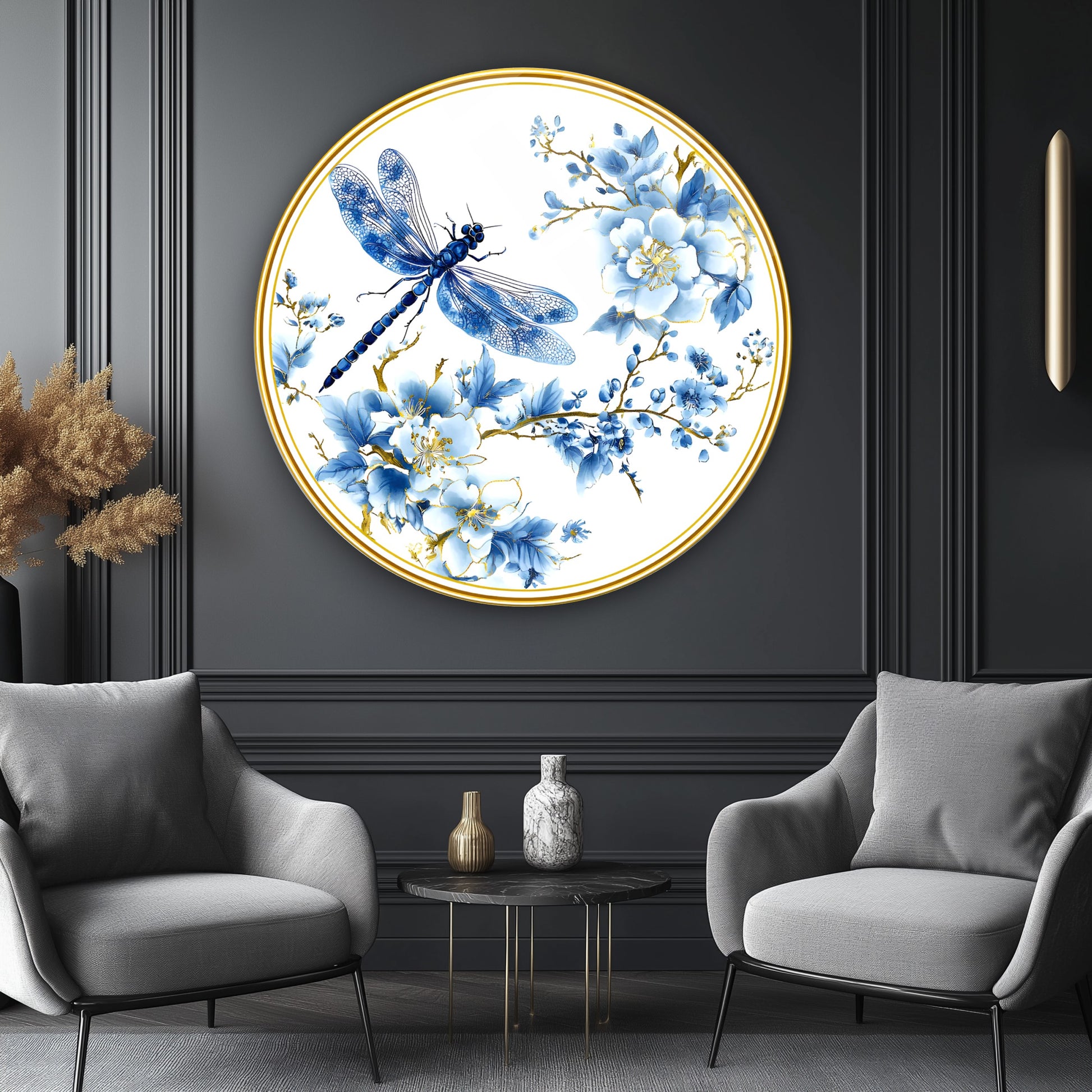 Mavi Çiçekler ve Yusufcuk Yuvarlak Cam Tablo
