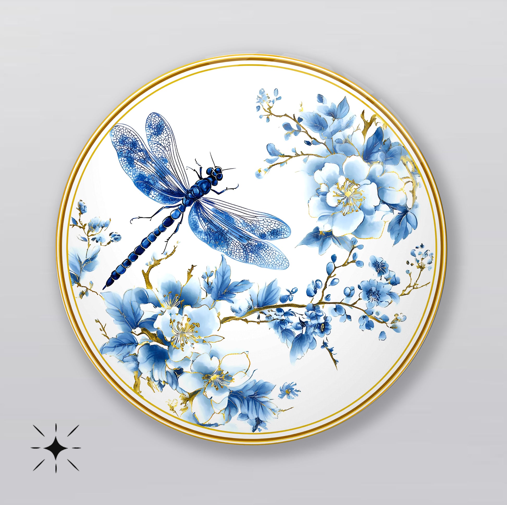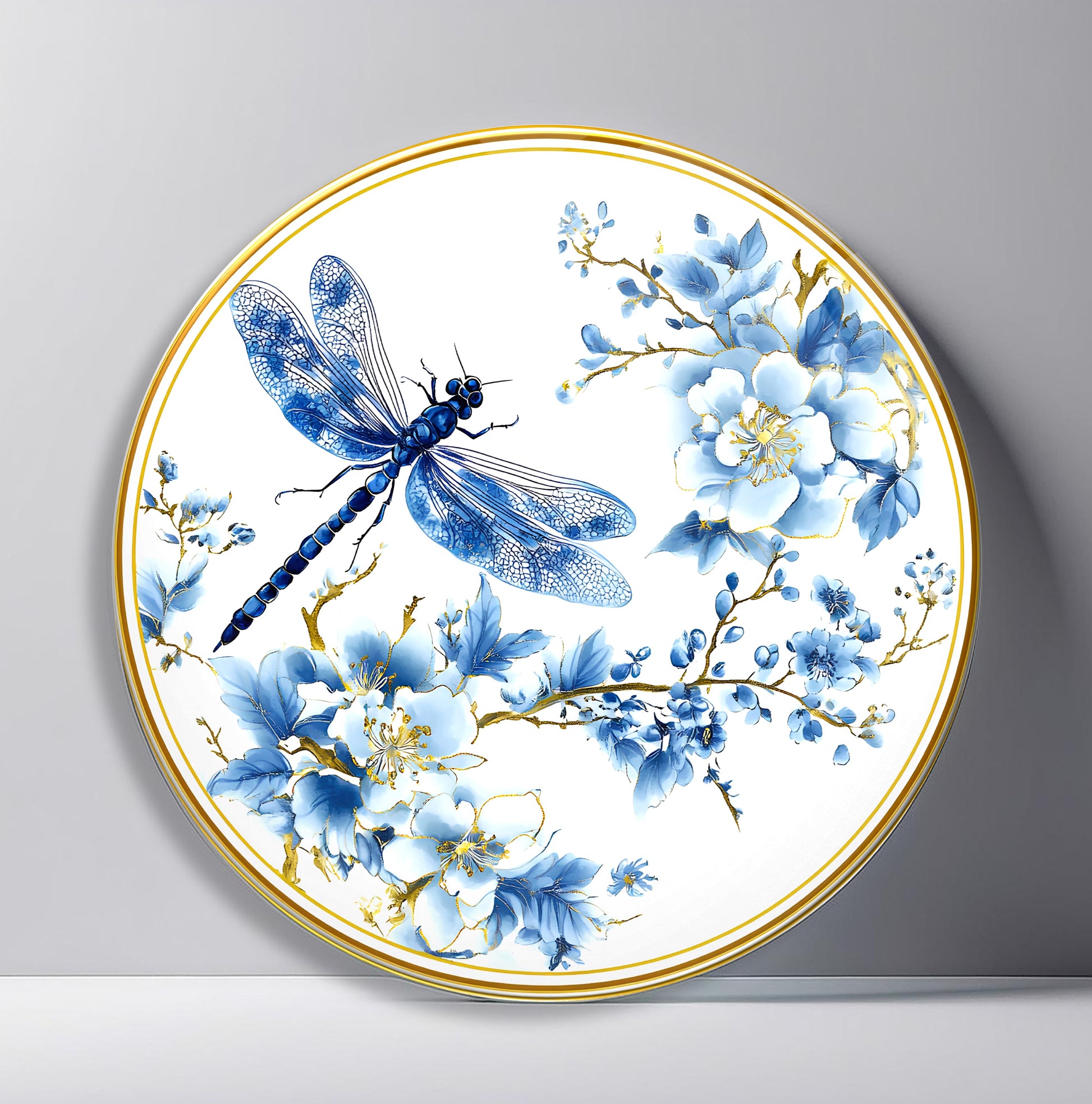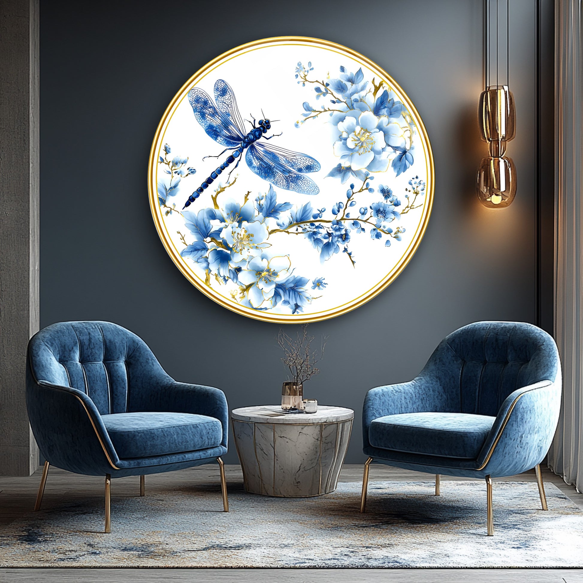 Mavi Çiçekler ve Yusufcuk Yuvarlak Cam Tablo