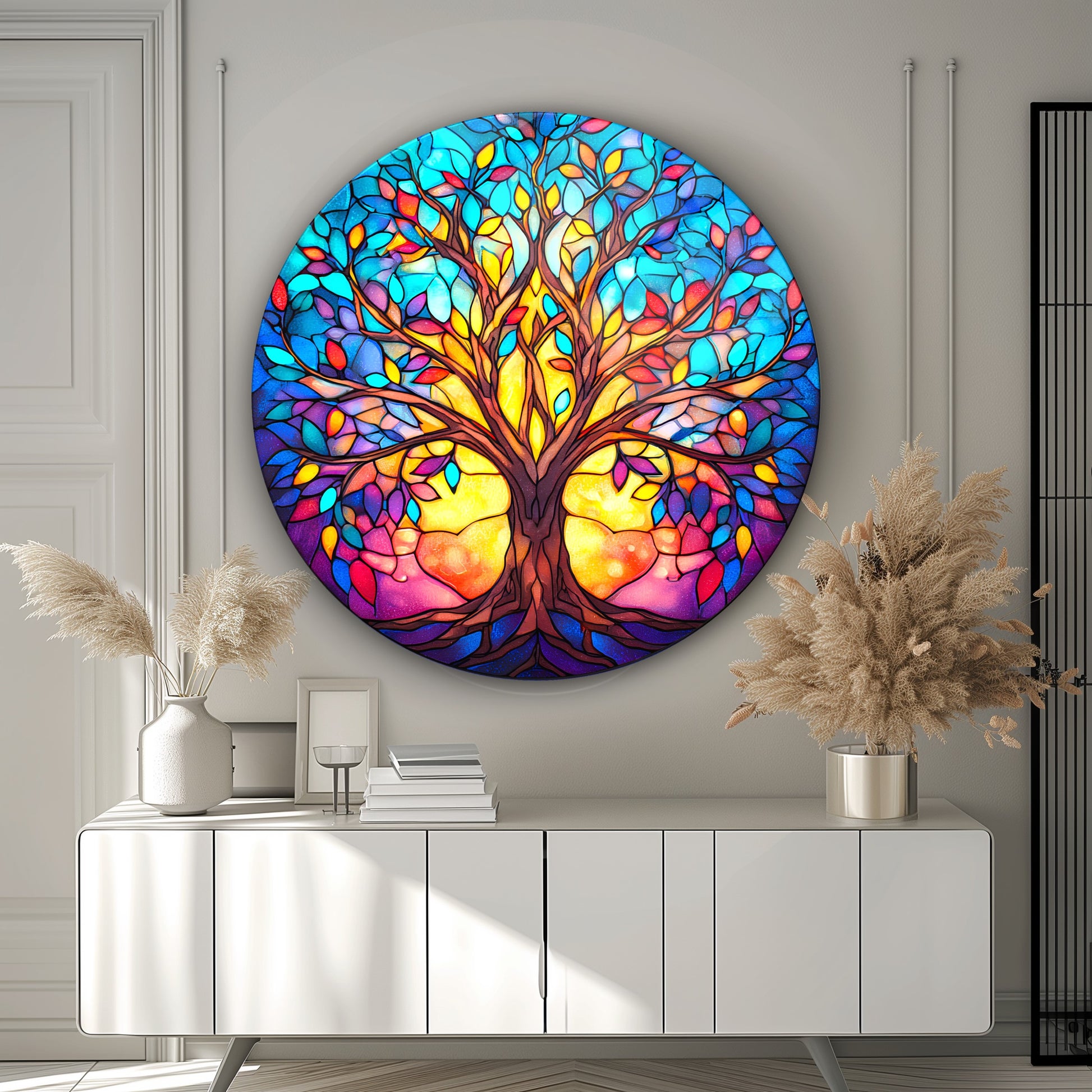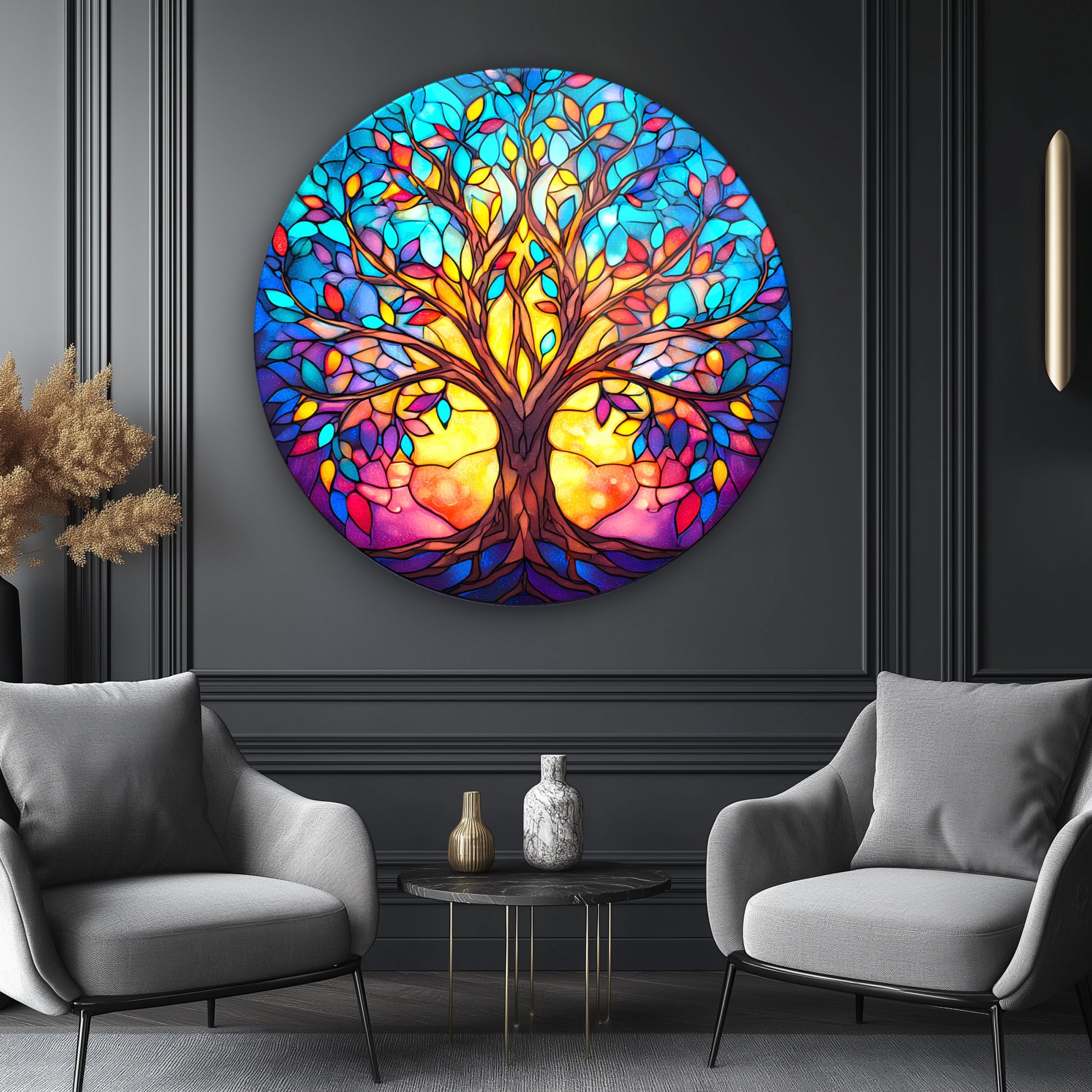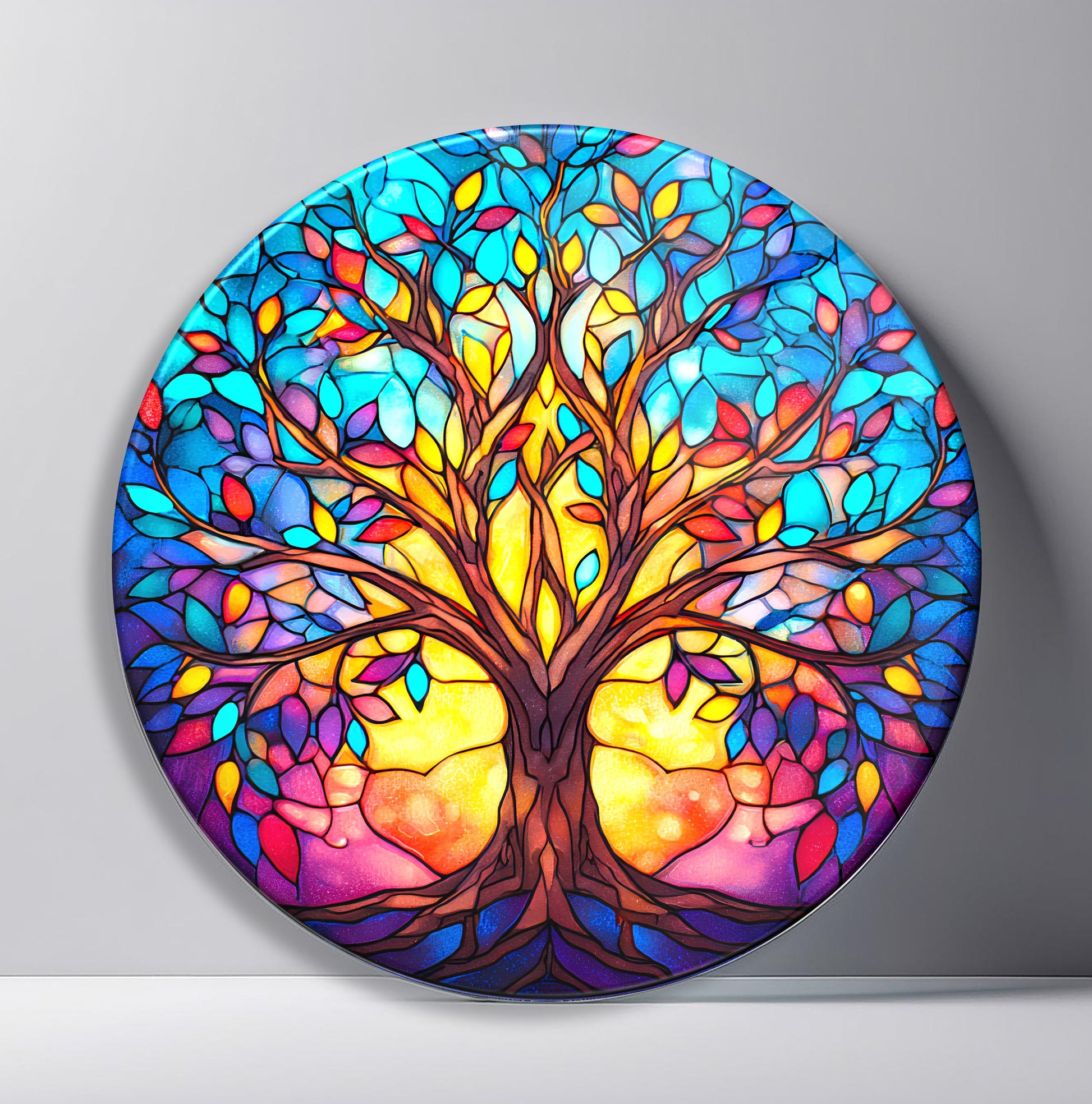 Renkli Hayat Ağacı Yuvarlak Cam Tablo