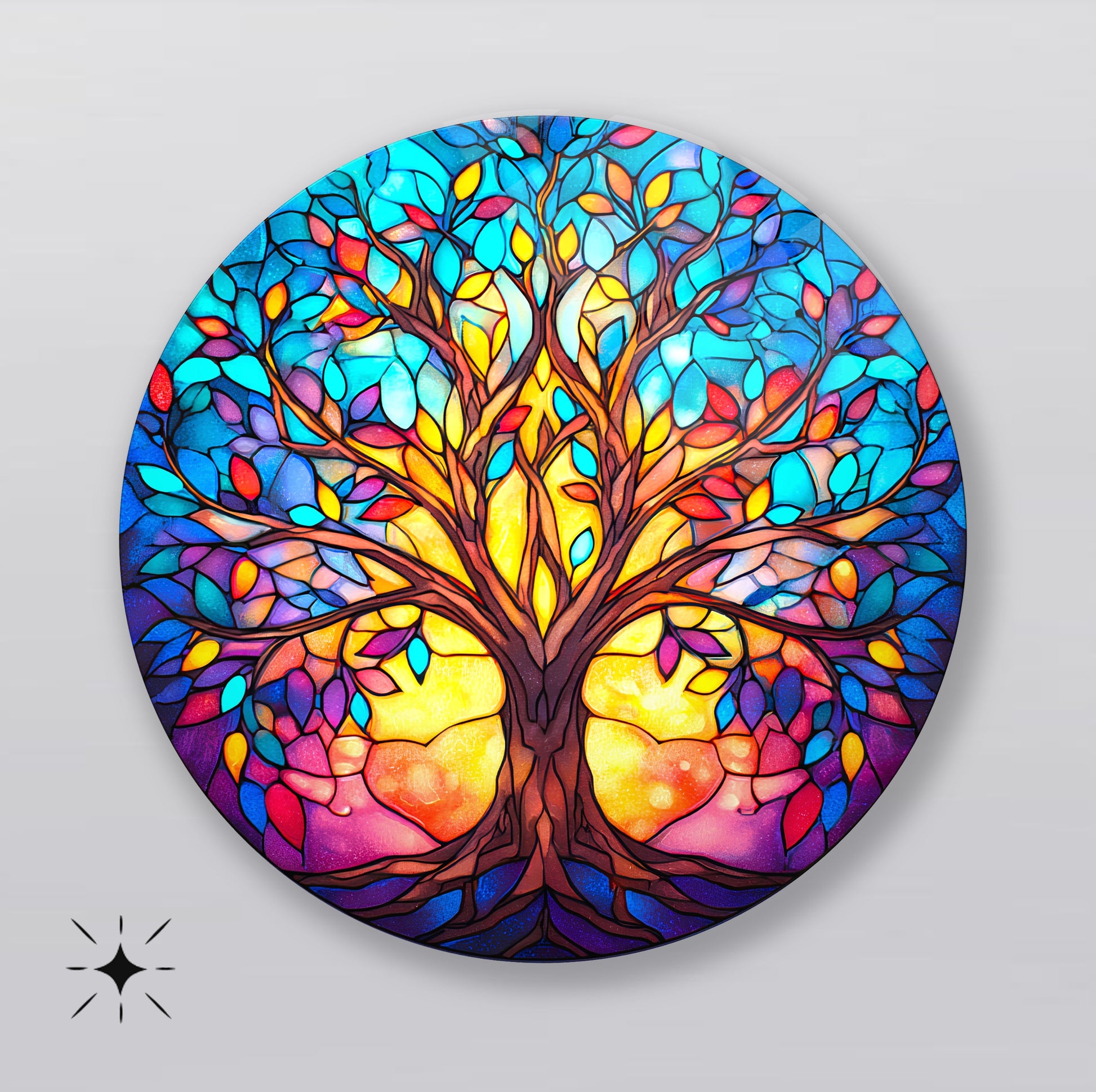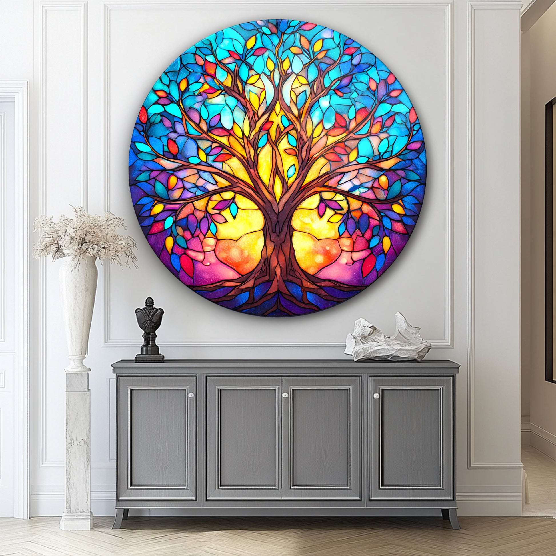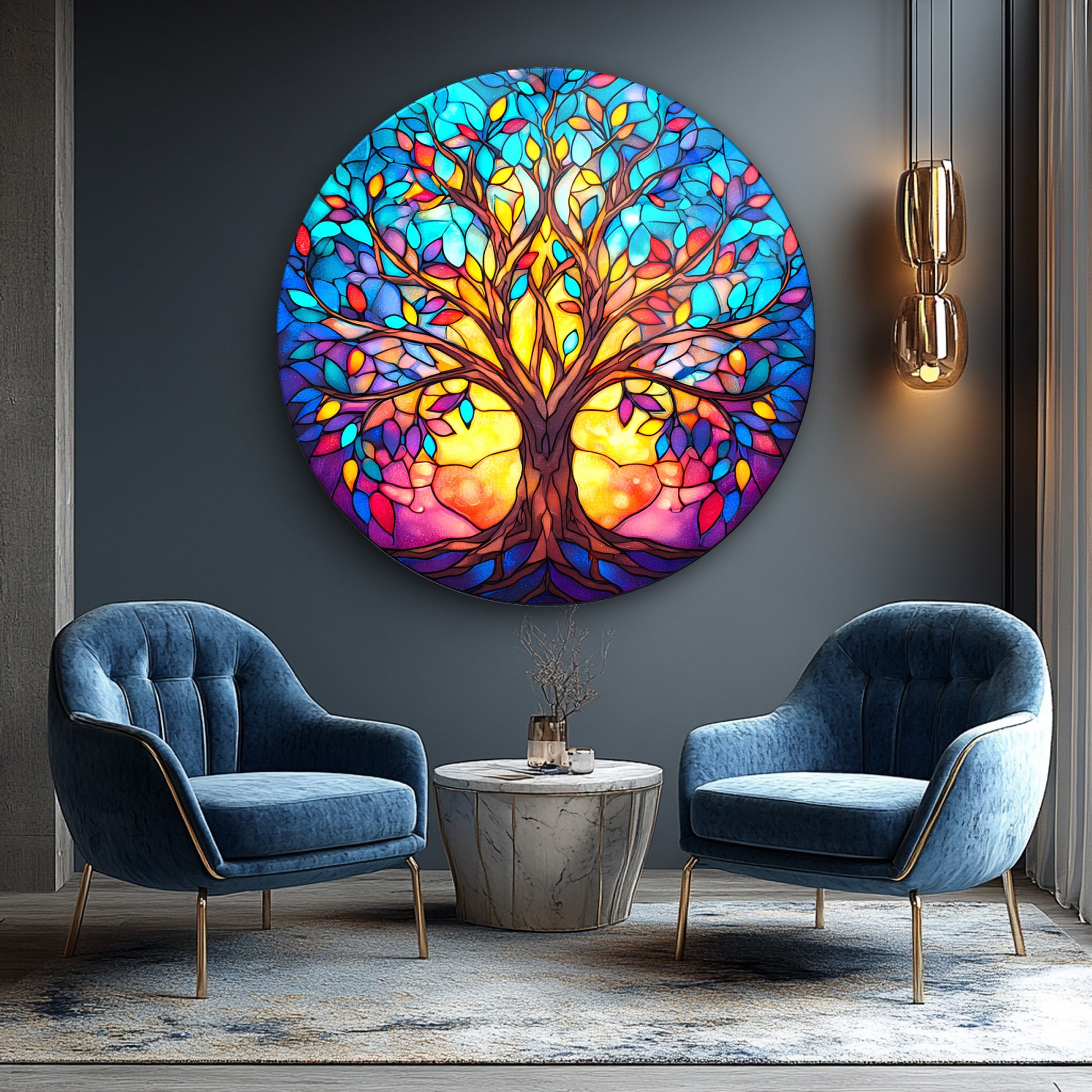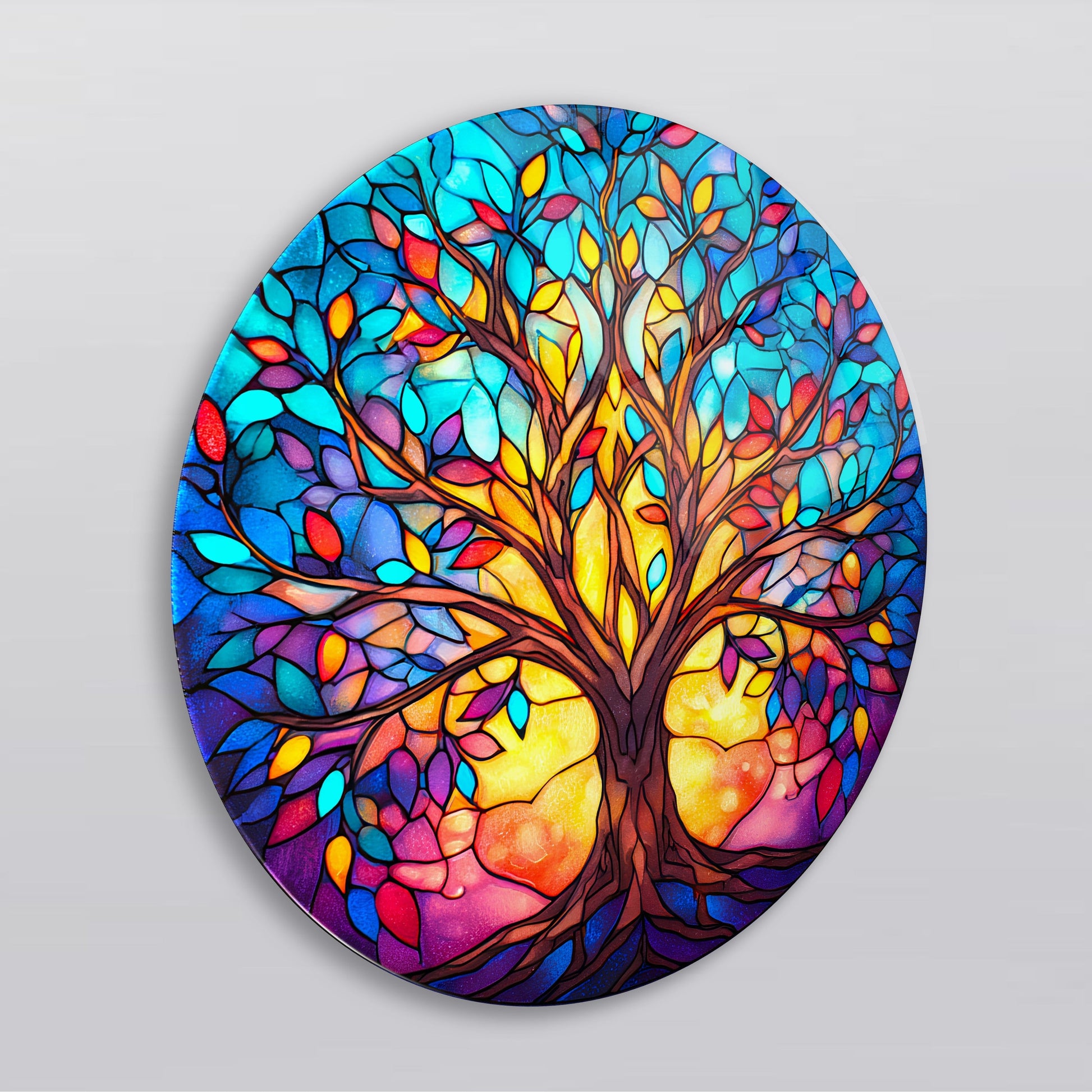 Renkli Hayat Ağacı Yuvarlak Cam Tablo