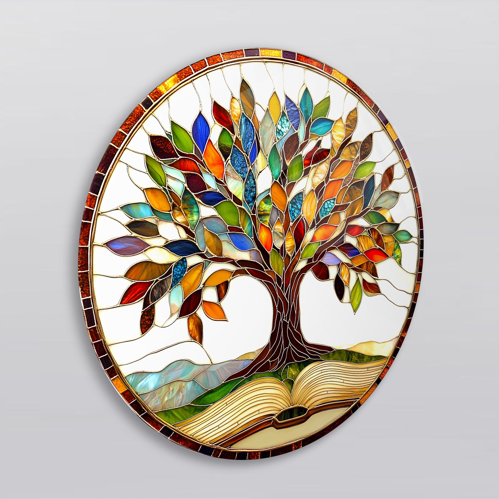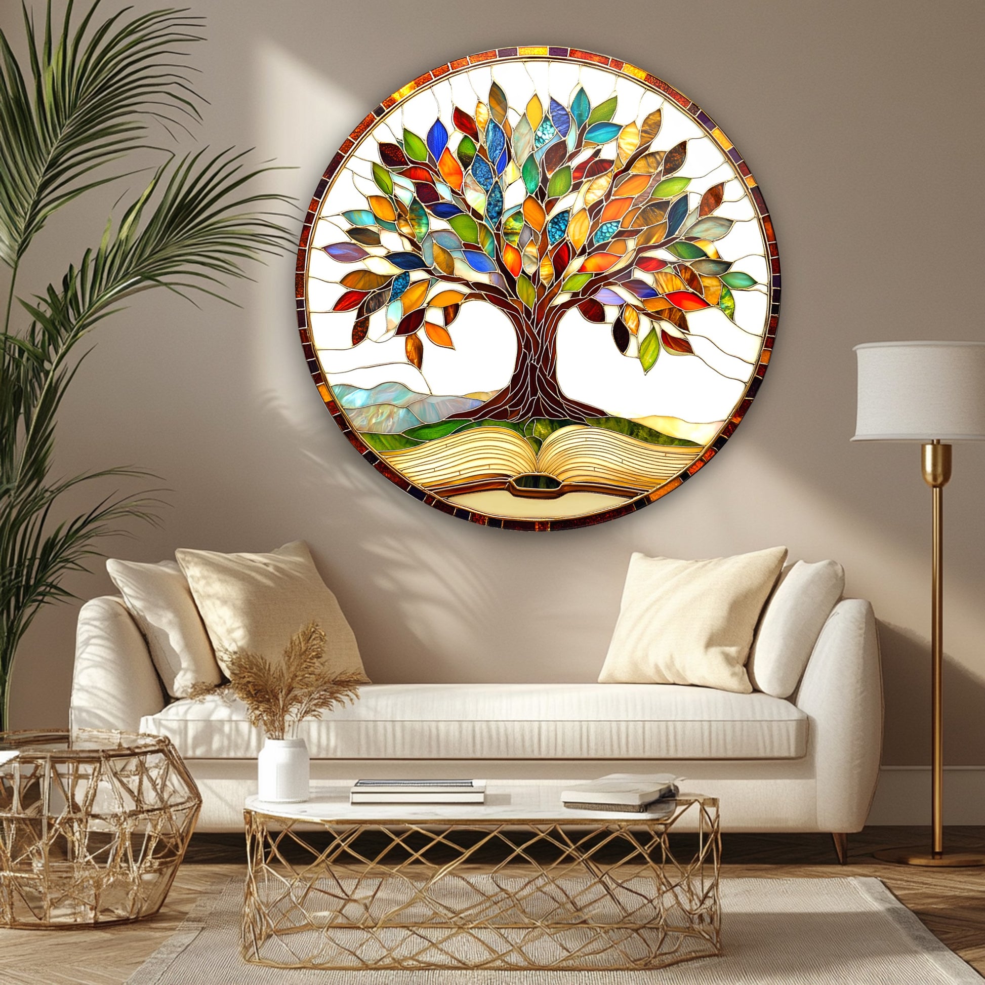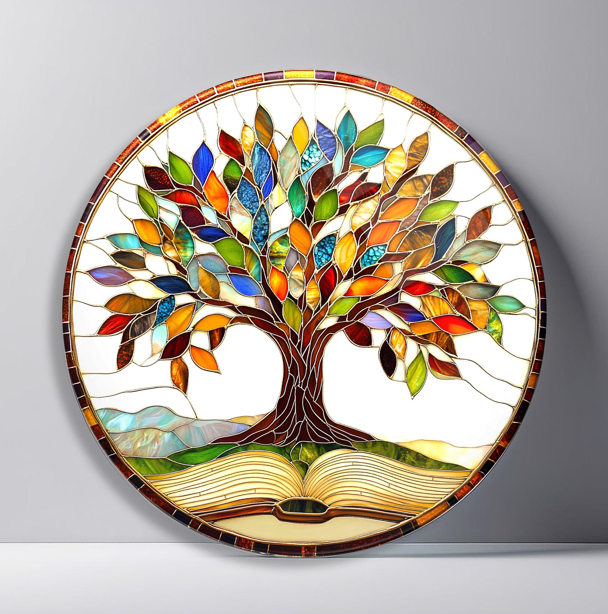 Renkli Yapraklı Hayat Ağacı Yuvarlak Cam Tablo
