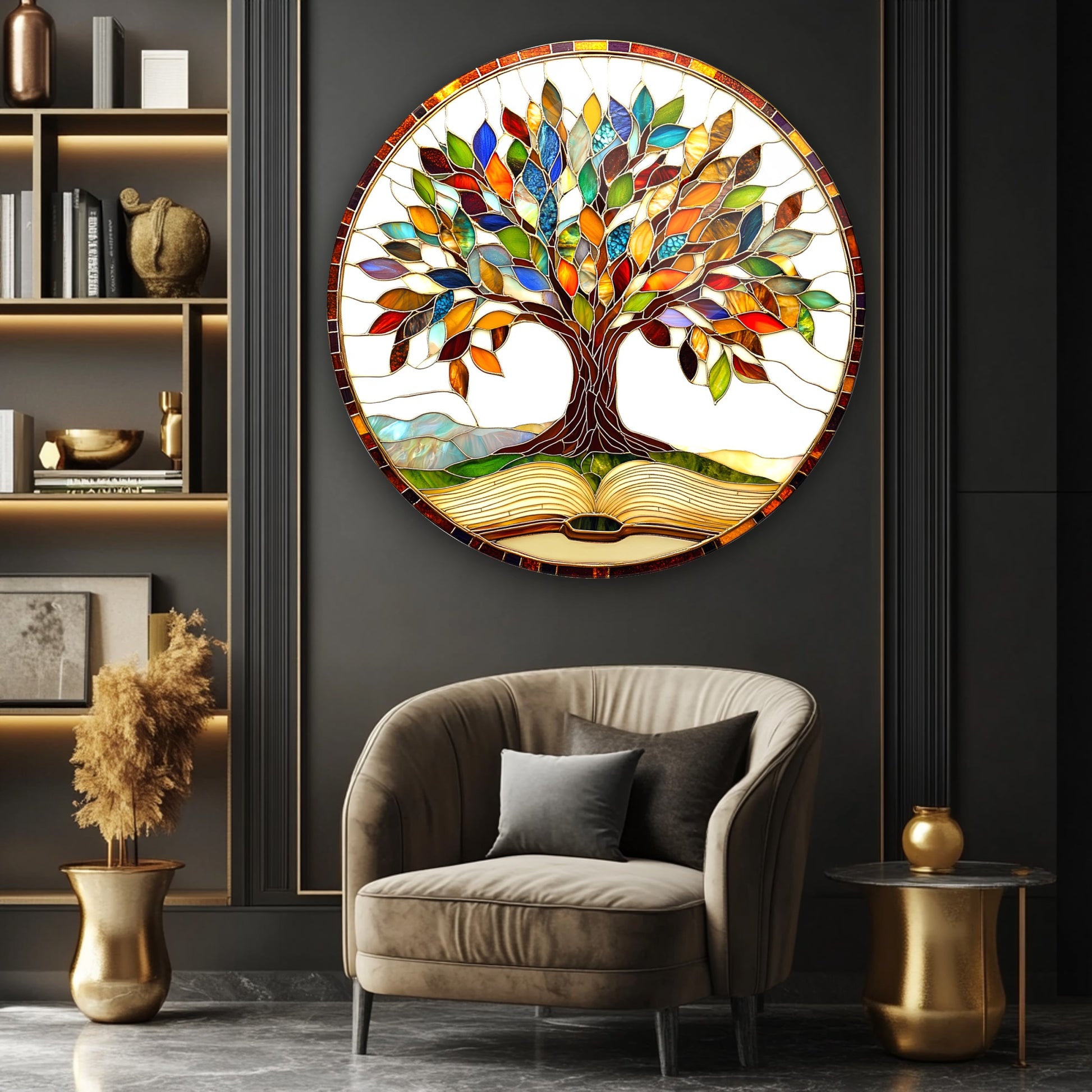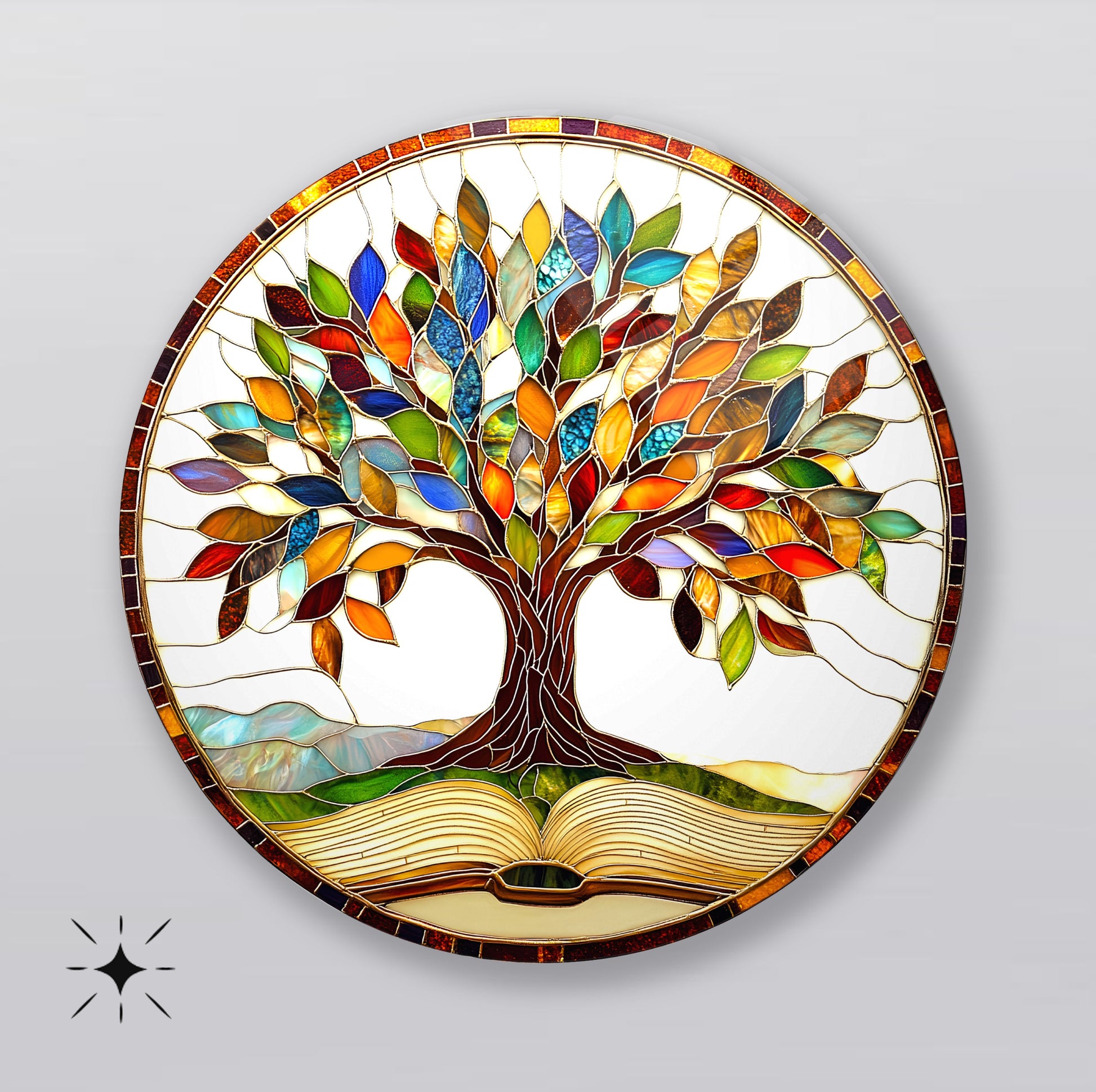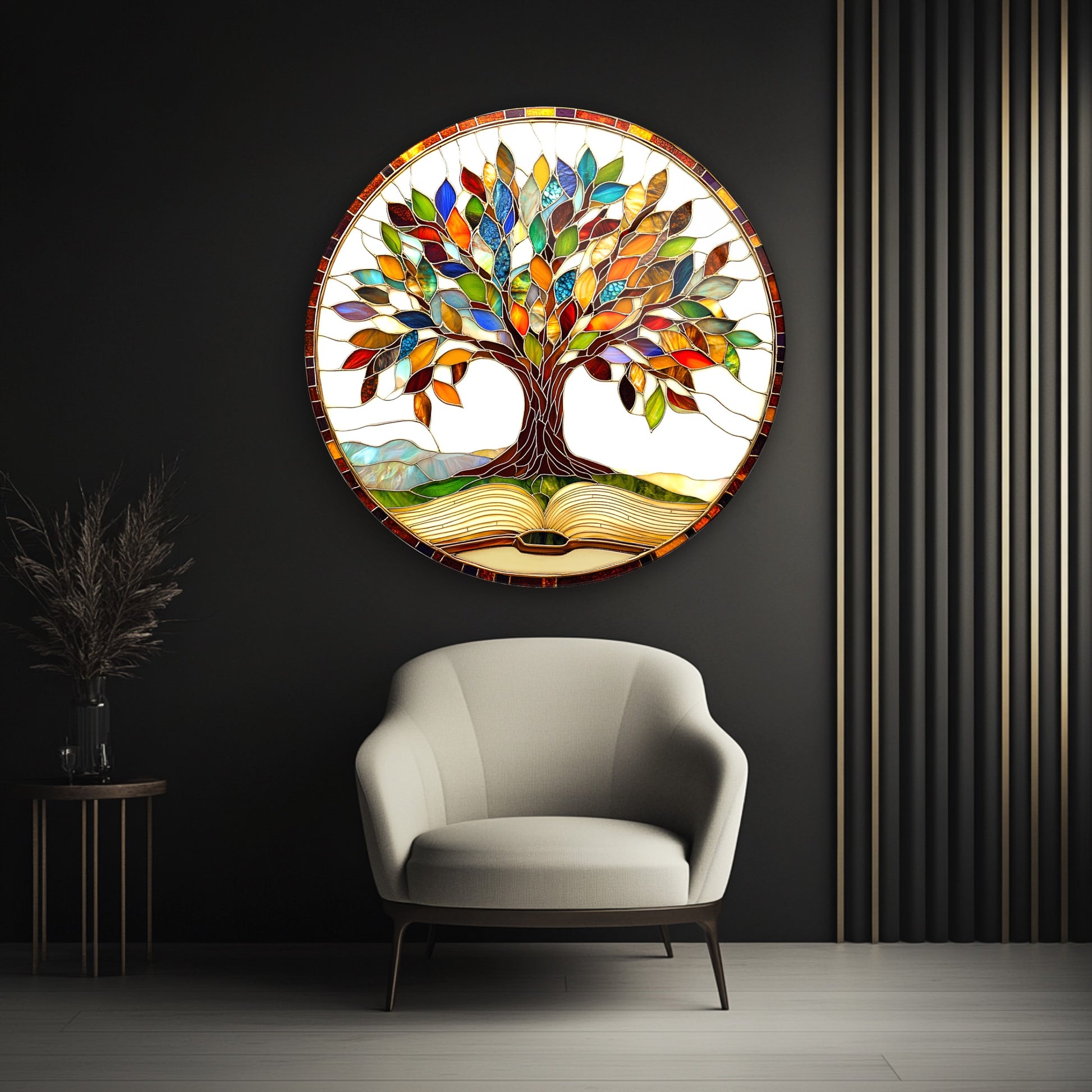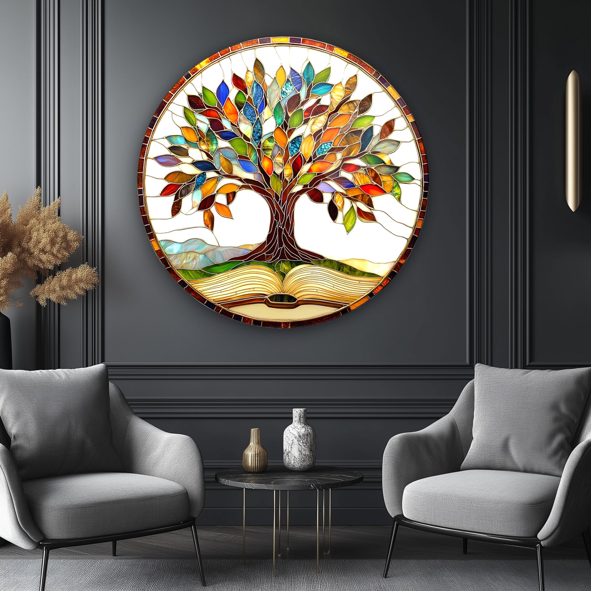 Renkli Yapraklı Hayat Ağacı Yuvarlak Cam Tablo