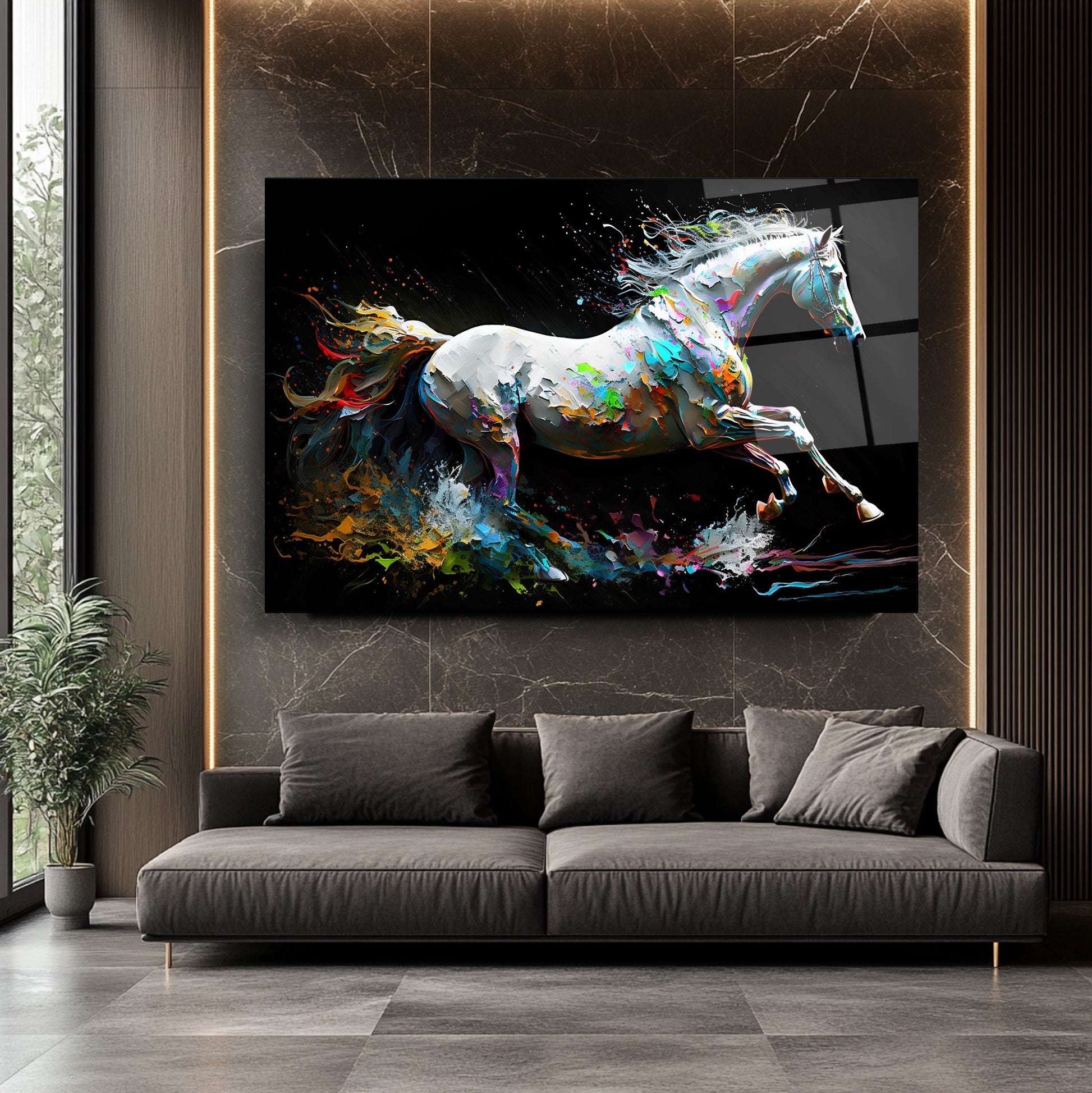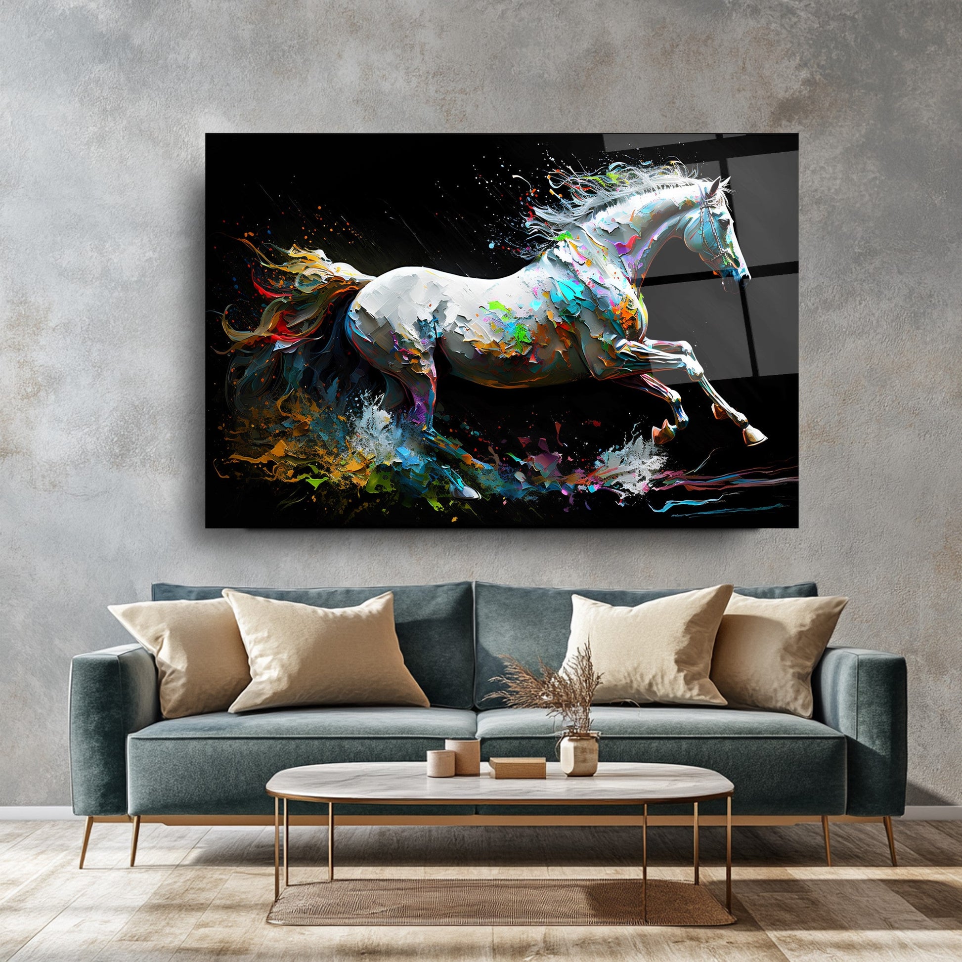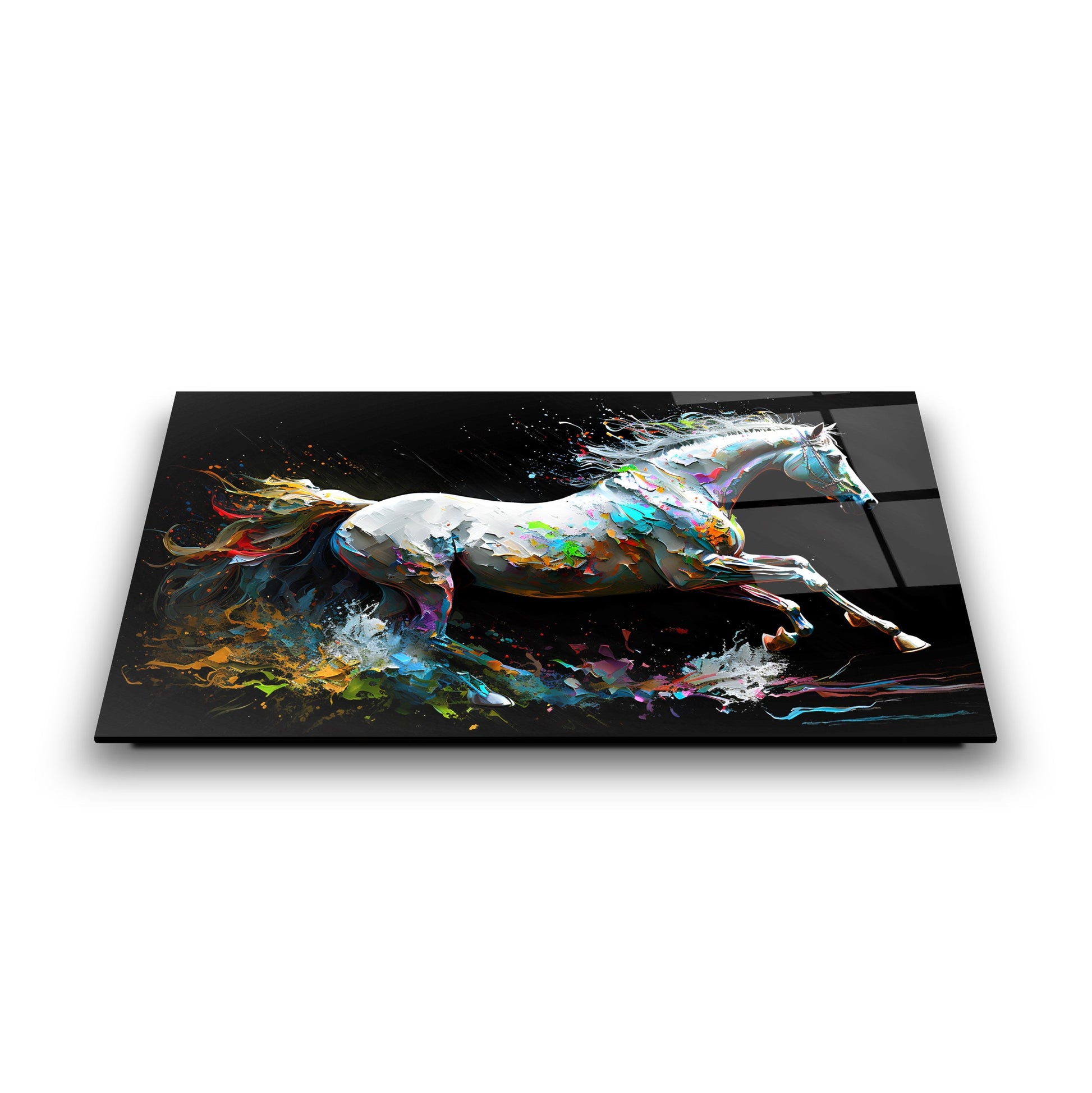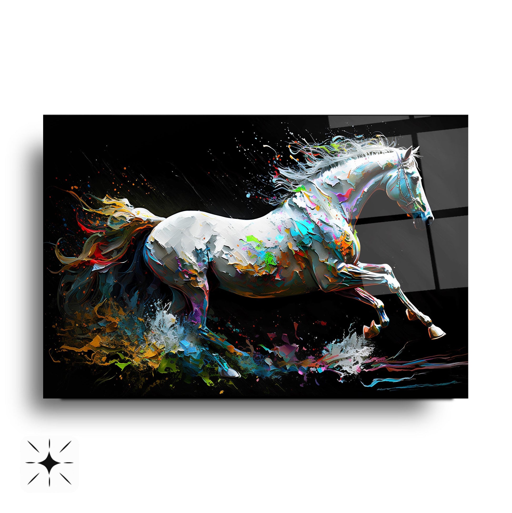 Bu modern cam tablo, hareketli ve enerjik bir tasarımla, mekânınıza dinamik bir atmosfer katıyor. Beyaz at figürü, neon renklerle vurgulanmış kuyruğuyla dikkat çekiyor ve soyut arka planla birleşerek sanatsal bir bütünlük oluşturuyor. 4 mm kalınlığında ultra-clear temperli cam üzerine uygulanan HD UV baskı, renklerin solmadan uzun süre canlı kalmasını sağlıyor. Çerçevesiz tasarımı sayesinde salon, ofis veya antre gibi alanlarda estetik bir odak noktası sunuyor. Suya, neme ve çizilmeye dayanıklı yüzeyiyle uzun ömürlü kullanım imkânı tanıyor. Kolay montaj için tüm aksesuarlar kutuda yer alıyor ve güvenli paketleme ile sigortalı kargo avantajı sunuluyor. Modern ve enerjik bir dekorasyon arayanlar için ideal bir tercih.