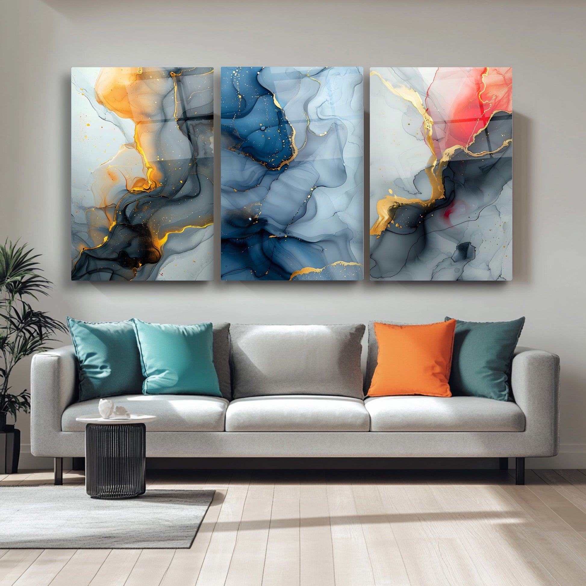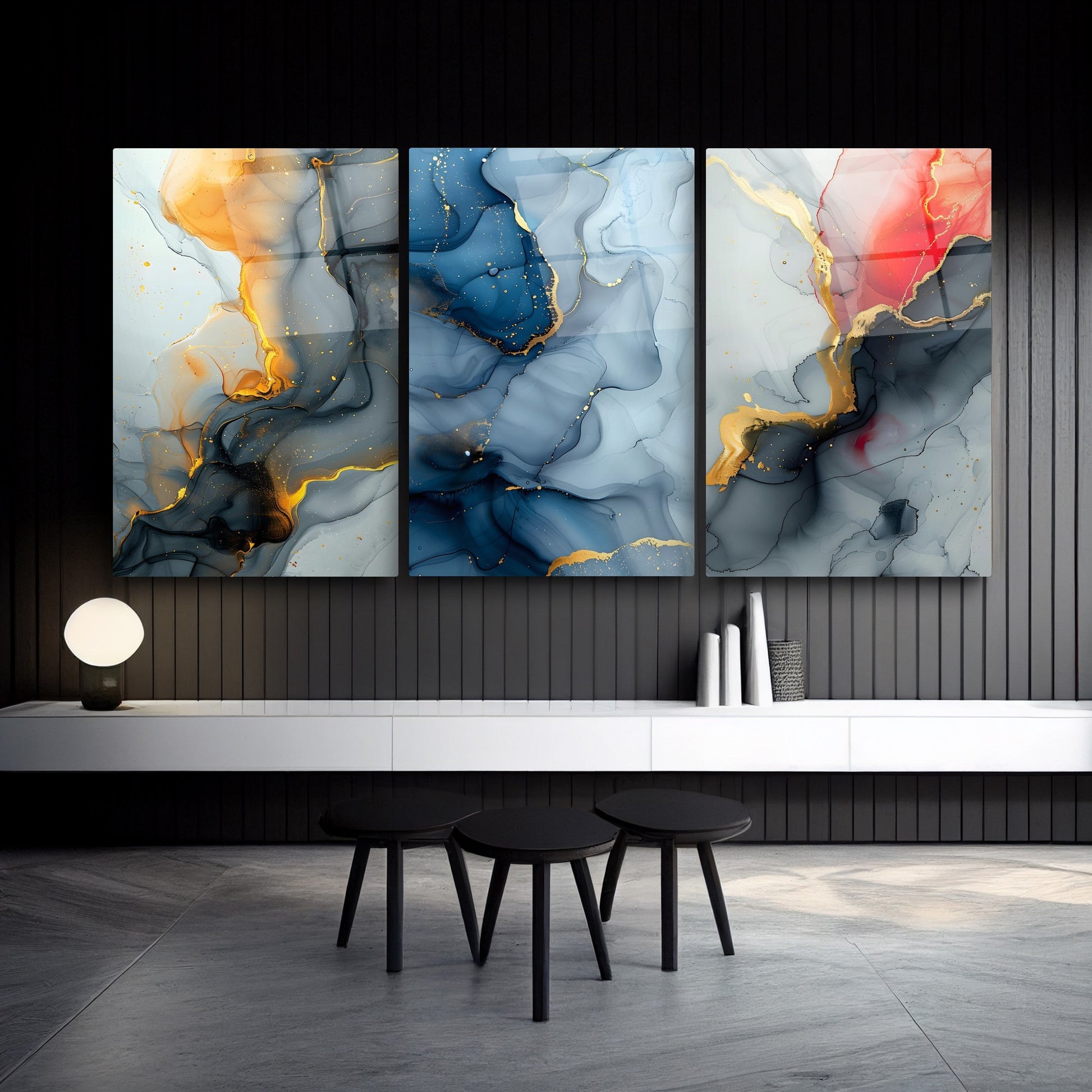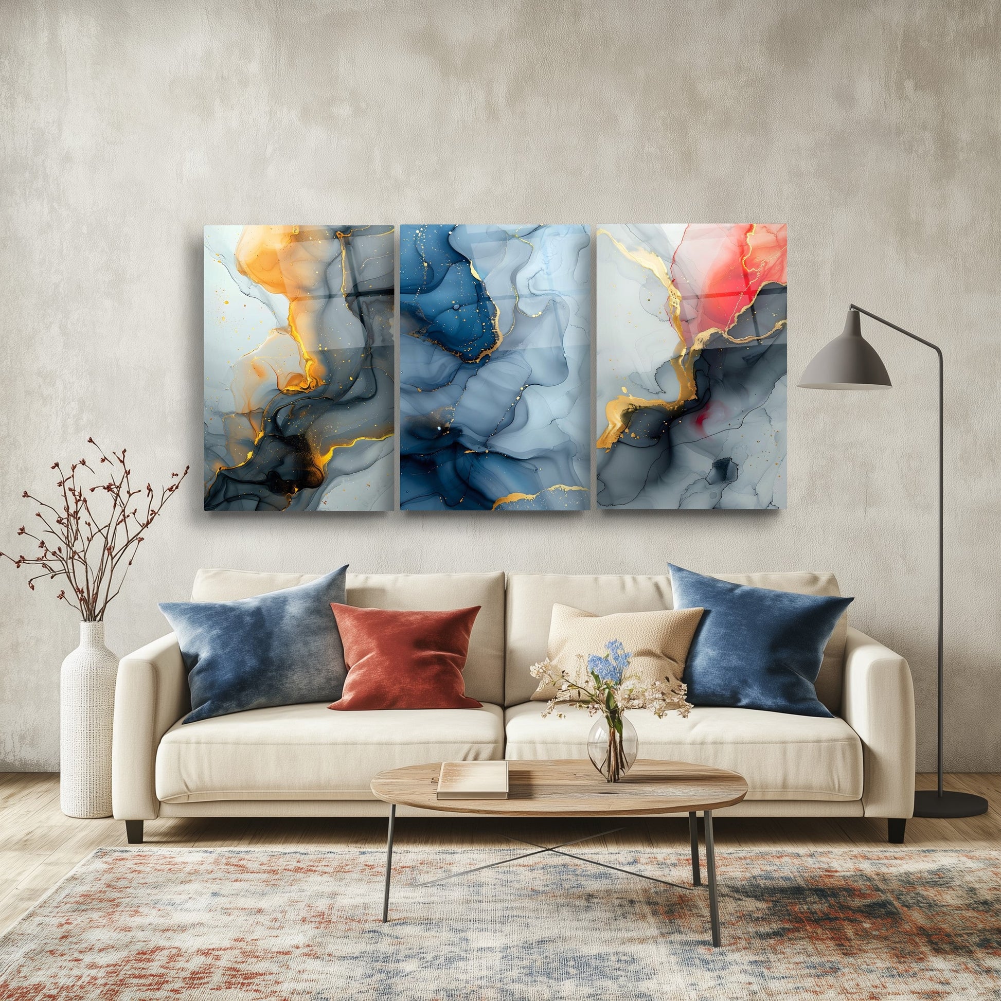 Renkli Mermer Desenler Üçlü Set Cam Tablo