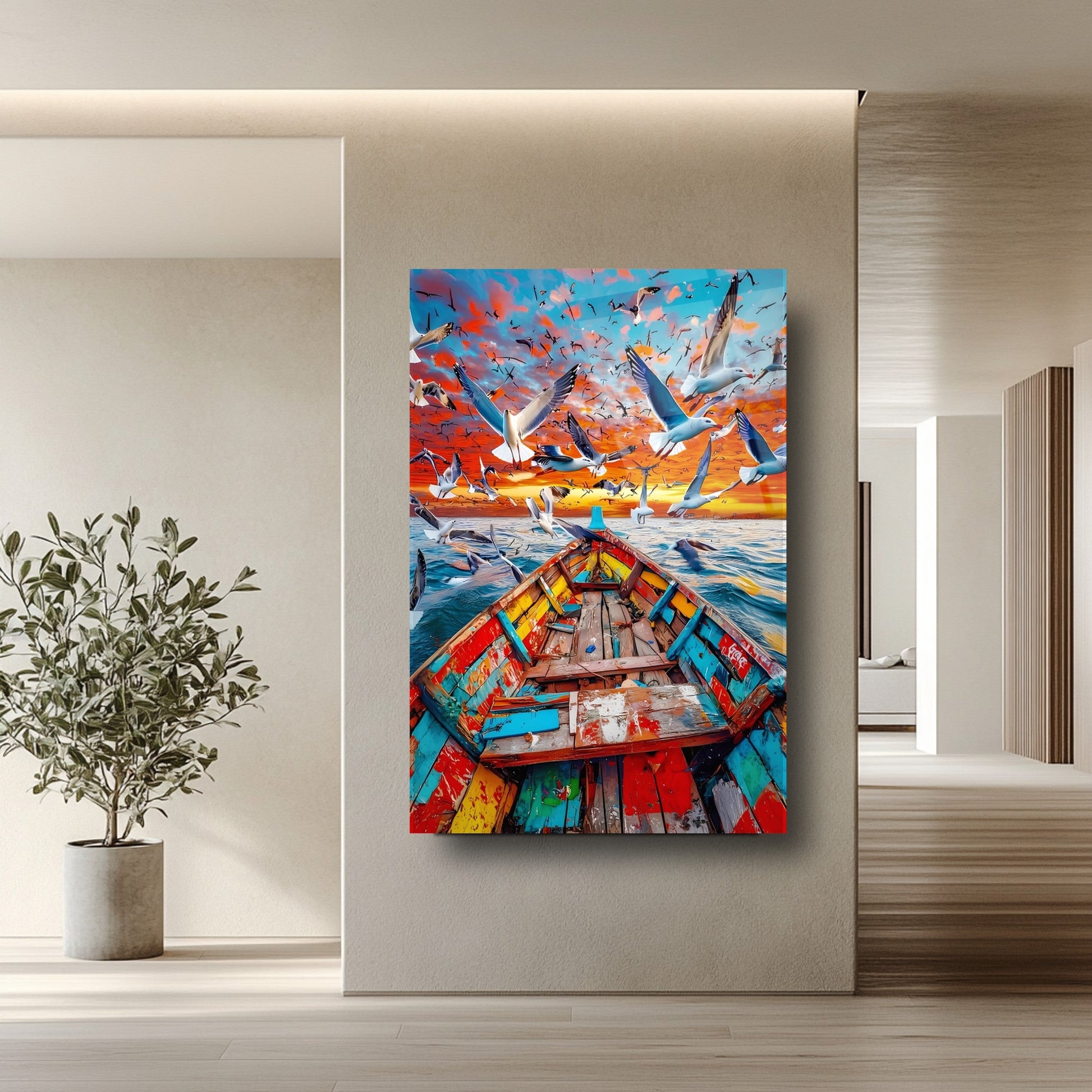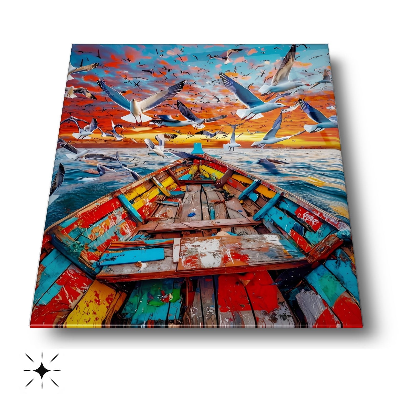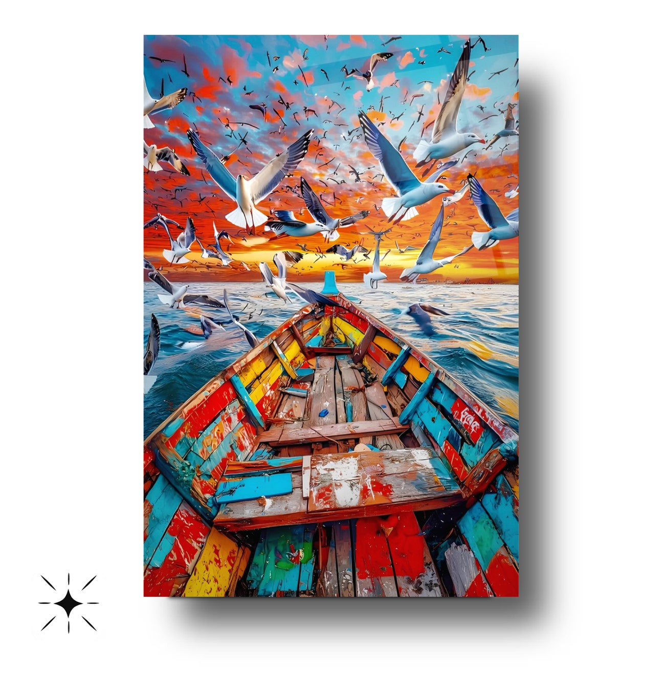 Mekanlarınıza Deniz Esintisi ve Renk Katın: Renkli Sandal Martılar Manzara Deniz Cam Tablo