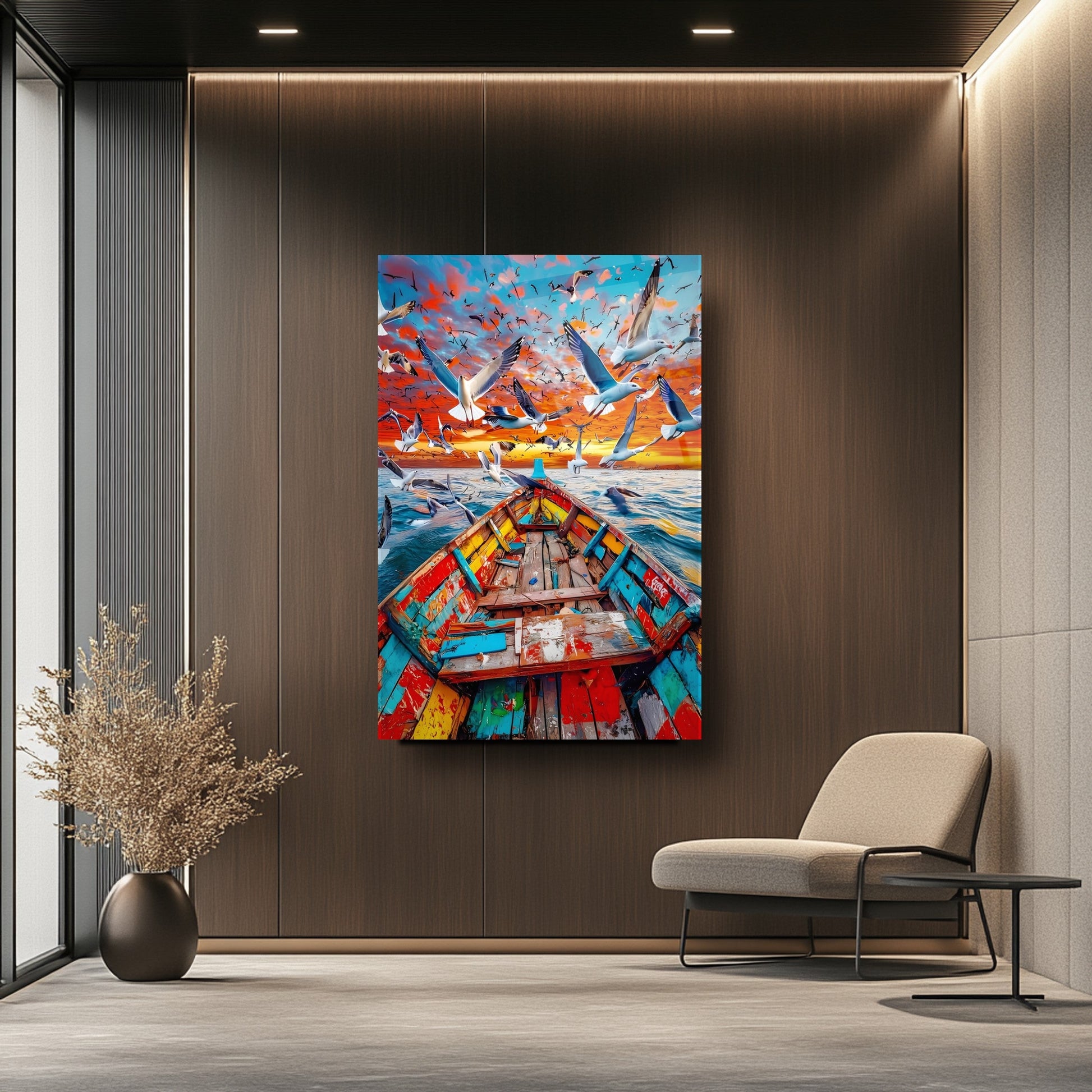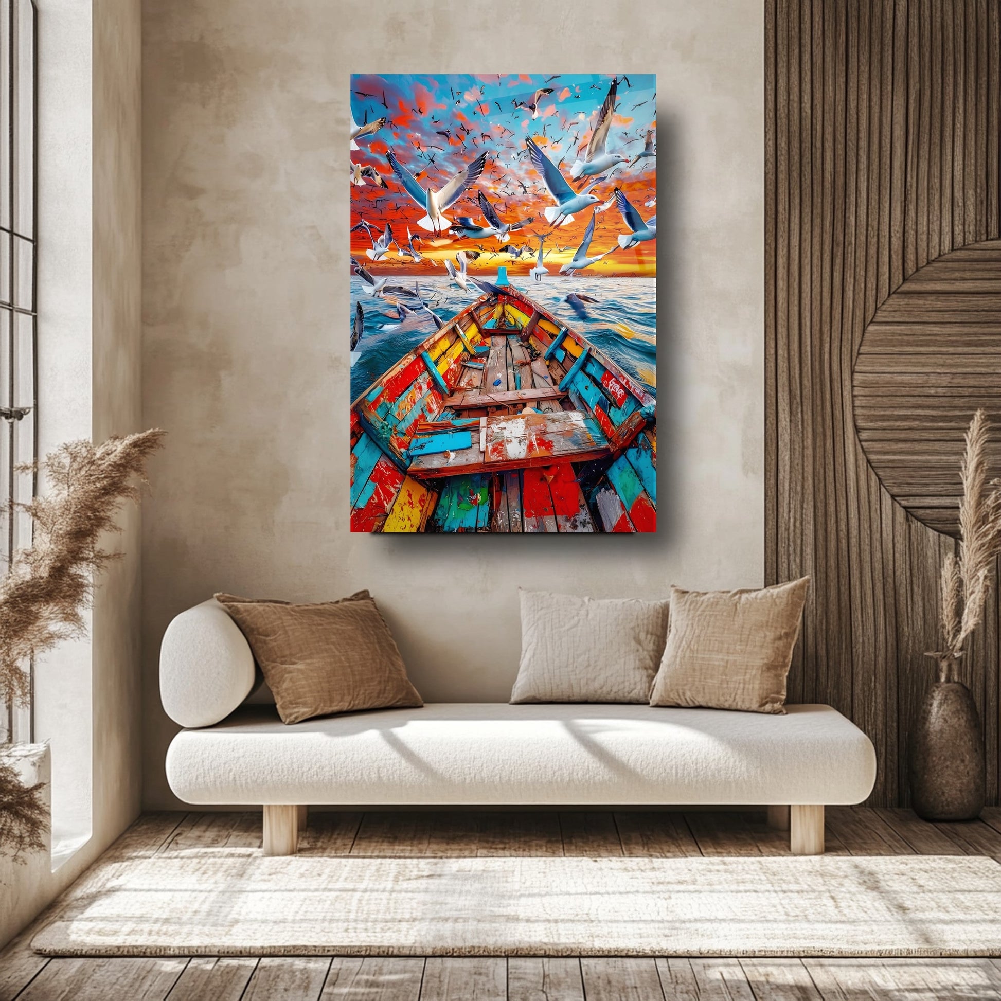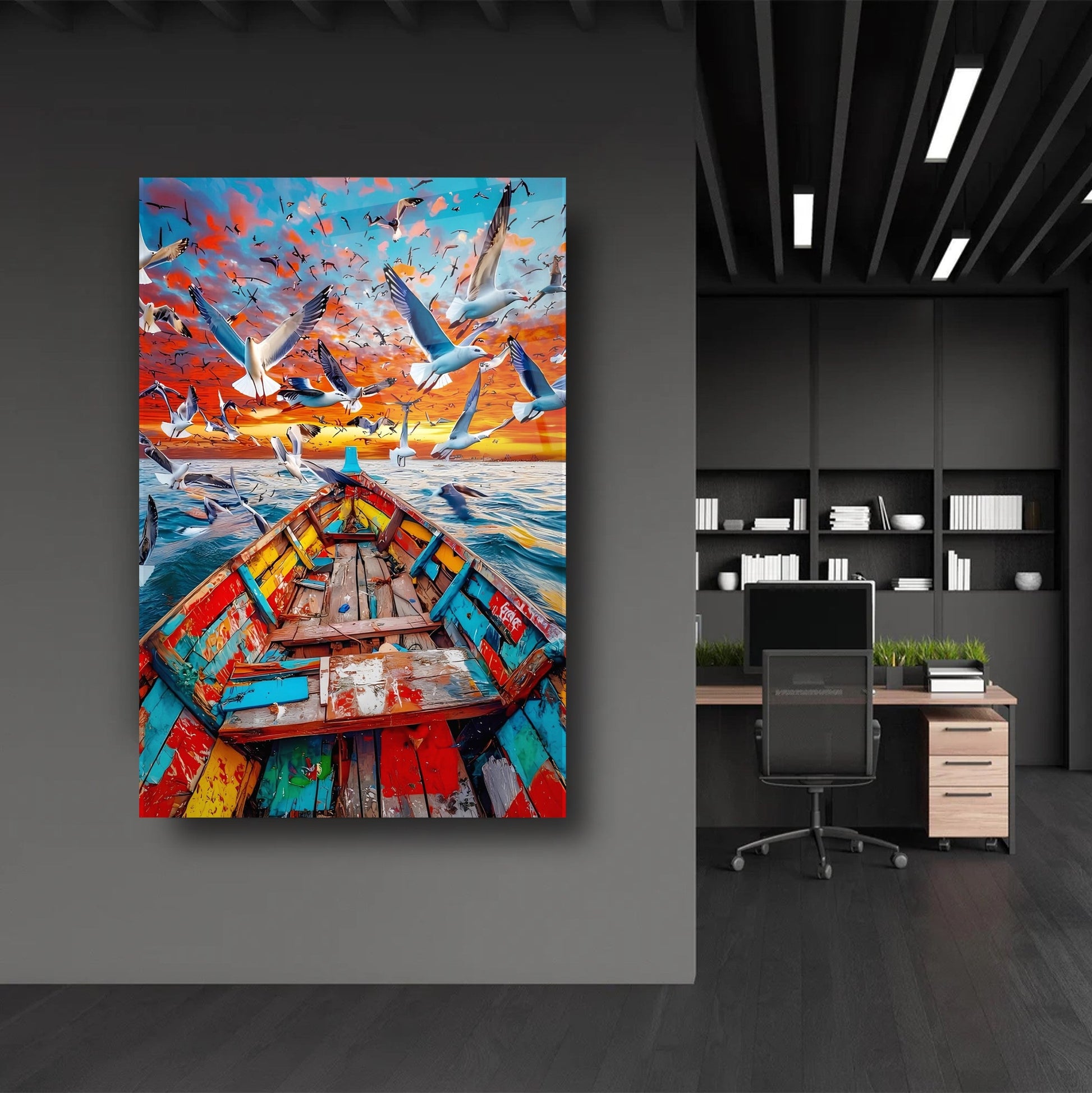 Mekanlarınıza Deniz Esintisi ve Renk Katın: Renkli Sandal Martılar Manzara Deniz Cam Tablo