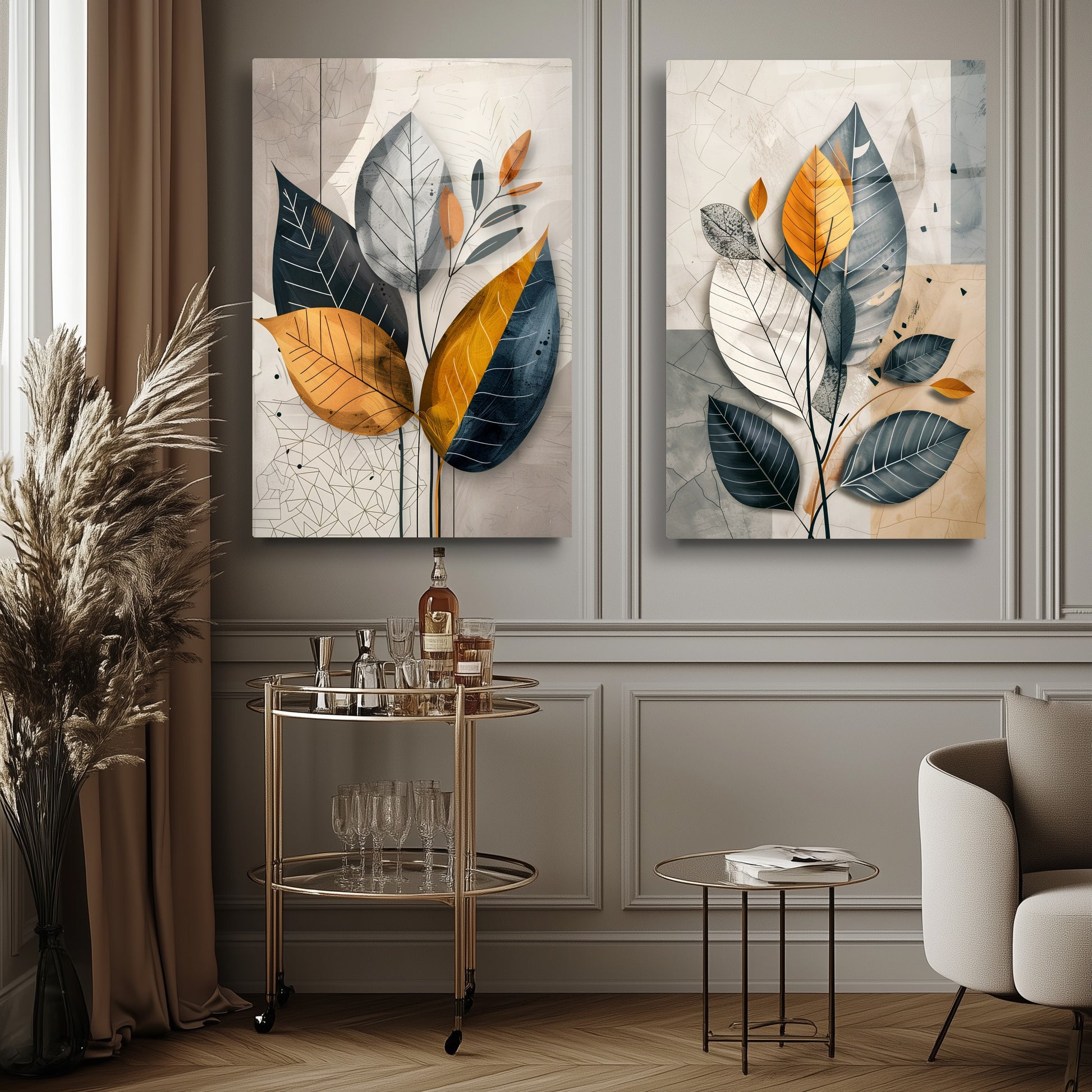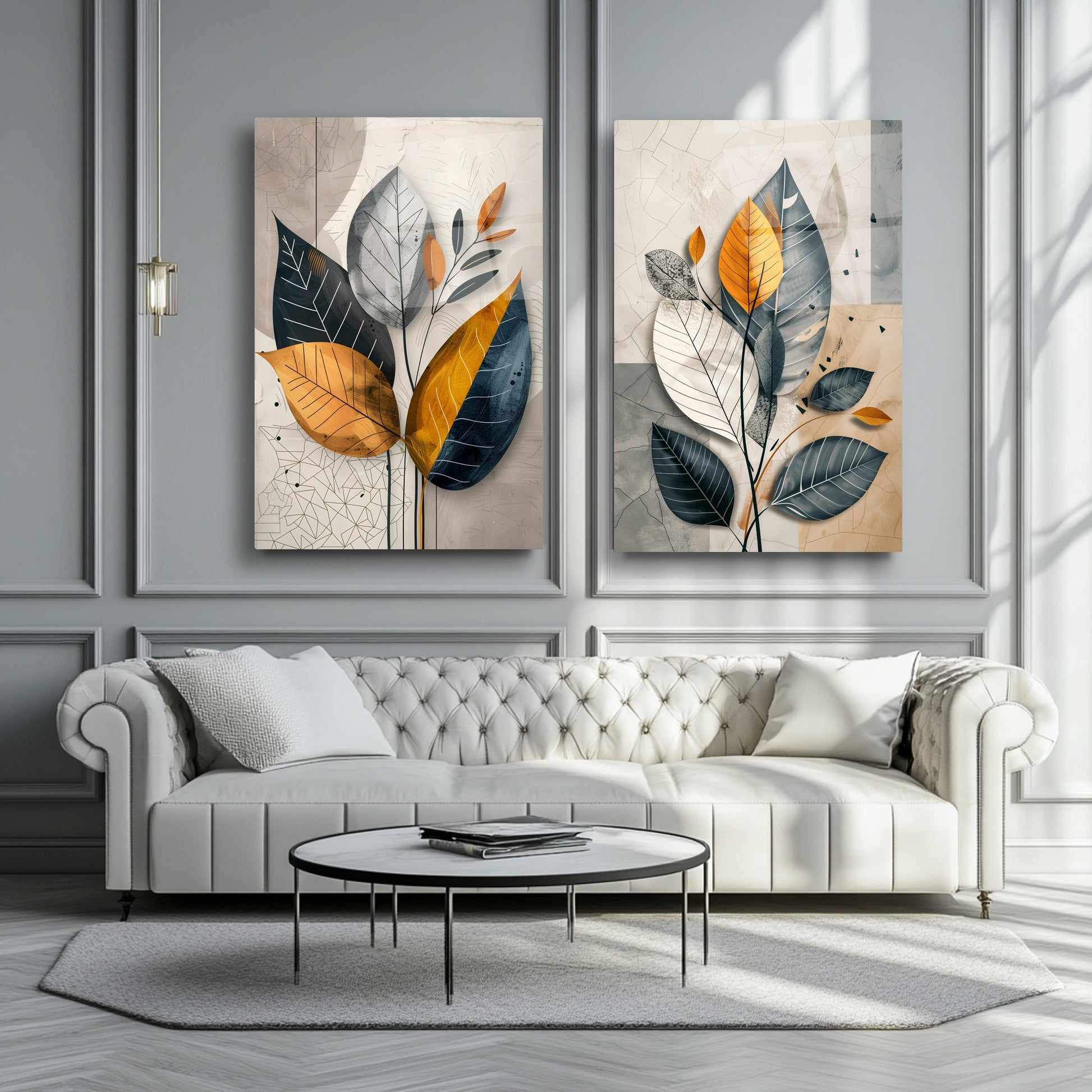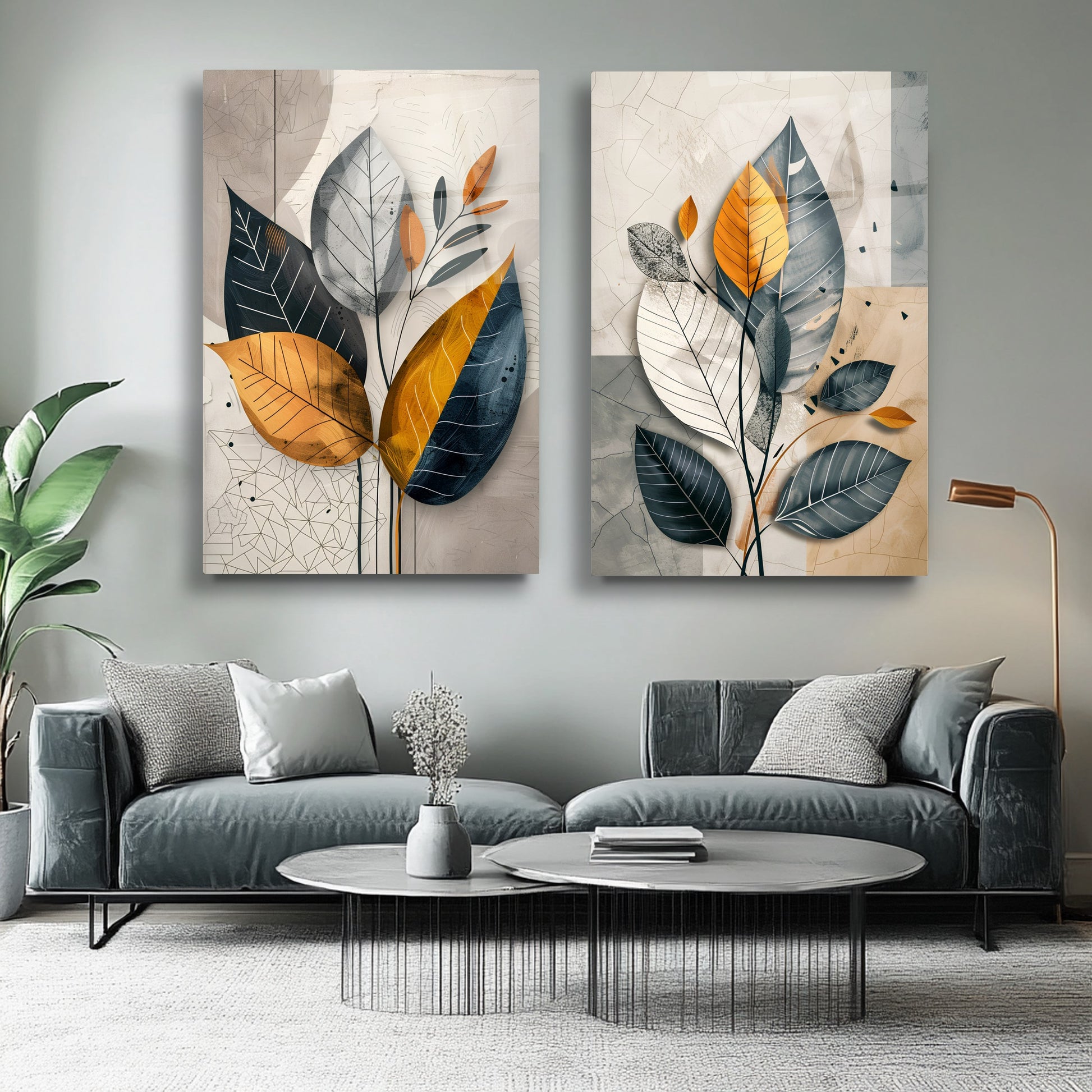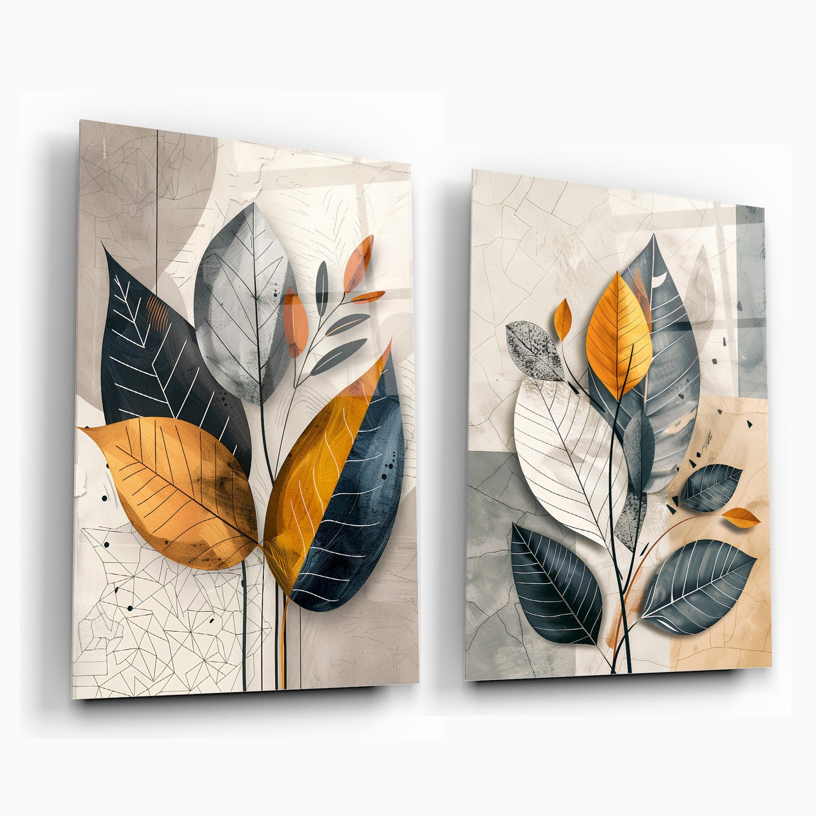Renkli Soft Yapraklar İkili Set Cam Tablo