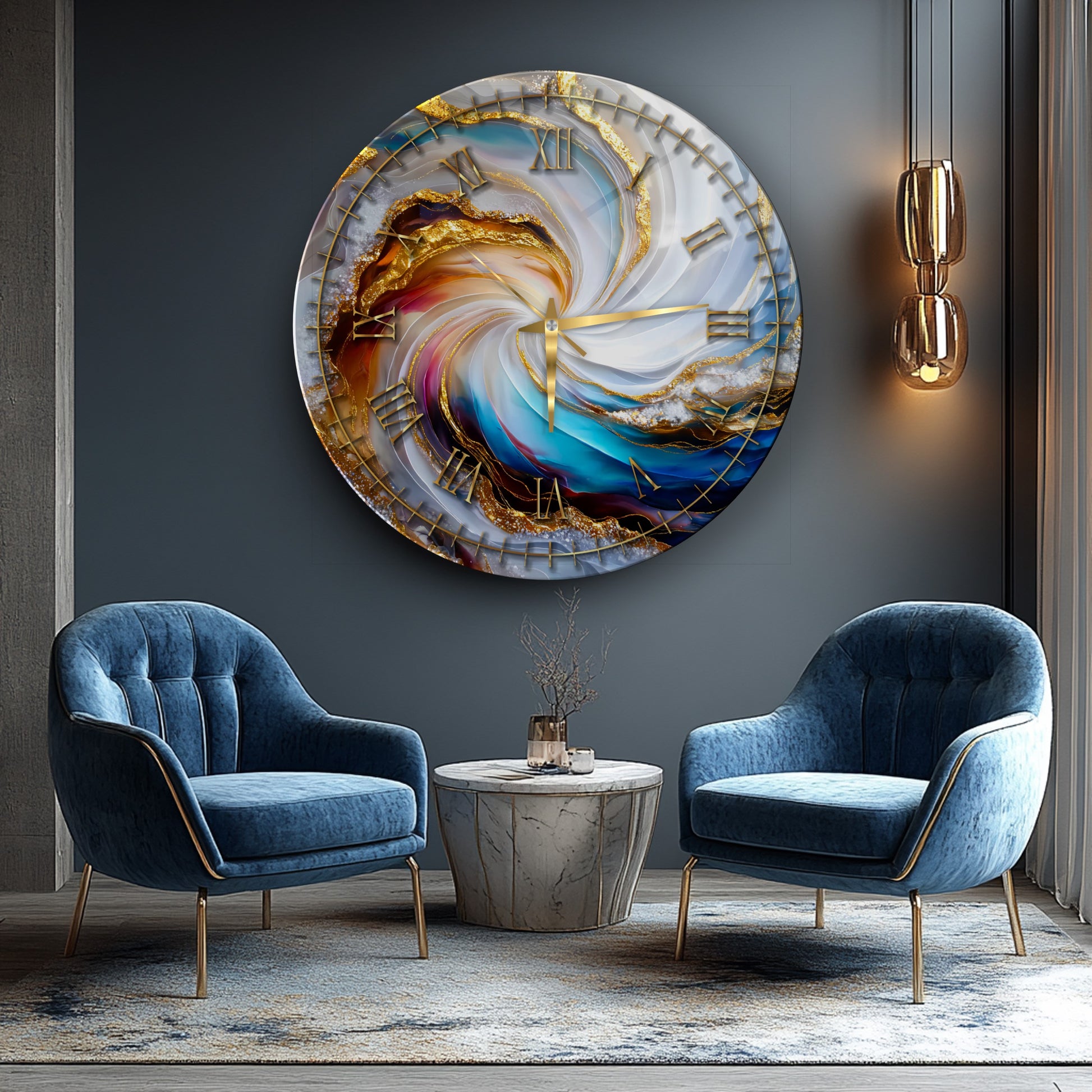 Soyut Gold Mermer Desen Cam Duvar Saati