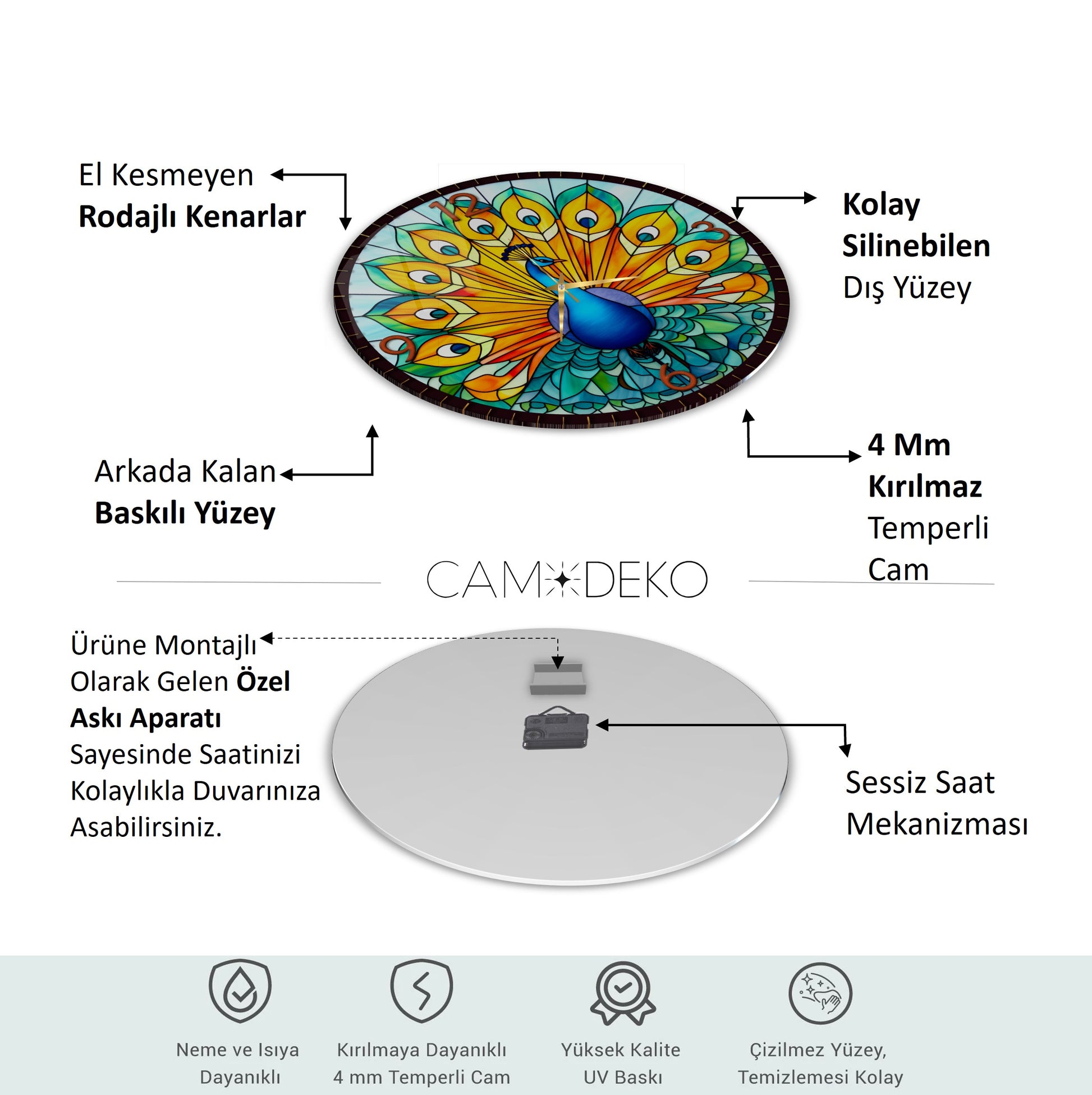 Cam saatlerimiz, son teknoloji UV baskı makineleriyle doğrudan cama uygulanır. Kağıt veya folyo yapıştırma kullanılmaz; baskılar camın arka yüzeyine işlenerek uzun ömürlü ve dayanıklı hale getirilir. Ek olarak, fırınlama boya işlemi ile güçlendirilerek solmaya ve deformasyona karşı ekstra koruma sağlanır.