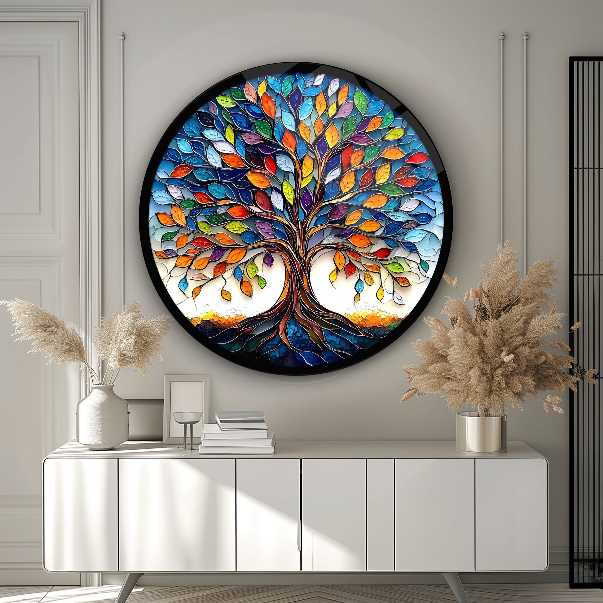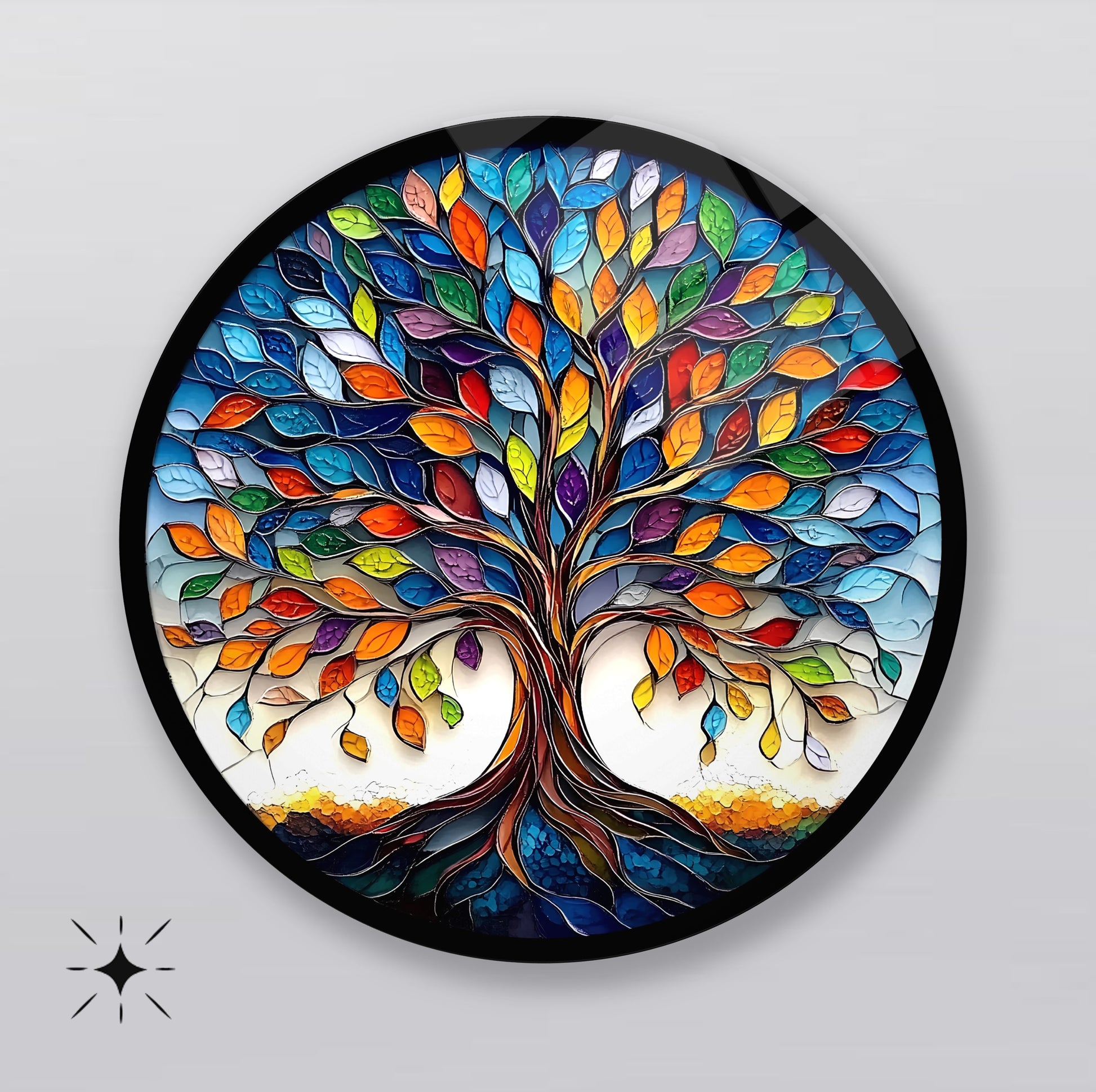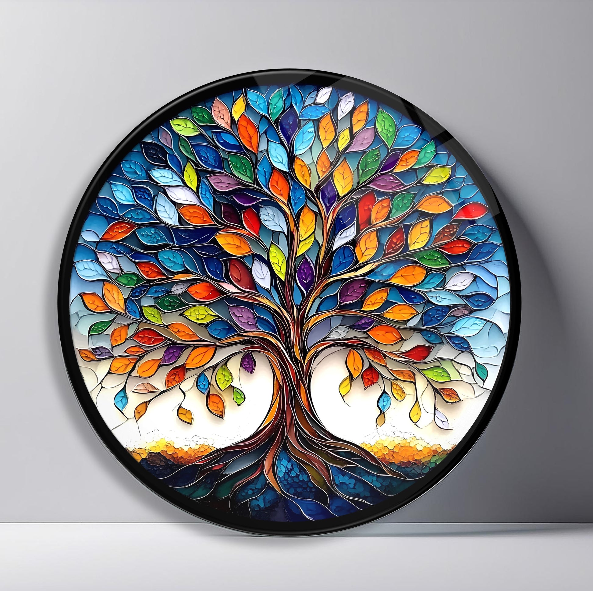 Beyaz zemin üzerinde renkli yapraklarıyla hayat ağacı figürü, bu yuvarlak gerçek cam tabloya modern ve canlı bir dokunuş kazandırır. Kırılmaz cam yapısıyla dayanıklı ve estetik bir dekorasyon seçeneğidir. Yuvarlak formu, mekanlarda dengeli ve akıcı bir görünüm sağlar. Modern yaşam alanları için hem şık hem anlamlı bir tercih olarak öne çıkar.