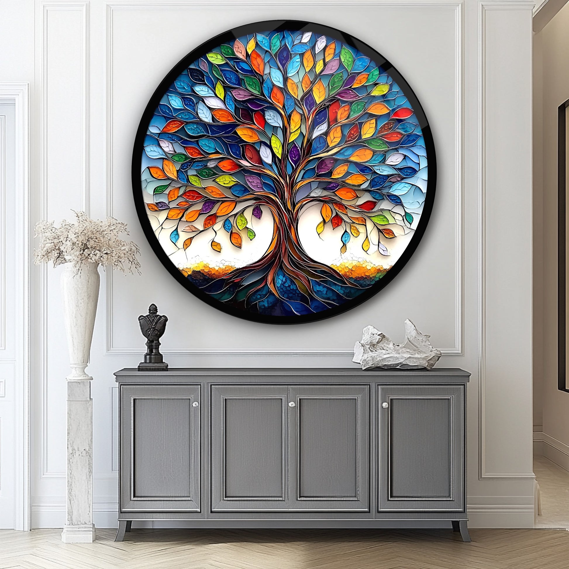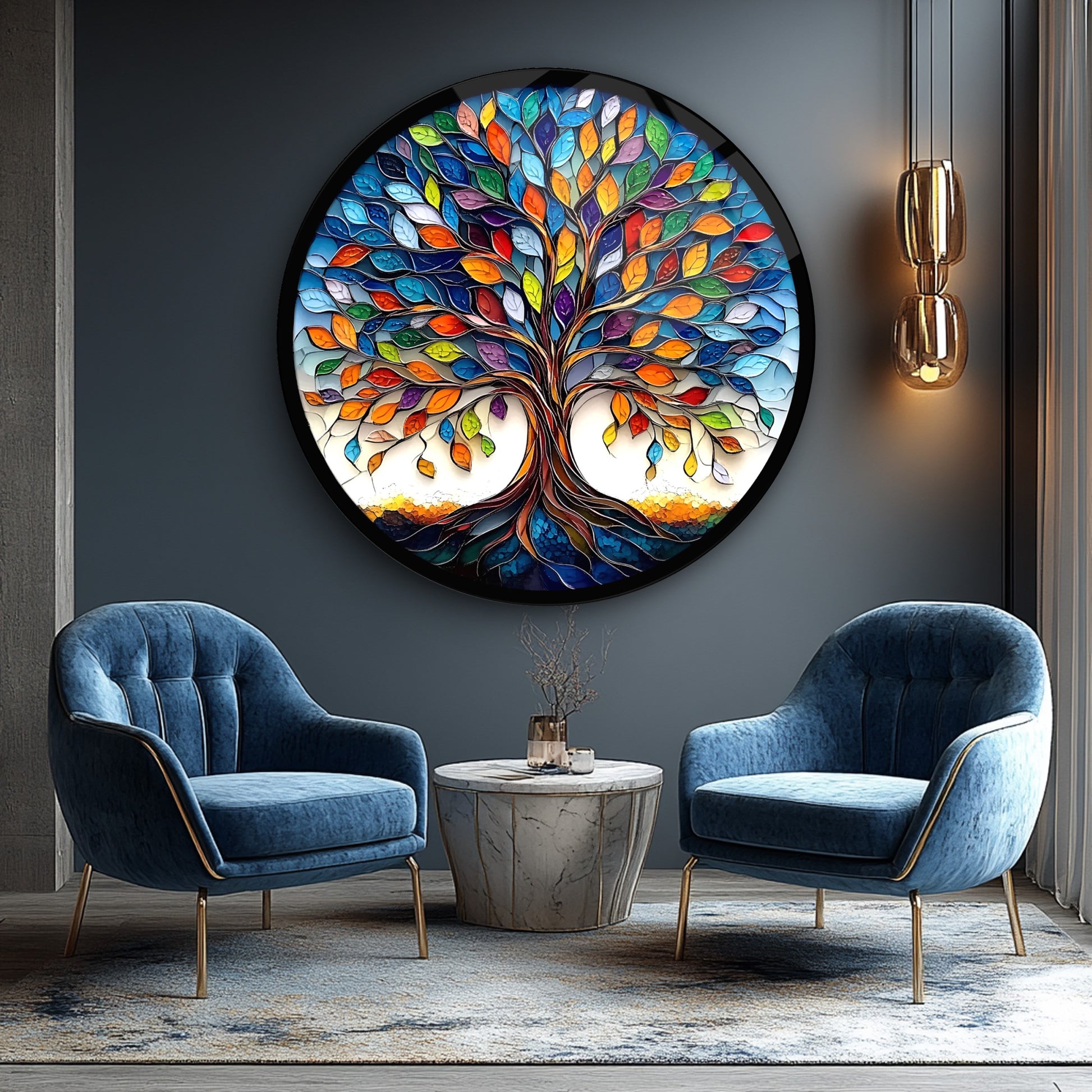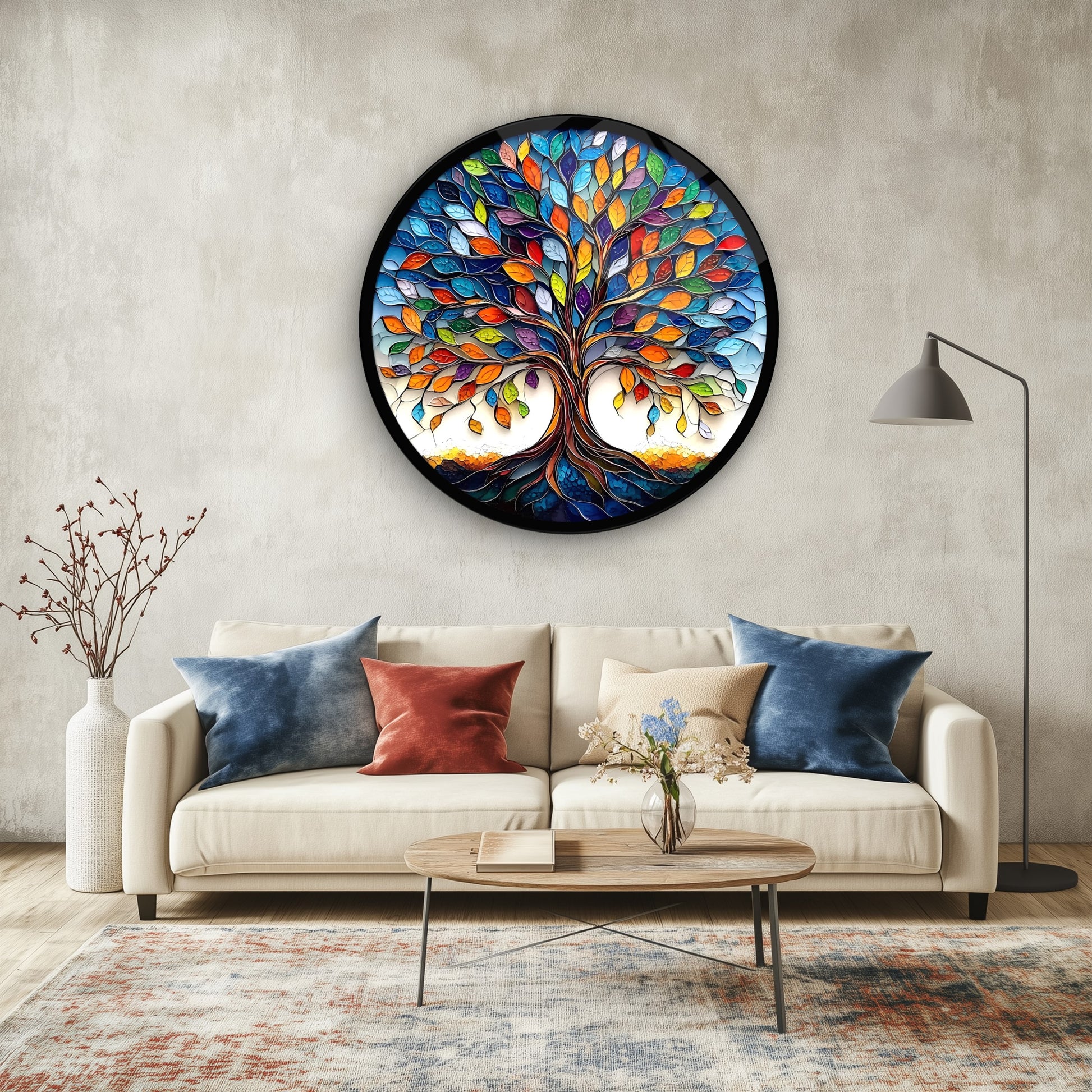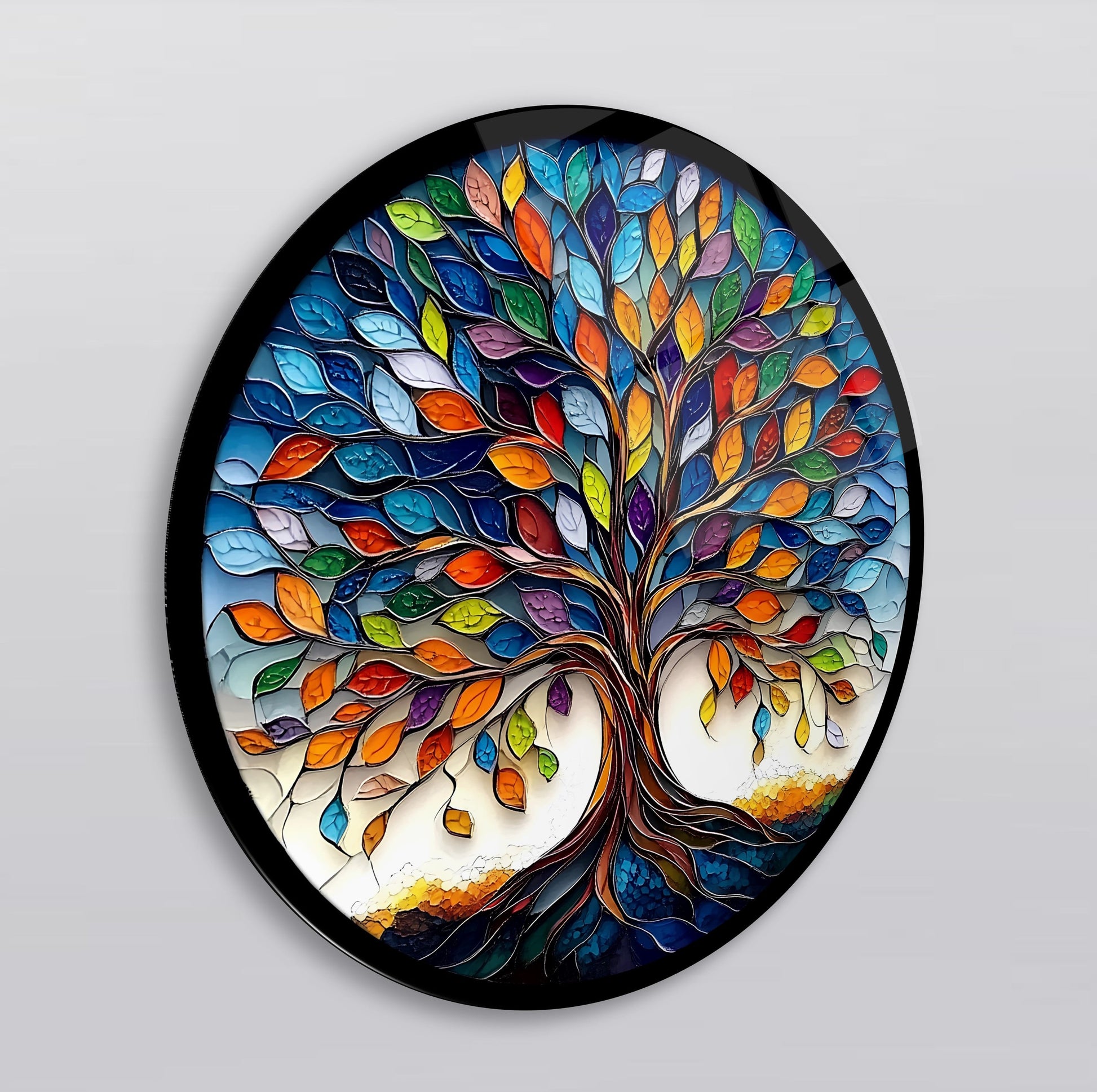 Beyaz zemin üzerinde renkli yapraklarıyla hayat ağacı figürü, bu yuvarlak gerçek cam tabloya modern ve canlı bir dokunuş kazandırır. Kırılmaz cam yapısıyla dayanıklı ve estetik bir dekorasyon seçeneğidir. Yuvarlak formu, mekanlarda dengeli ve akıcı bir görünüm sağlar. Modern yaşam alanları için hem şık hem anlamlı bir tercih olarak öne çıkar.