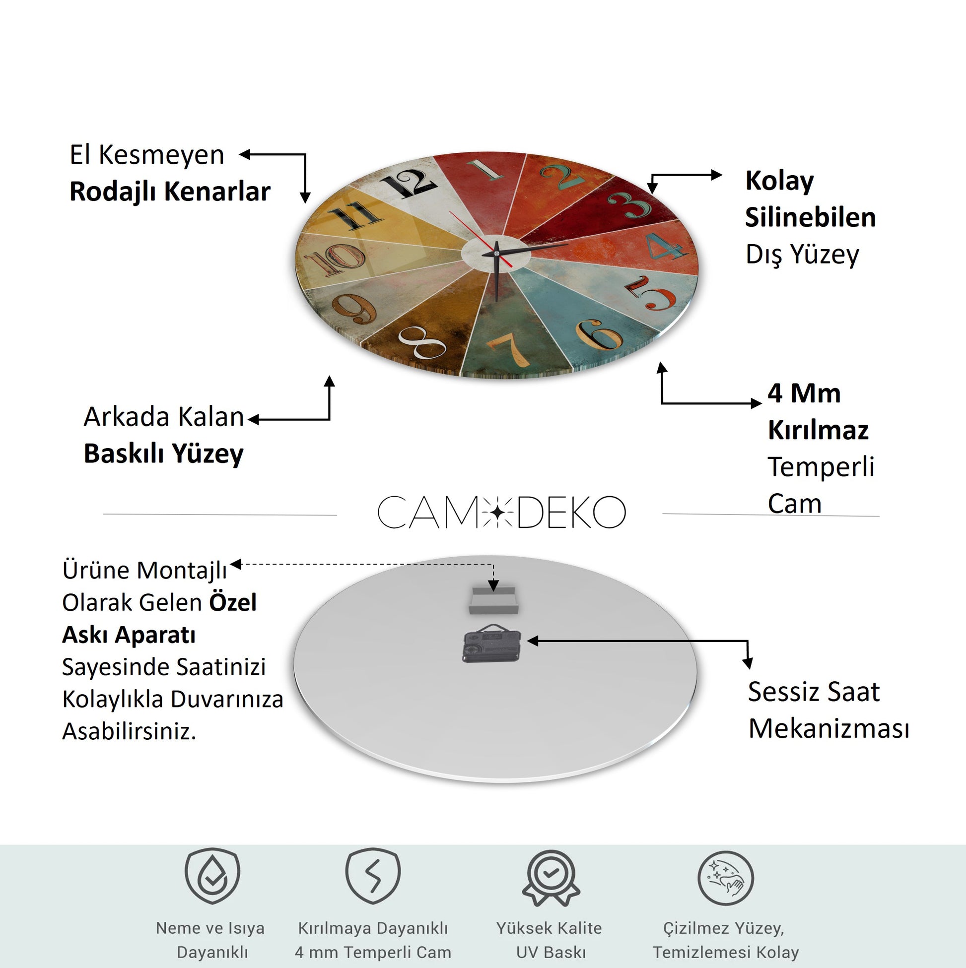 Cam saatlerimiz, son teknoloji UV baskı makineleriyle doğrudan cama uygulanır. Kağıt veya folyo yapıştırma kullanılmaz; baskılar camın arka yüzeyine işlenerek uzun ömürlü ve dayanıklı hale getirilir. Ek olarak, fırınlama boya işlemi ile güçlendirilerek solmaya ve deformasyona karşı ekstra koruma sağlanır.