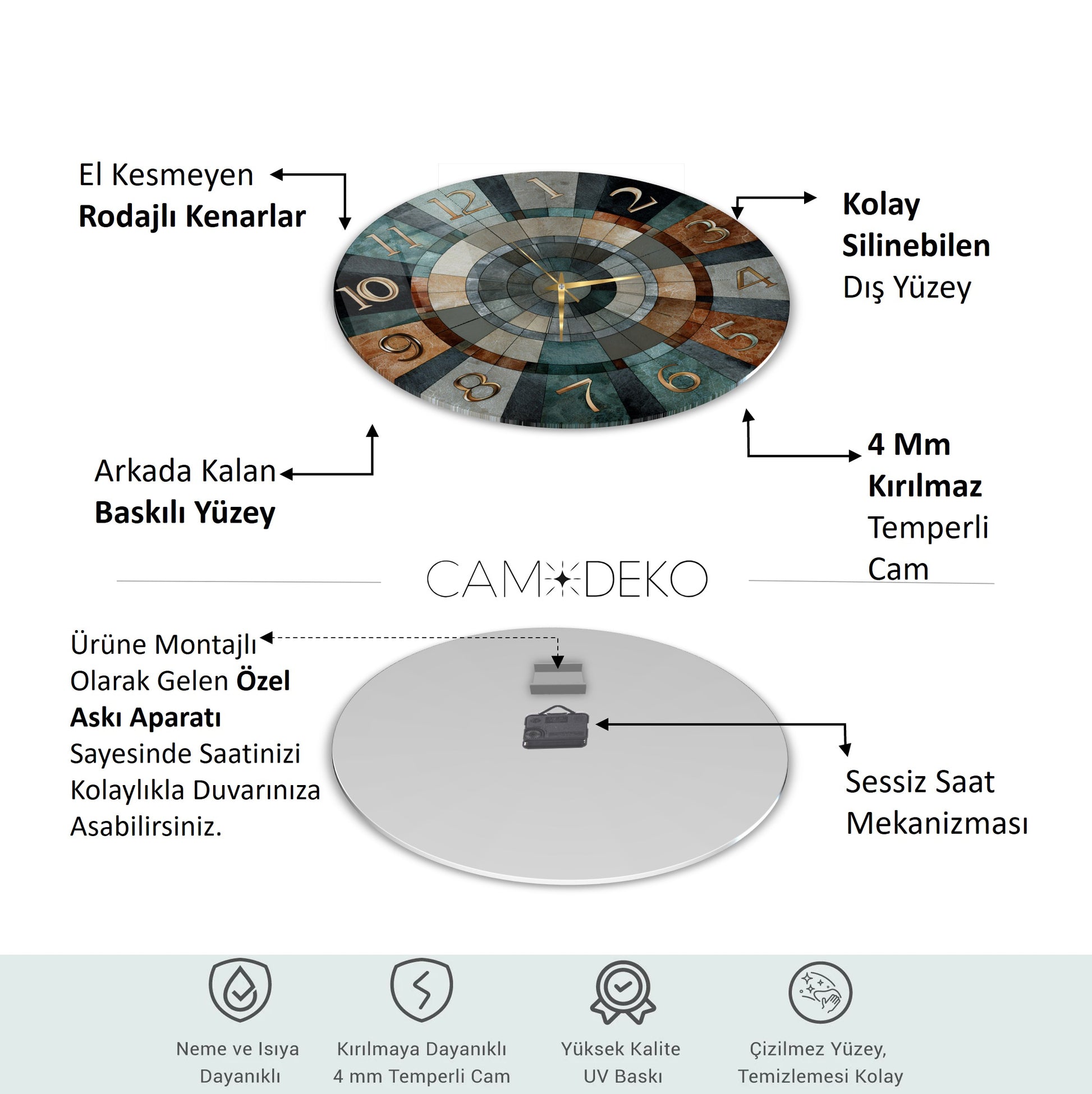Saatlerimizde 4 mm kalınlığında ultra clear temperli cam kullanılır. Rodajlanmış (el kesmeyen) kenarları, hem güvenli hem de estetik bir görünüm sunar. Zamansız tasarımıyla ev ve ofis dekorasyonuna şıklık katar.