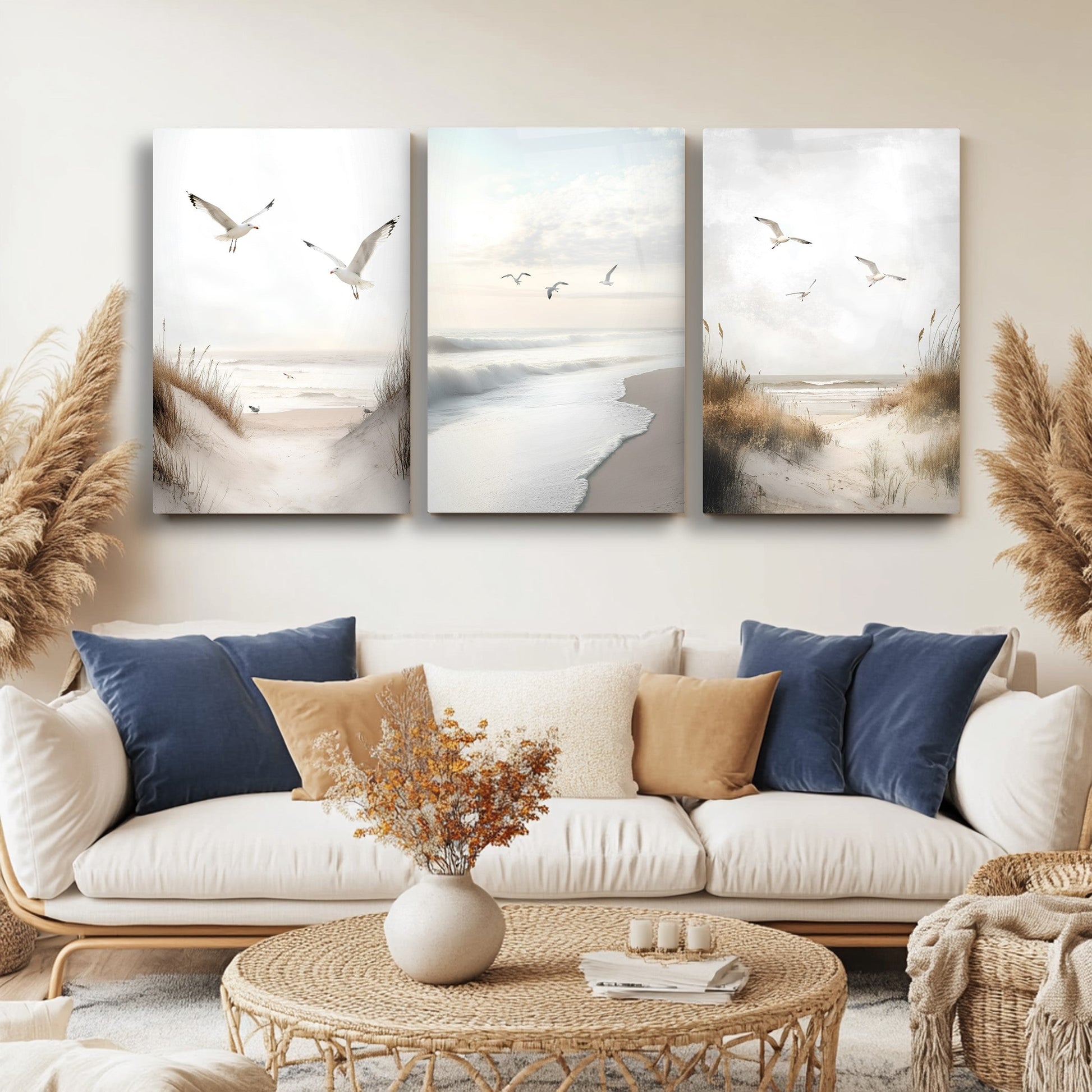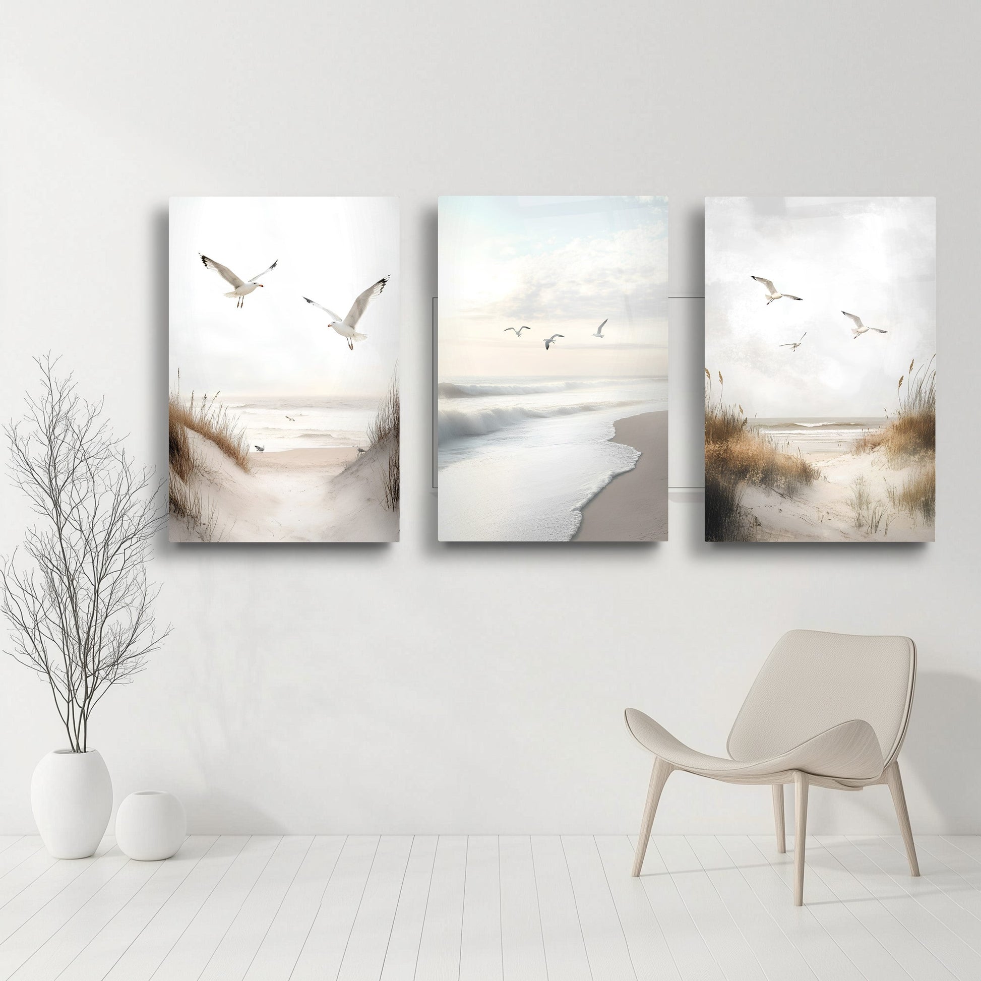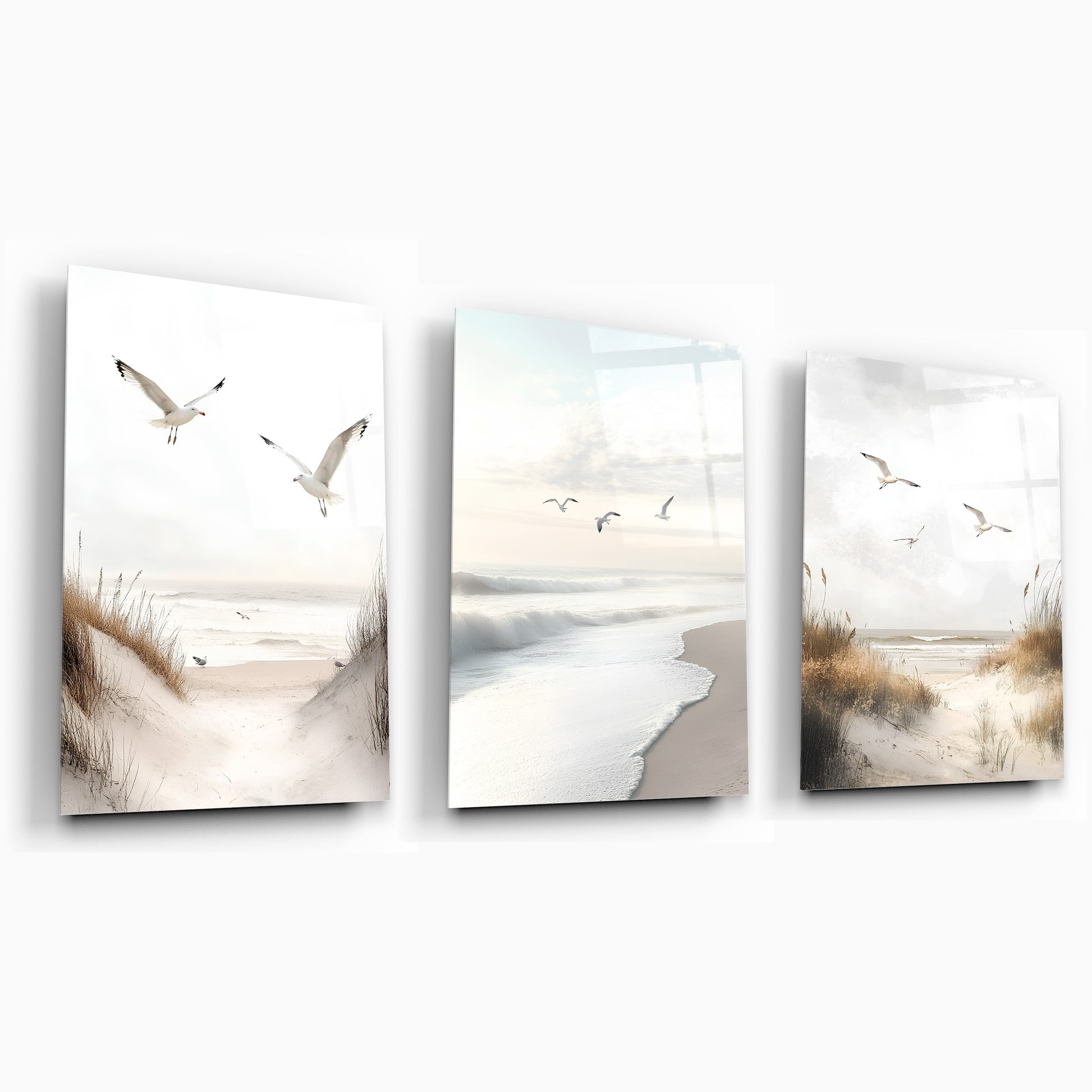 Sahil, deniz ve uçan kuşlar temasıyla tasarlanan bu minimal tarz büyük boy kırılmaz cam tablo seti, huzur dolu bir doğa atmosferi sunar. Kumsal tonları ve sade çizgilerle modern dekorasyona yumuşak bir dokunuş sağlar. Temperli cam yüzeyi ile hem şık hem de dayanıklıdır. Salon dekorasyonu için doğal, ferah ve zarif bir seçimdir.