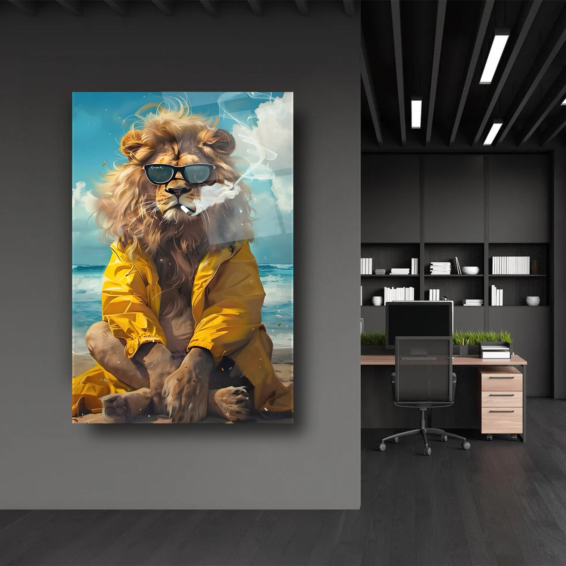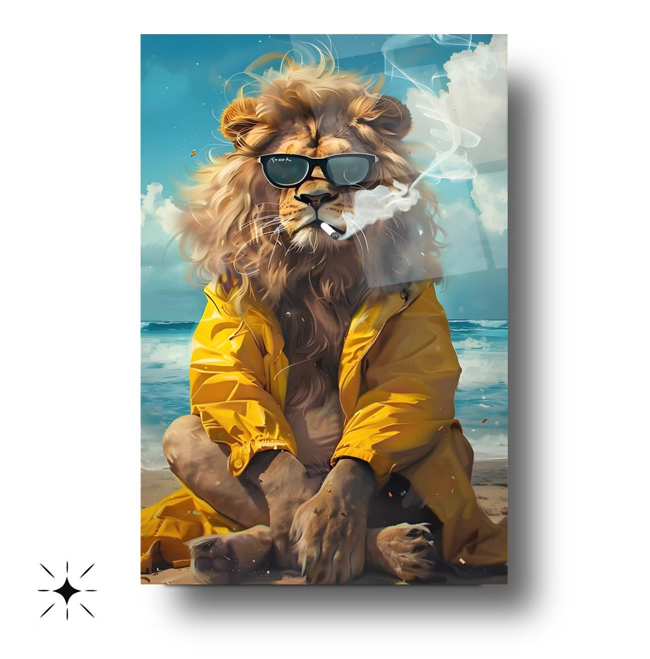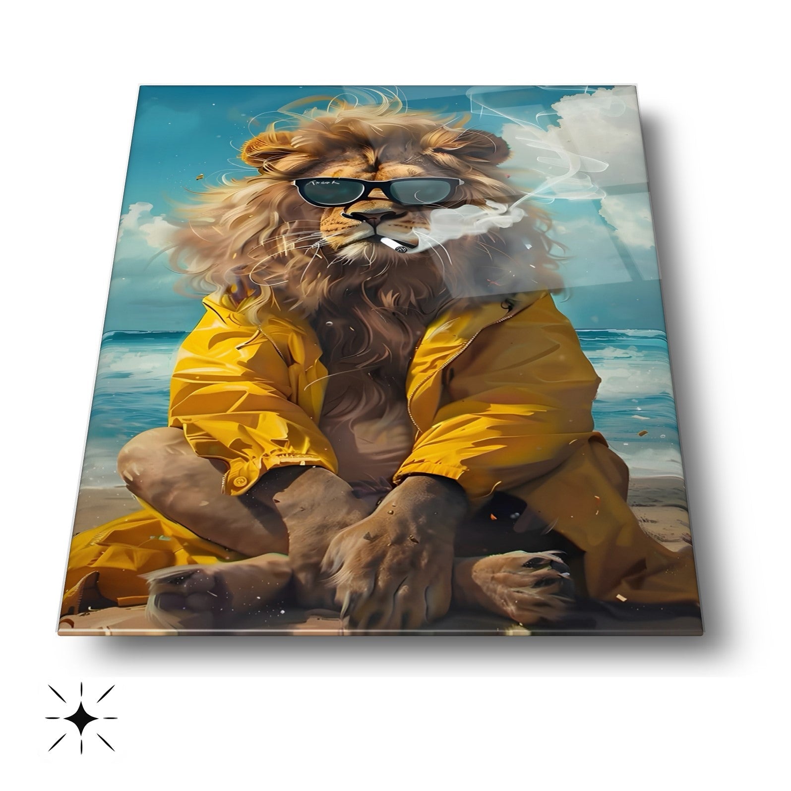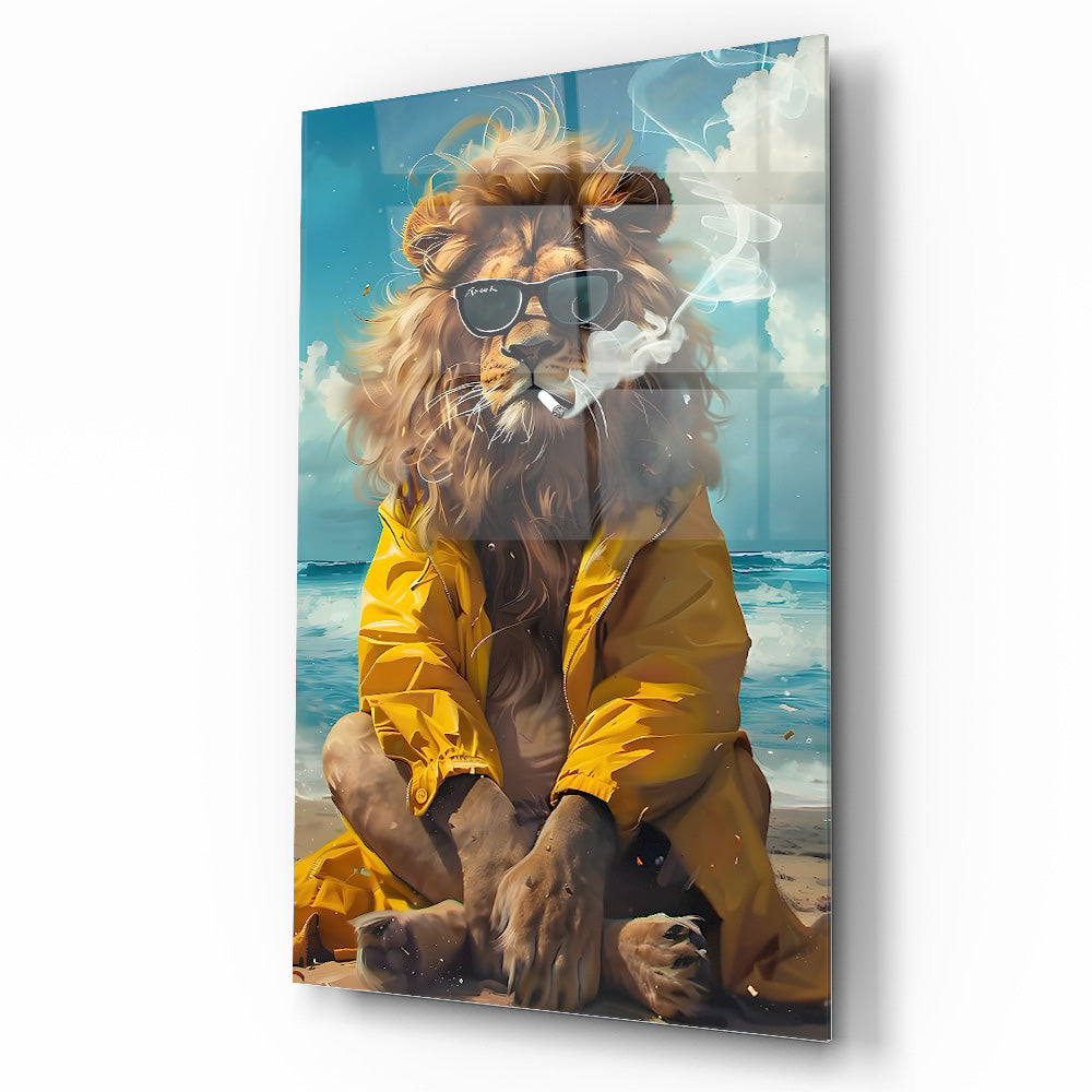 CamDeko'dan ev ve iş yerlerinize özgünlük ve eğlence katan özel bir eser: Sarı Elbiseli Deniz Kenarında Aslan Gözlüklü Aslan Kırılmaz Modern Temperli Gerçek Cam Tablo! Denizin esintisiyle dans eden, sarı elbiseli ve gözlüklü aslan figürünün esprili ve modern duruşuyla yaşam alanlarınıza benzersiz bir atmosfer katın.
