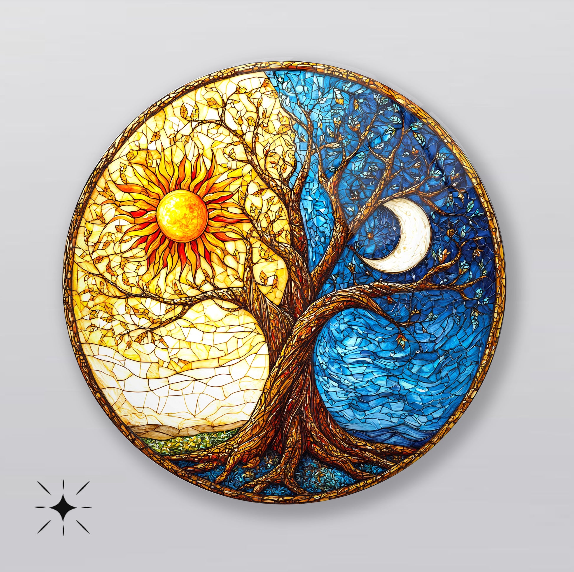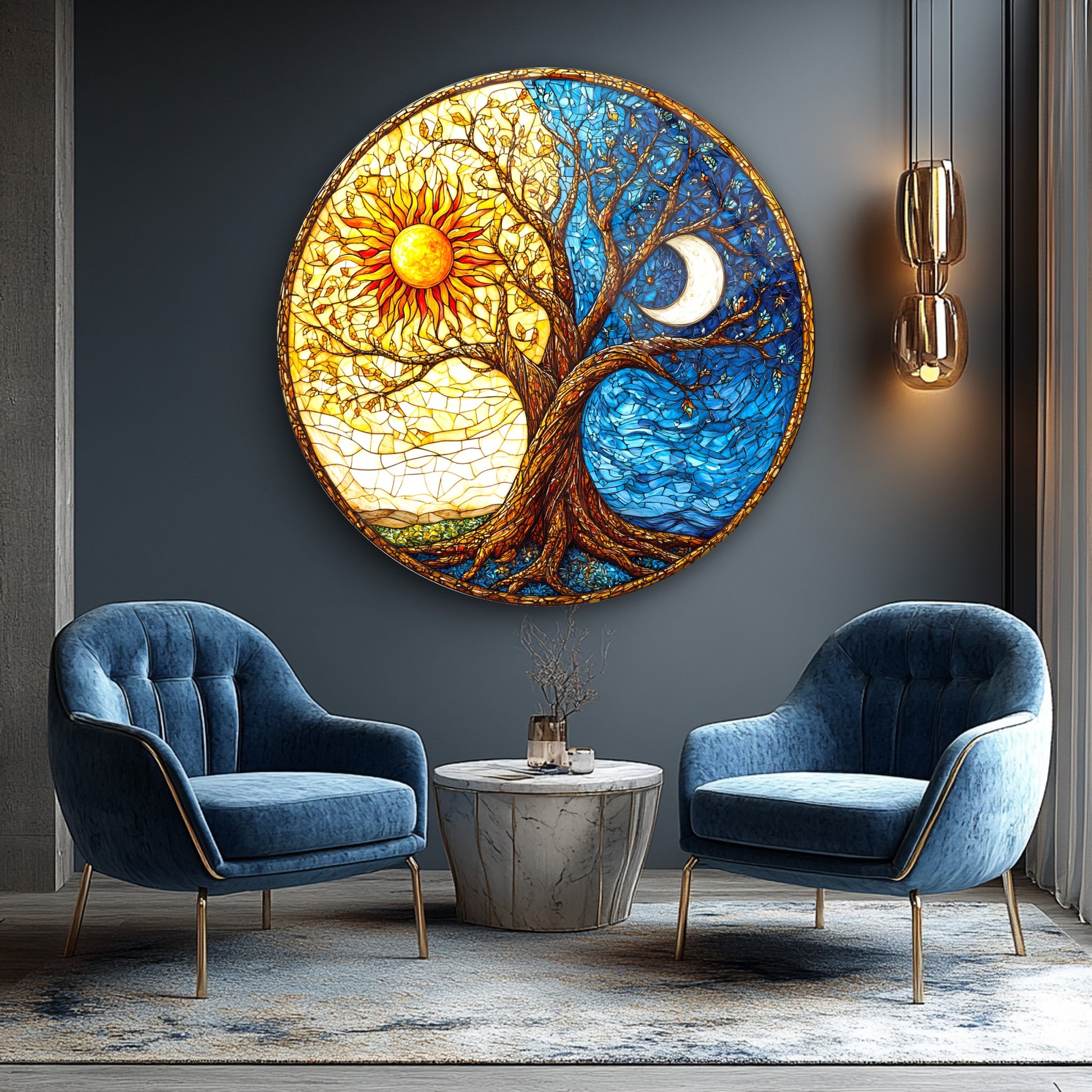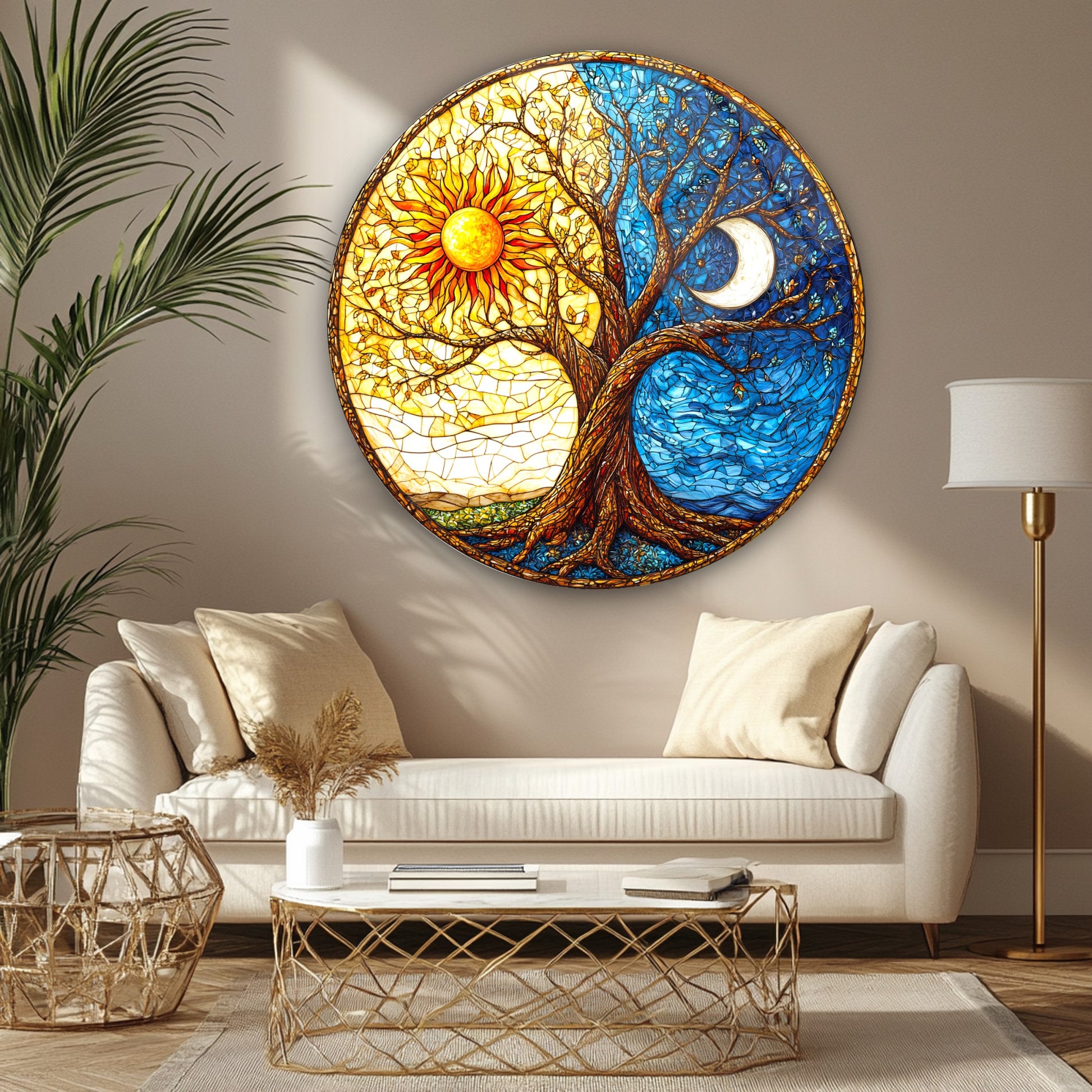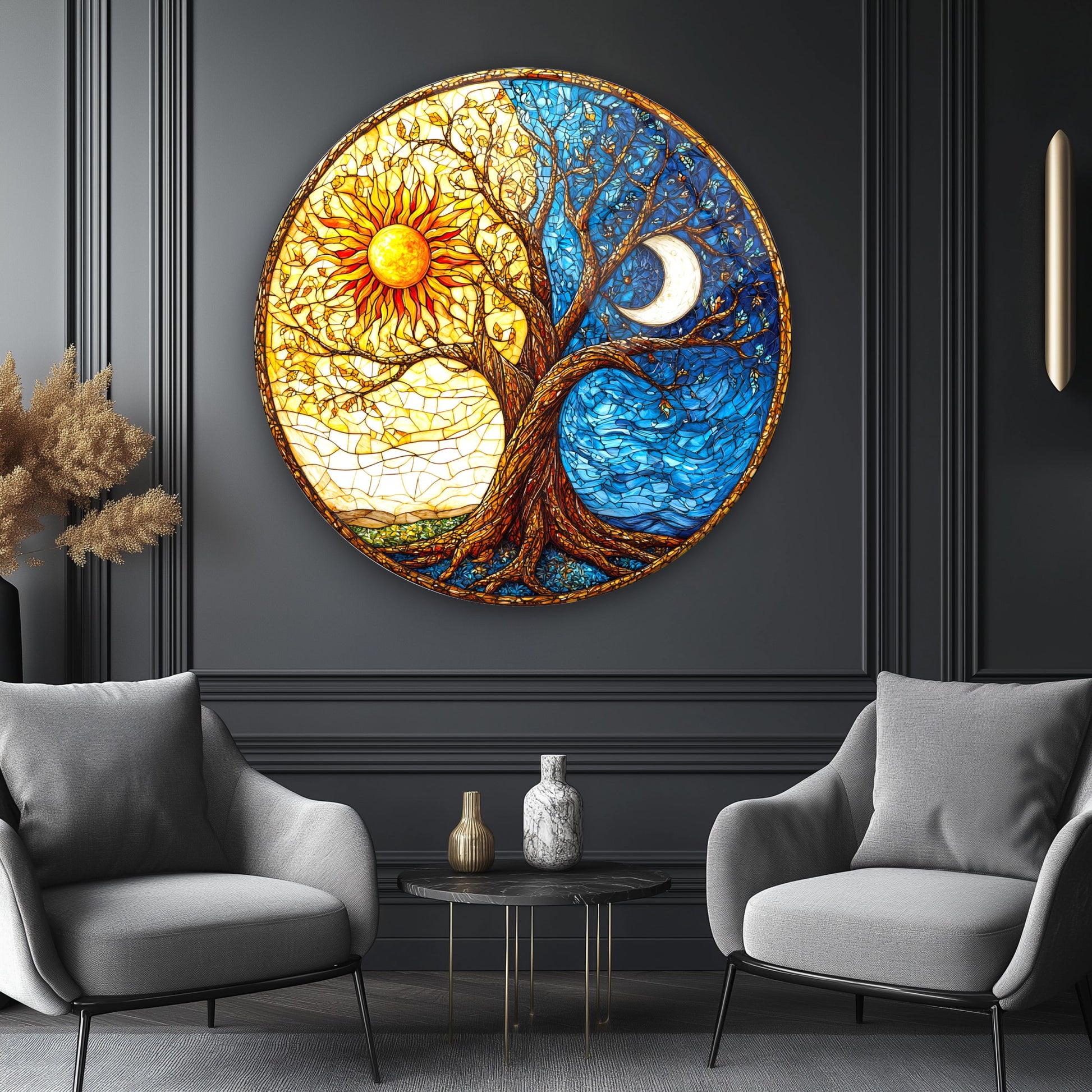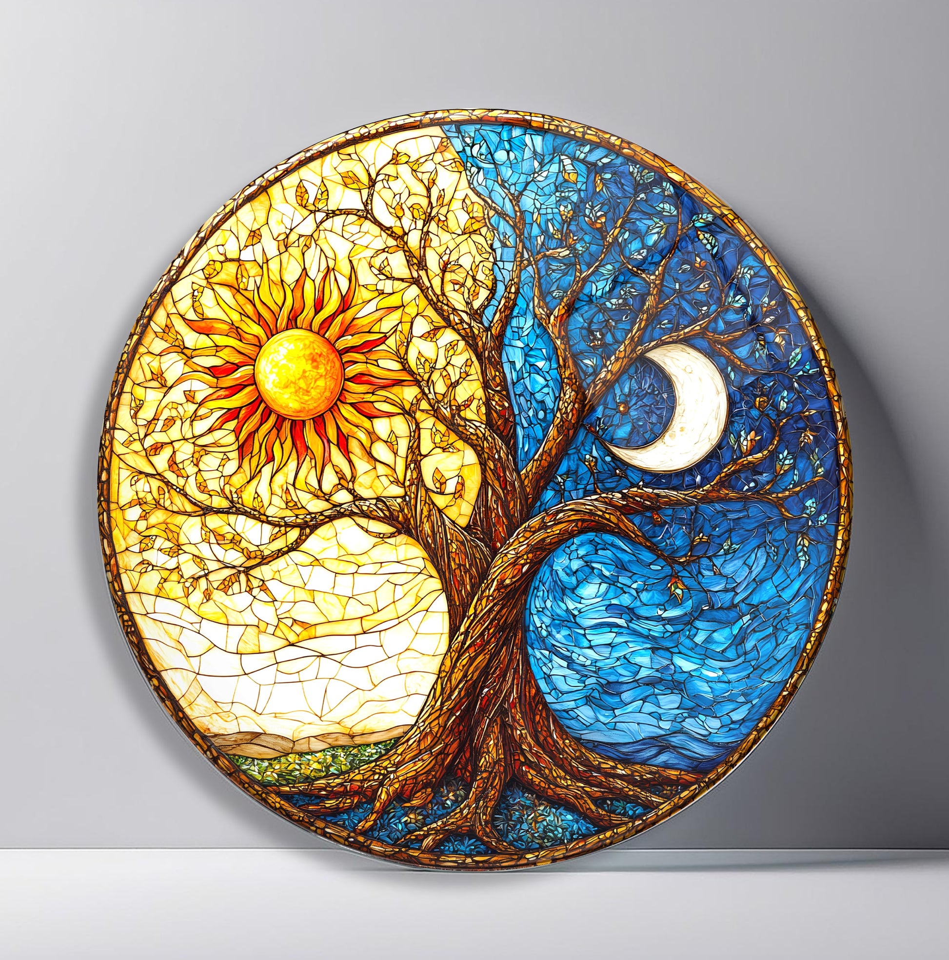 Vitray Desen Gece Gündüz Hayat Ağacı Yuvarlak Cam Tablo