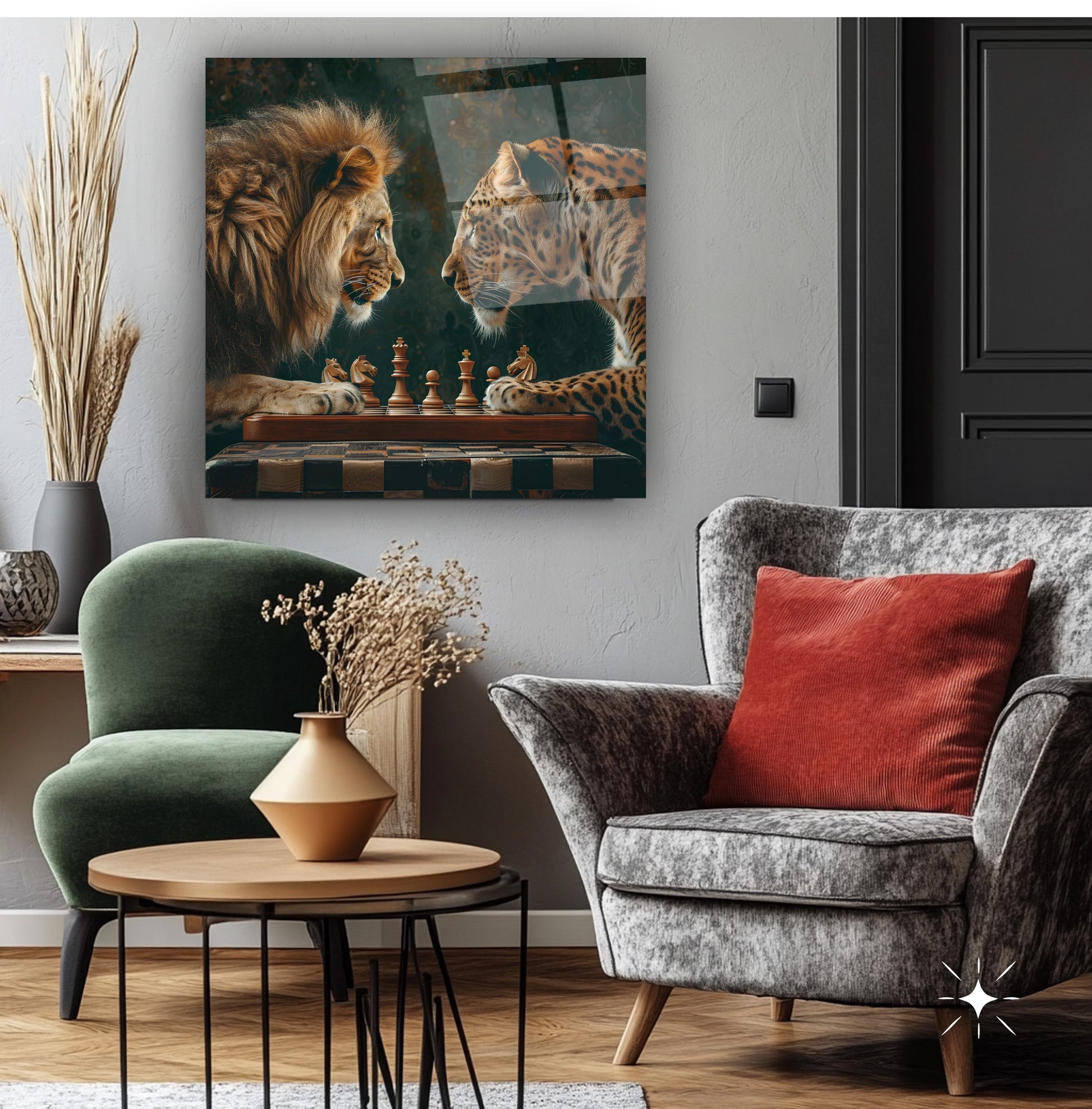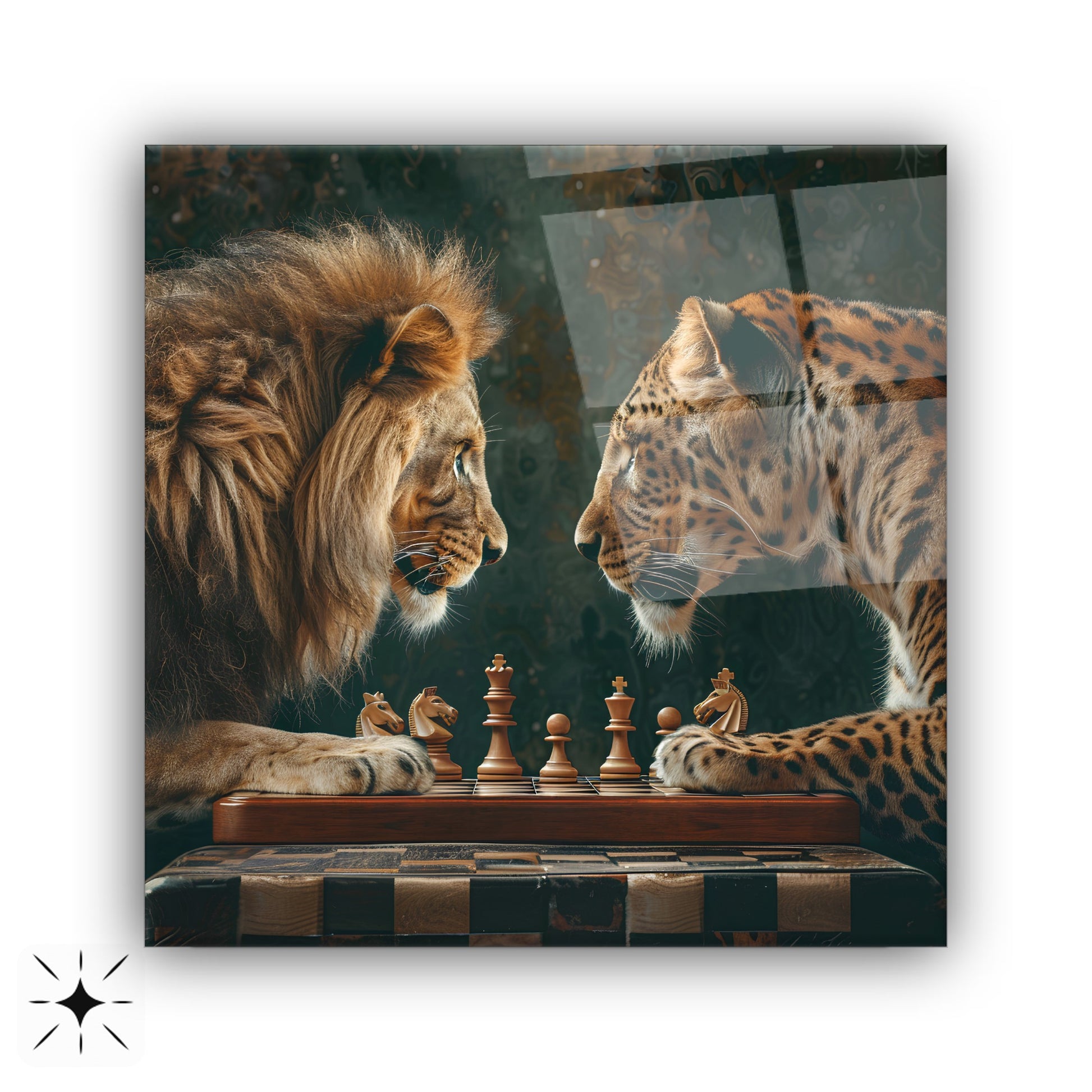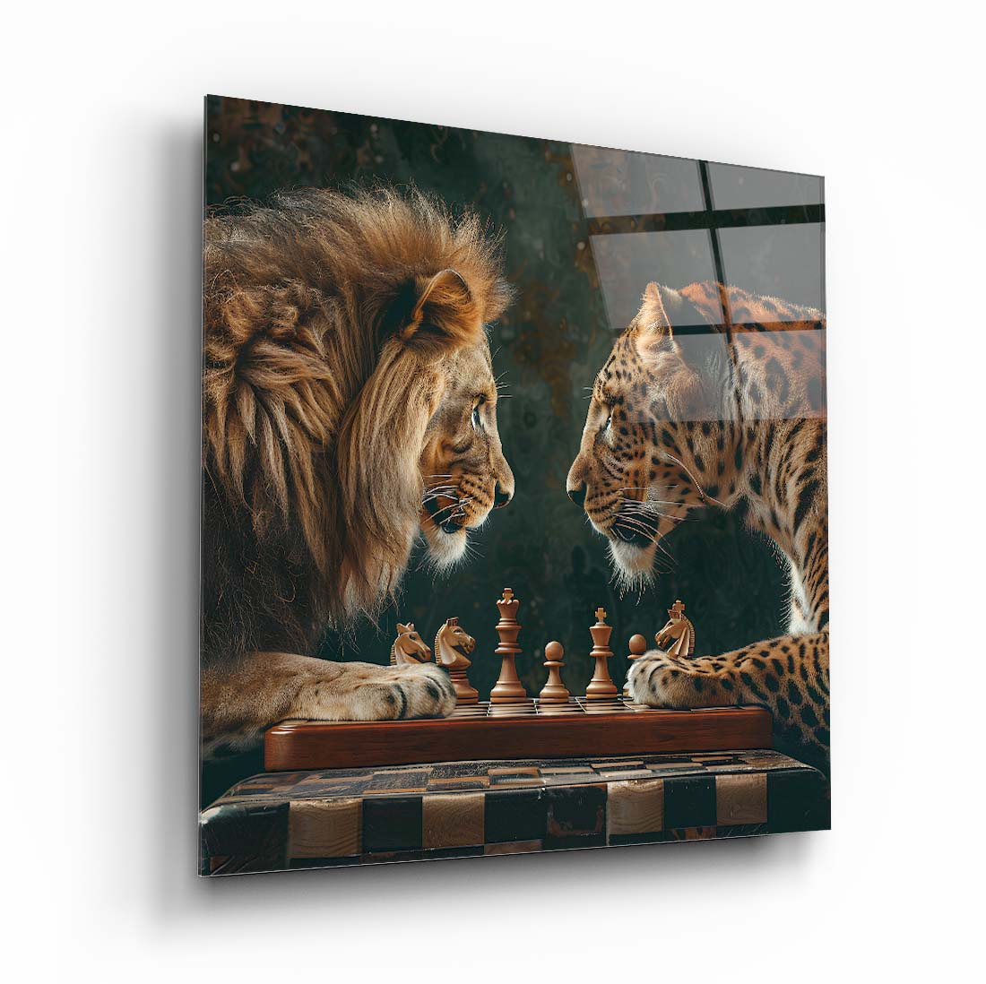 Satranç Oynayan Aslan ve Kaplan Cam Tablo