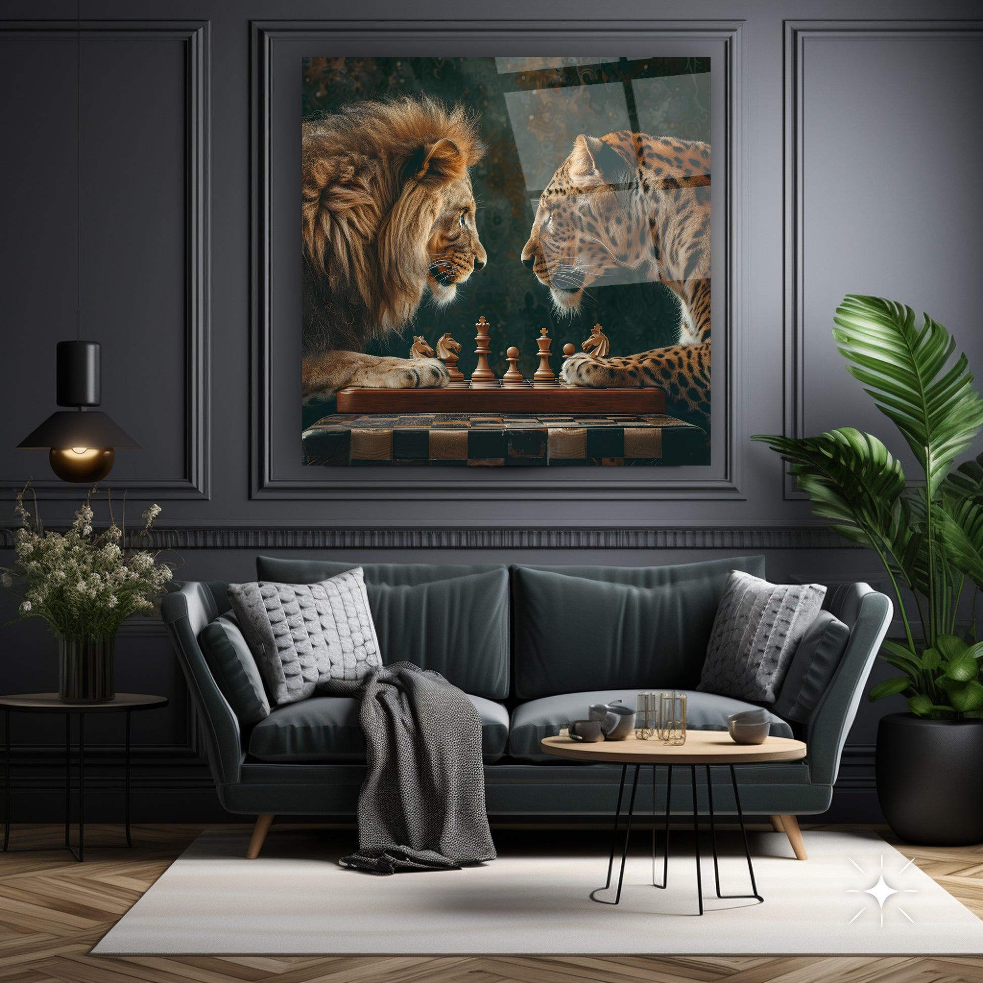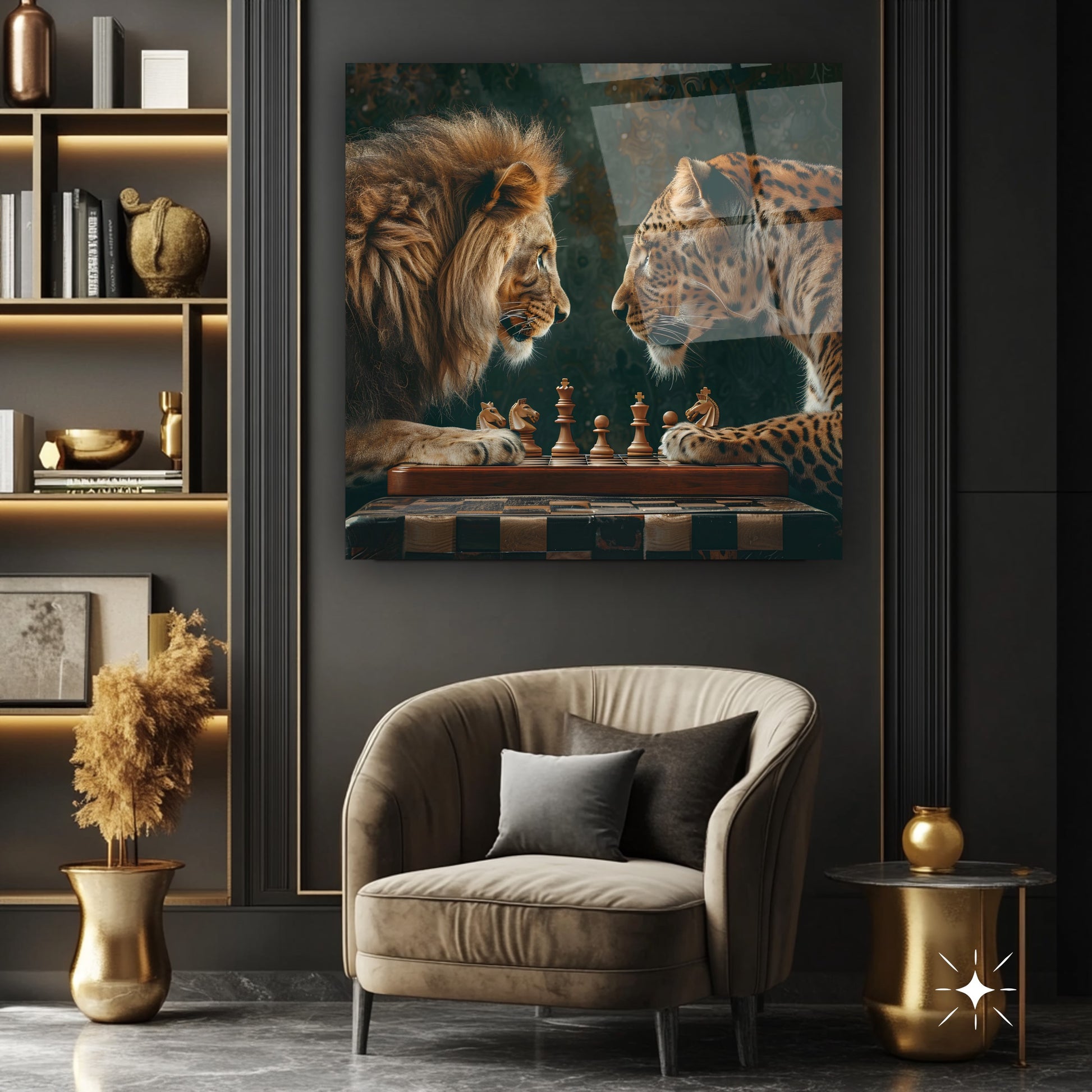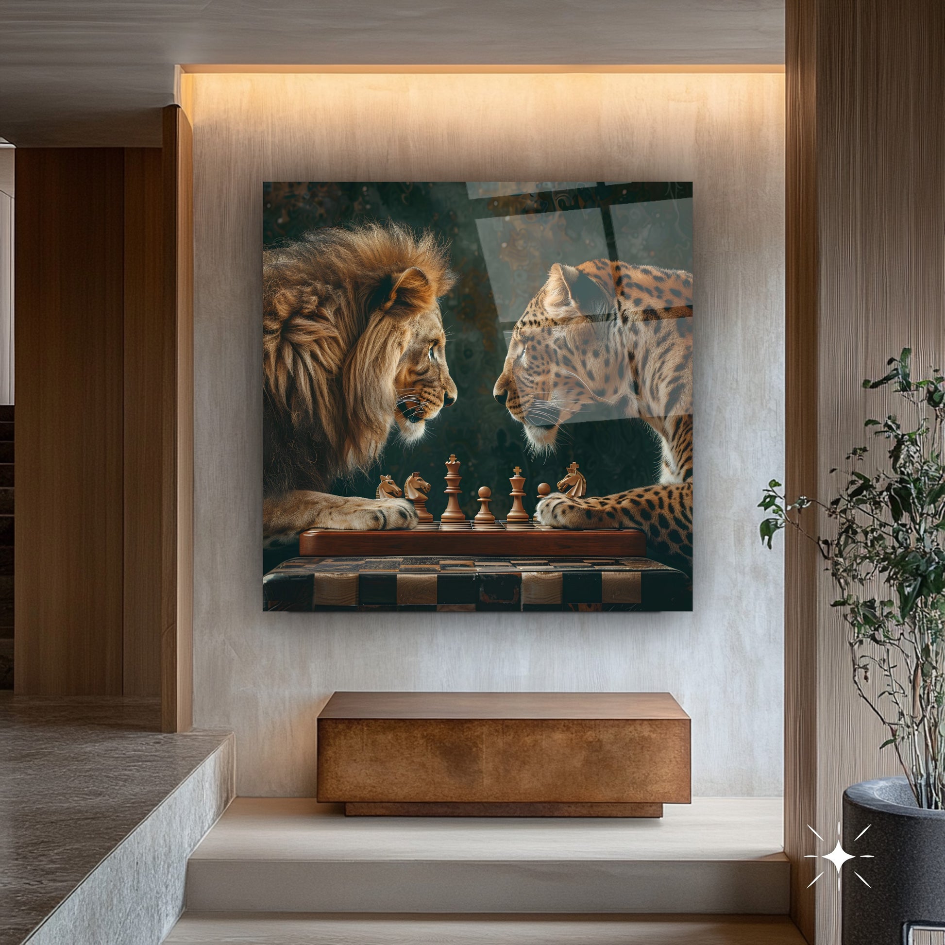 Satranç Oynayan Aslan ve Kaplan Cam Tablo