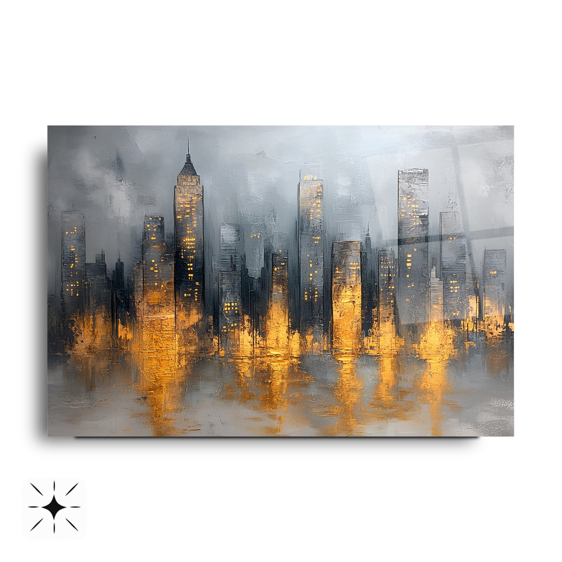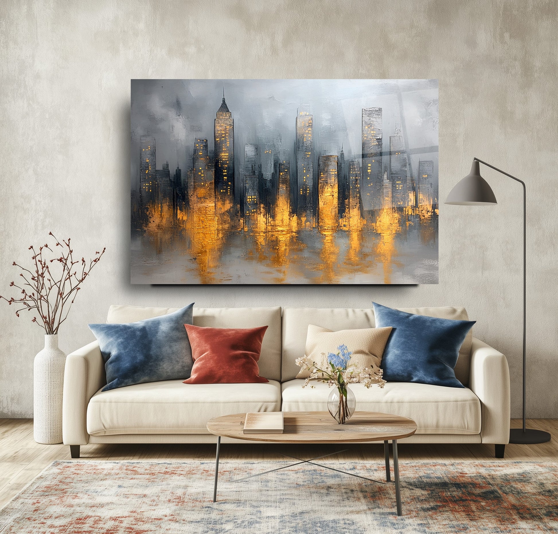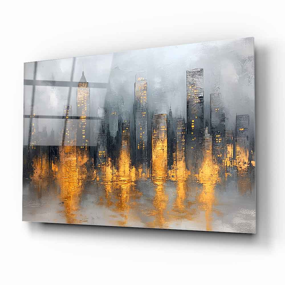 Gold ve gri tonların uyumuyla tasarlanan şehir silueti, bu gerçek cam tabloya modern ve sofistike bir hava katar. Kırılmaz cam tablo yapısıyla dayanıklı ve estetik bir dekorasyon seçeneği sunar. Ofis ve yaşam alanlarında şıklık ve zarafet arayanlar için ideal bir cam tablo tercihidir.