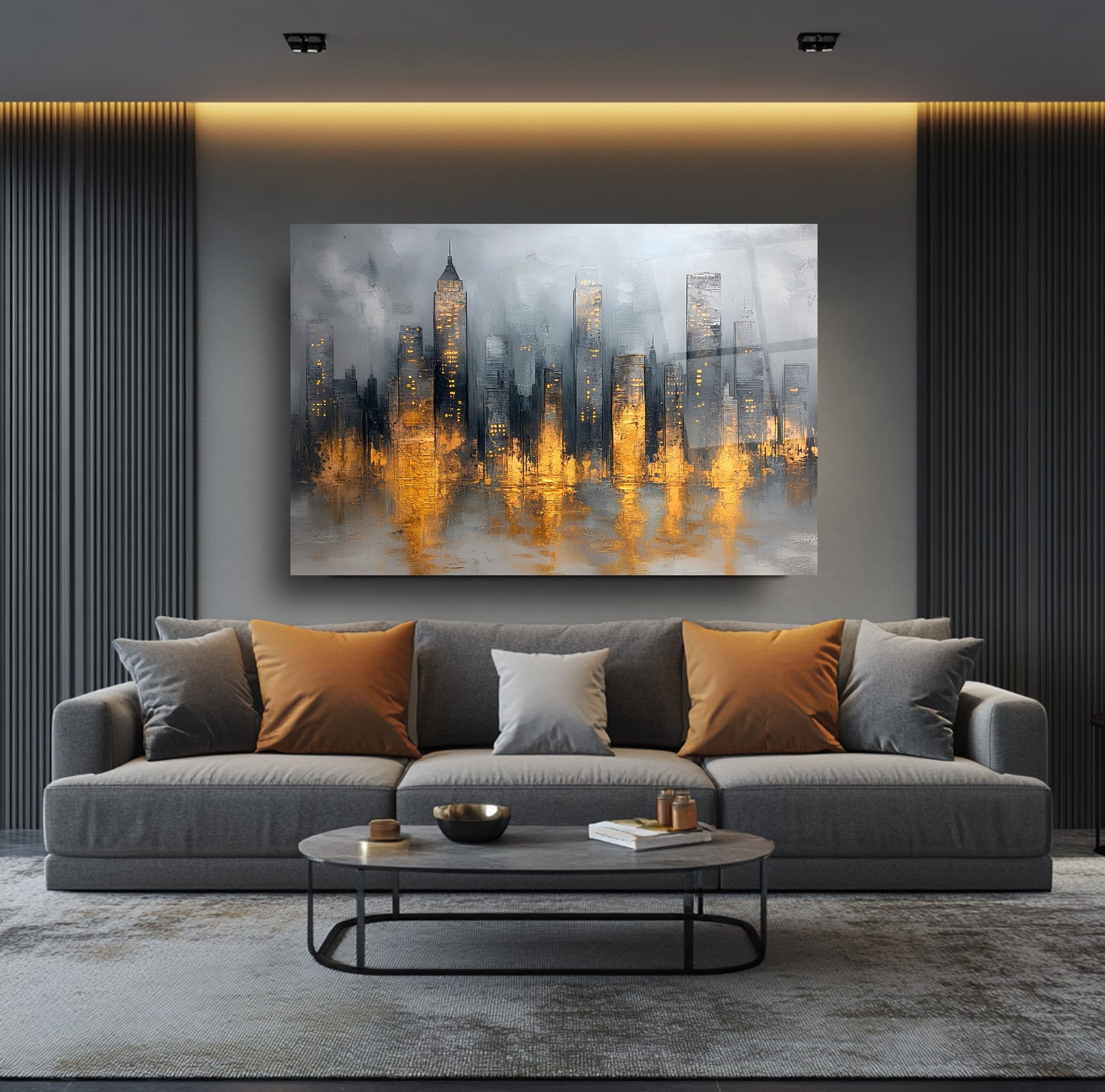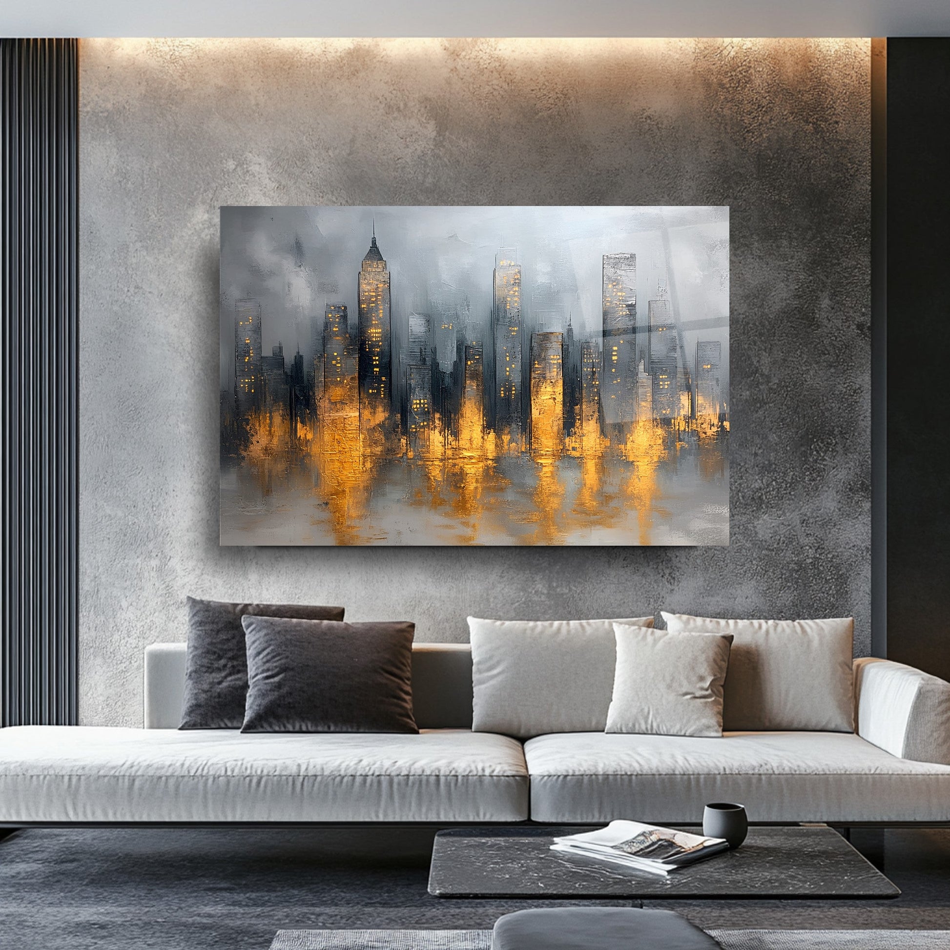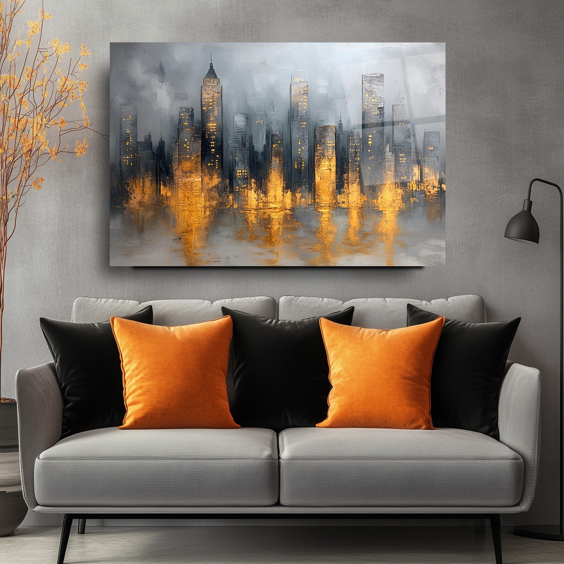 Gold ve gri tonların uyumuyla tasarlanan şehir silueti, bu gerçek cam tabloya modern ve sofistike bir hava katar. Kırılmaz cam tablo yapısıyla dayanıklı ve estetik bir dekorasyon seçeneği sunar. Ofis ve yaşam alanlarında şıklık ve zarafet arayanlar için ideal bir cam tablo tercihidir.