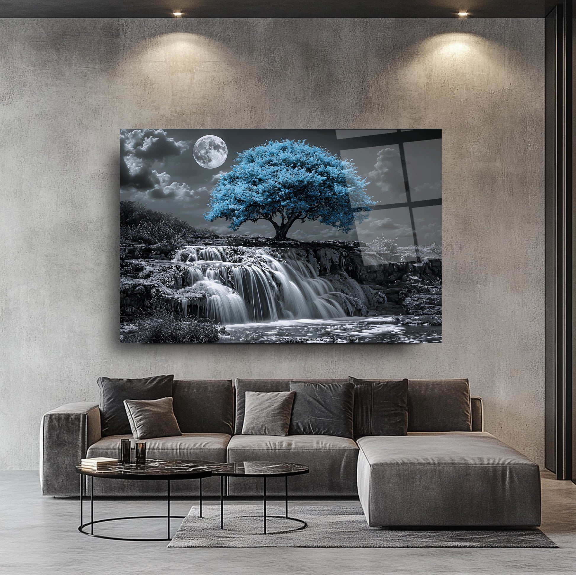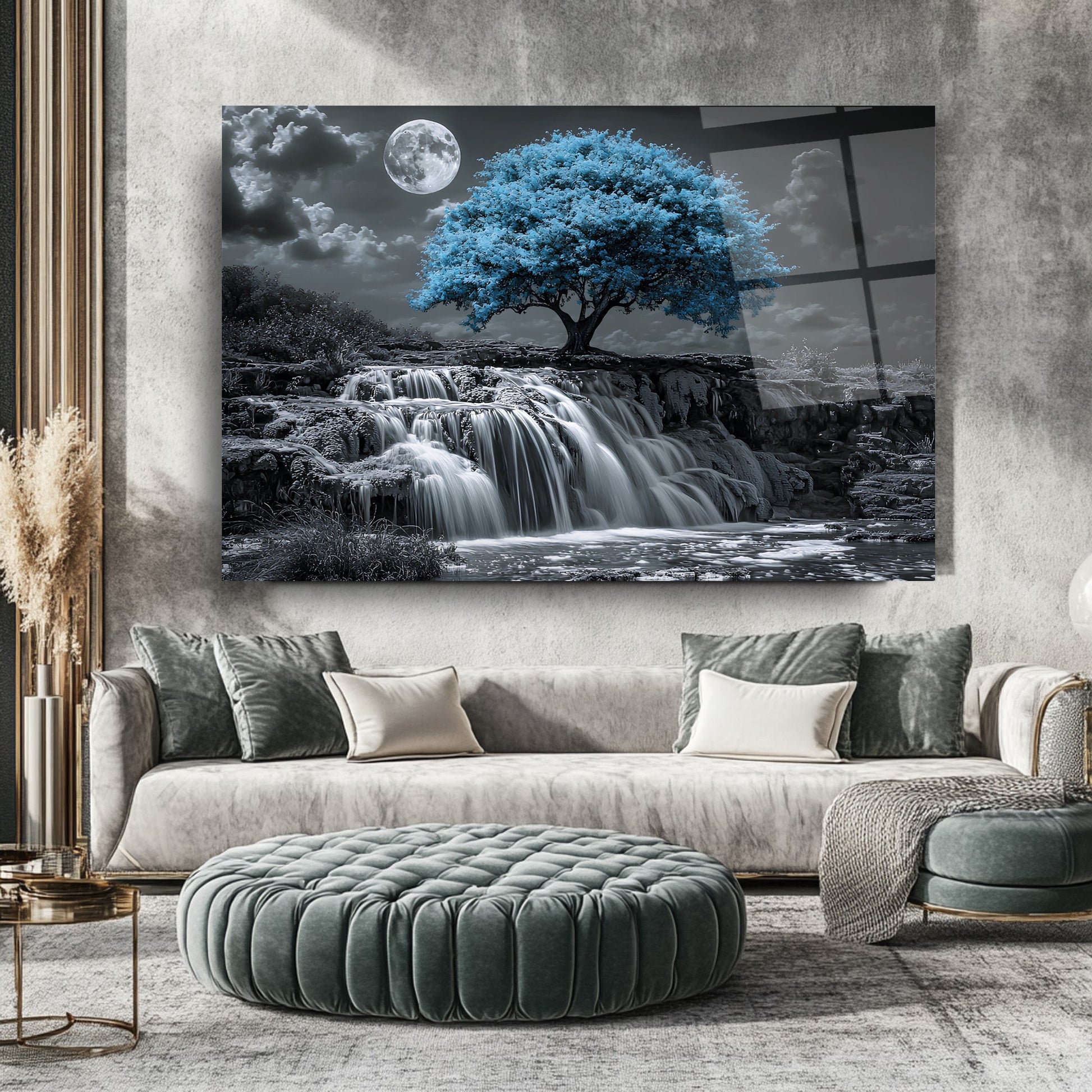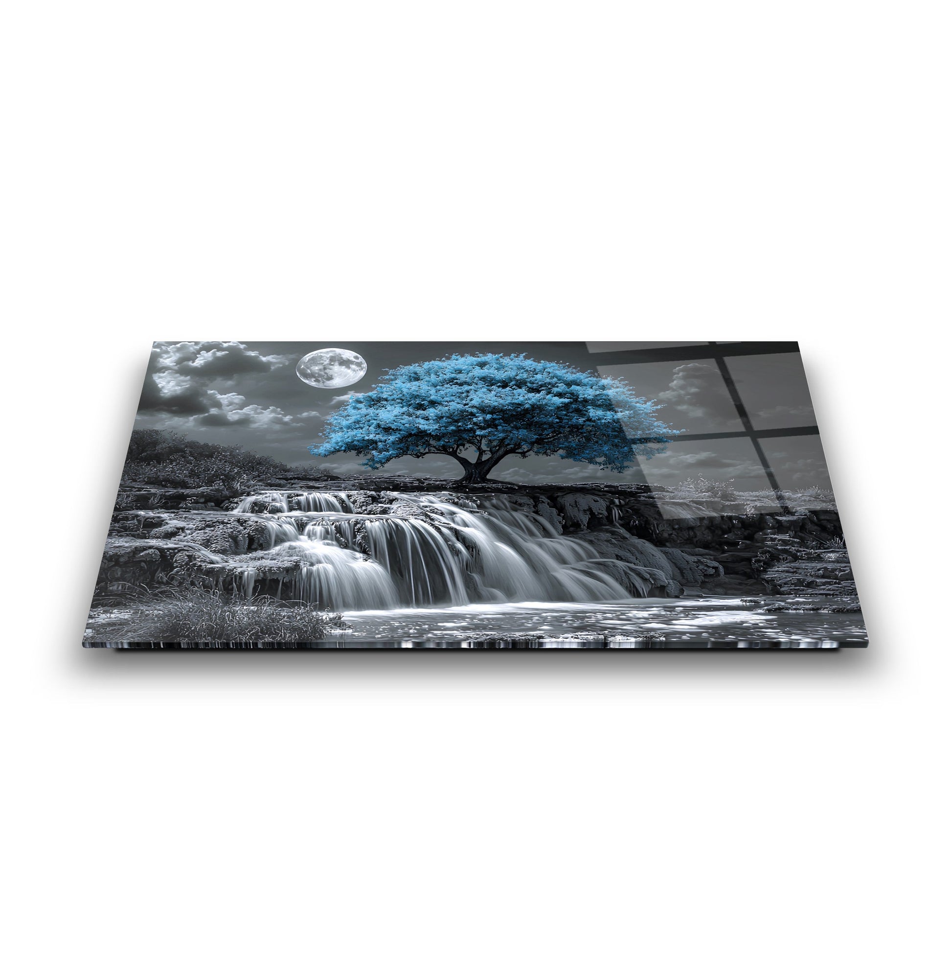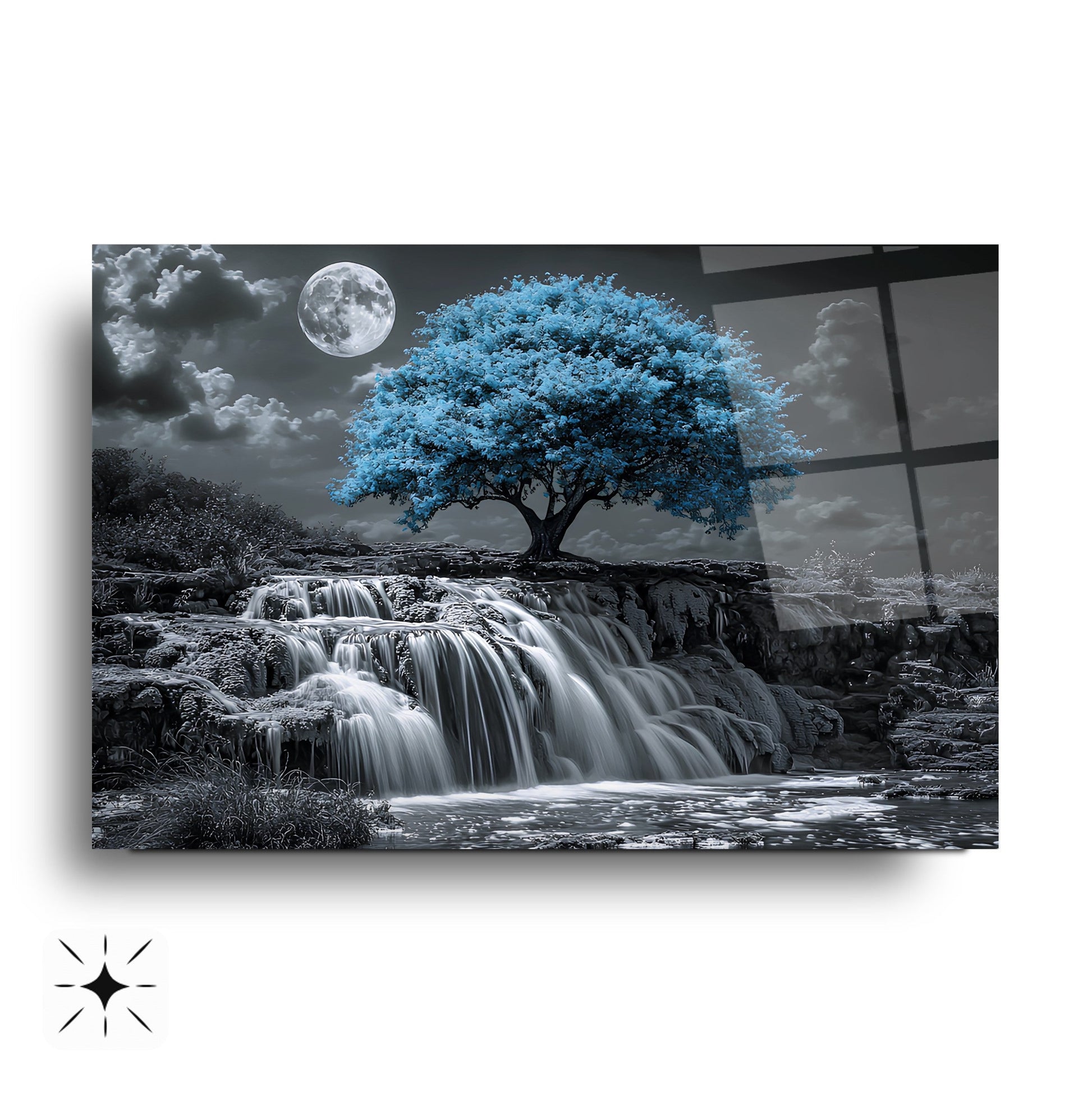 Gece mavisinin derin tonlarında parlayan dolunay, mistik bir hayat ağacının gövdesine yansırken alt kısımdan akan şelale tasarımı tabloya dingin bir atmosfer kazandırıyor. Doğayla bütünleşmiş bu sanatsal kompozisyon, yatak odası, salon veya meditasyon alanlarında huzur verici bir vurgu yaratır. Temperli cam yüzey ve UV baskı sayesinde renkler canlılığını uzun süre korur. Modern, çerçevesiz tasarımıyla hem estetik hem de kalıcı bir dekoratif çözüm sunar. Cam tablo ve doğa temalı cam baskı arayanlar için ideal bir seçimdir.