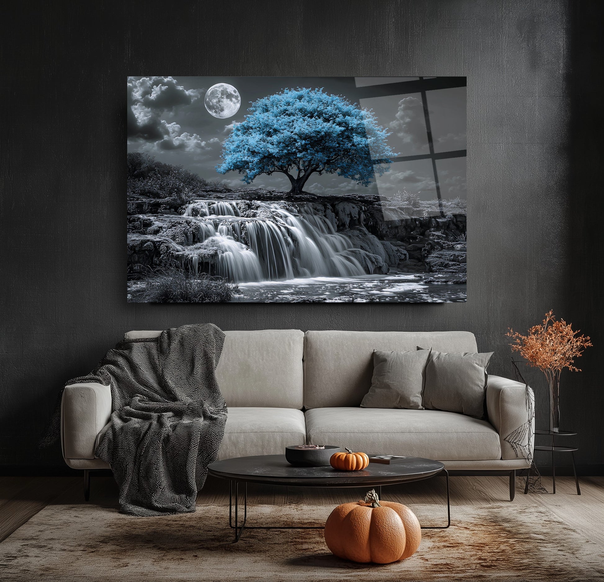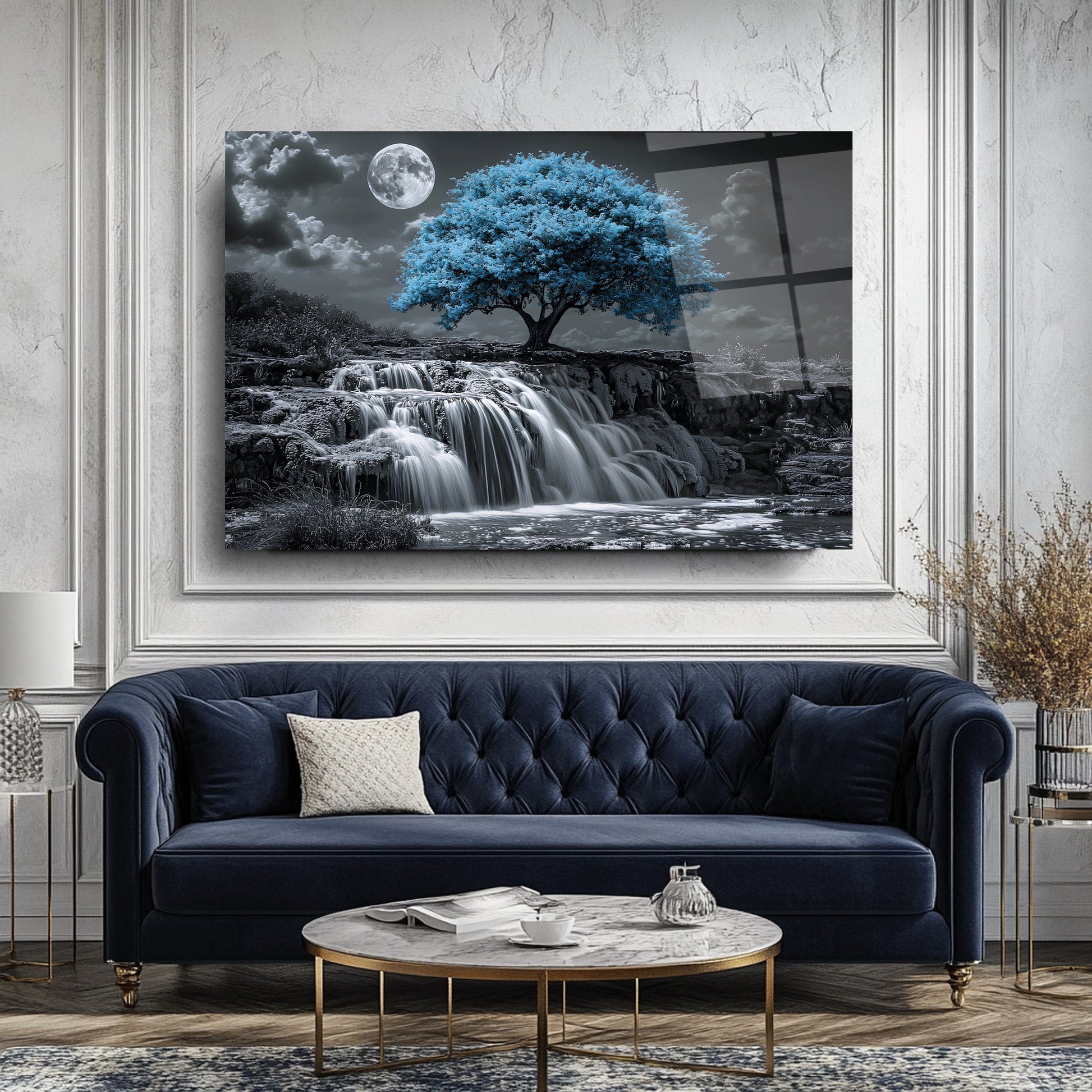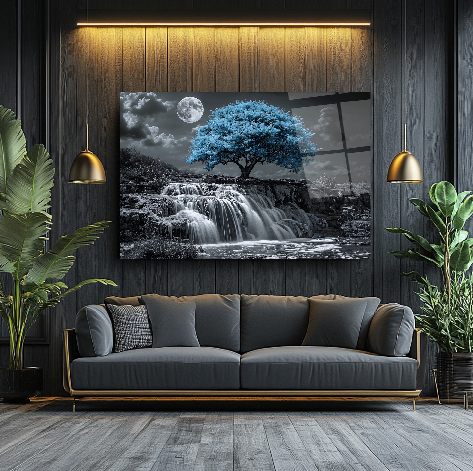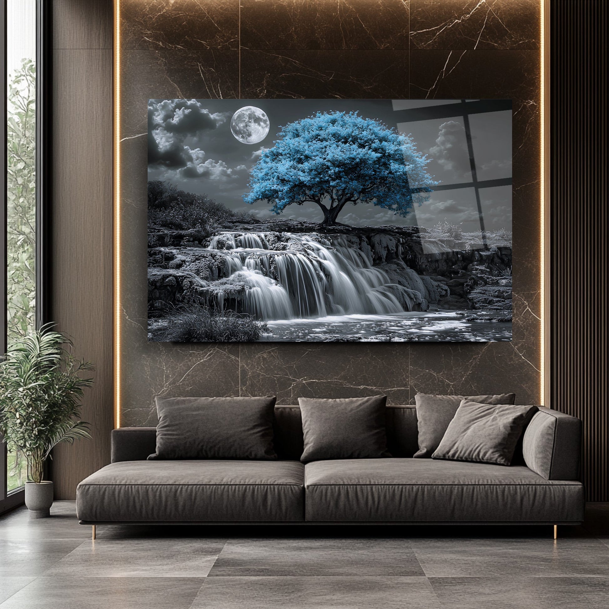 Gece mavisinin derin tonlarında parlayan dolunay, mistik bir hayat ağacının gövdesine yansırken alt kısımdan akan şelale tasarımı tabloya dingin bir atmosfer kazandırıyor. Doğayla bütünleşmiş bu sanatsal kompozisyon, yatak odası, salon veya meditasyon alanlarında huzur verici bir vurgu yaratır. Temperli cam yüzey ve UV baskı sayesinde renkler canlılığını uzun süre korur. Modern, çerçevesiz tasarımıyla hem estetik hem de kalıcı bir dekoratif çözüm sunar. Cam tablo ve doğa temalı cam baskı arayanlar için ideal bir seçimdir.