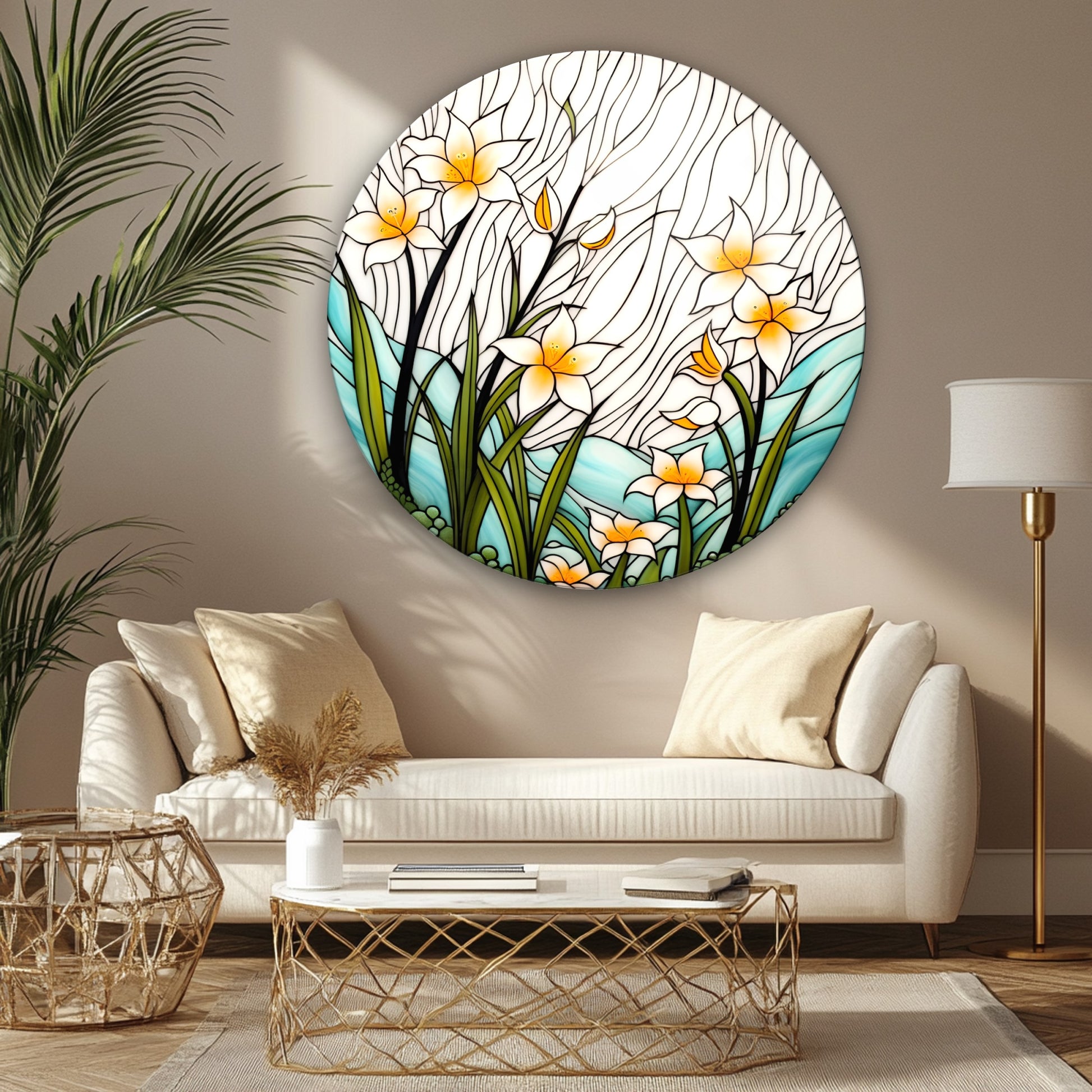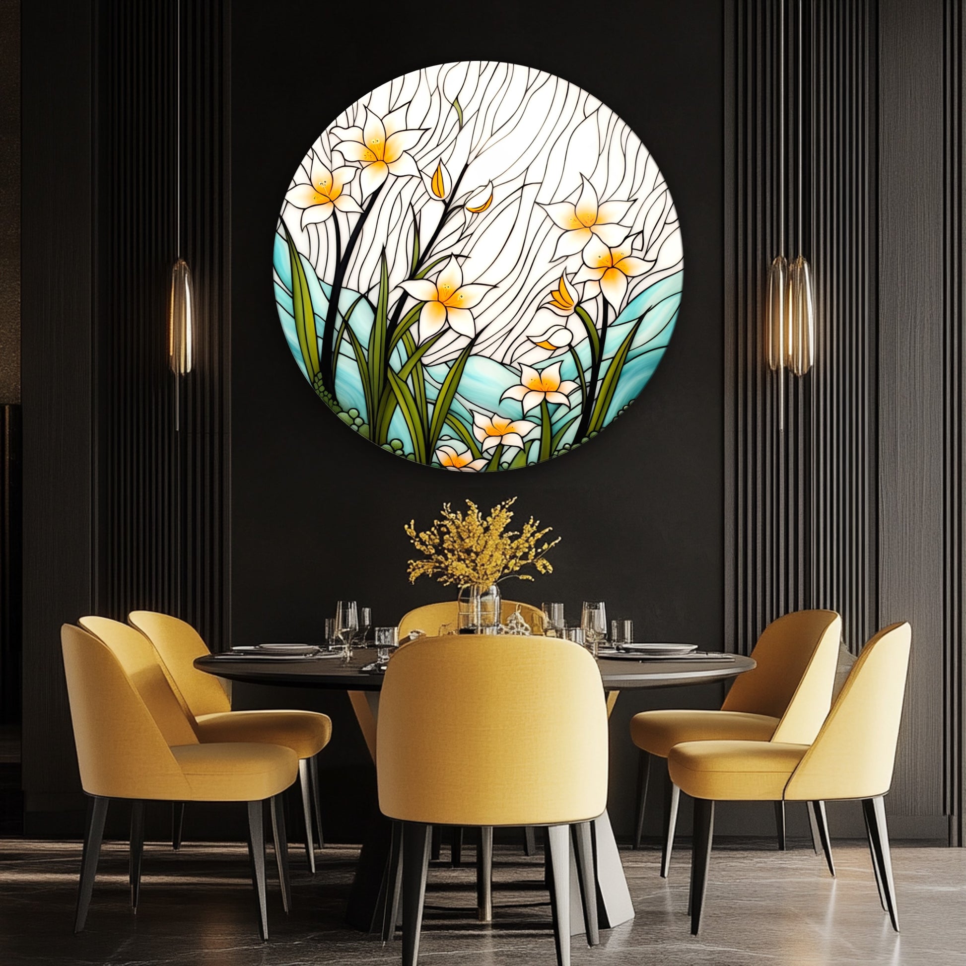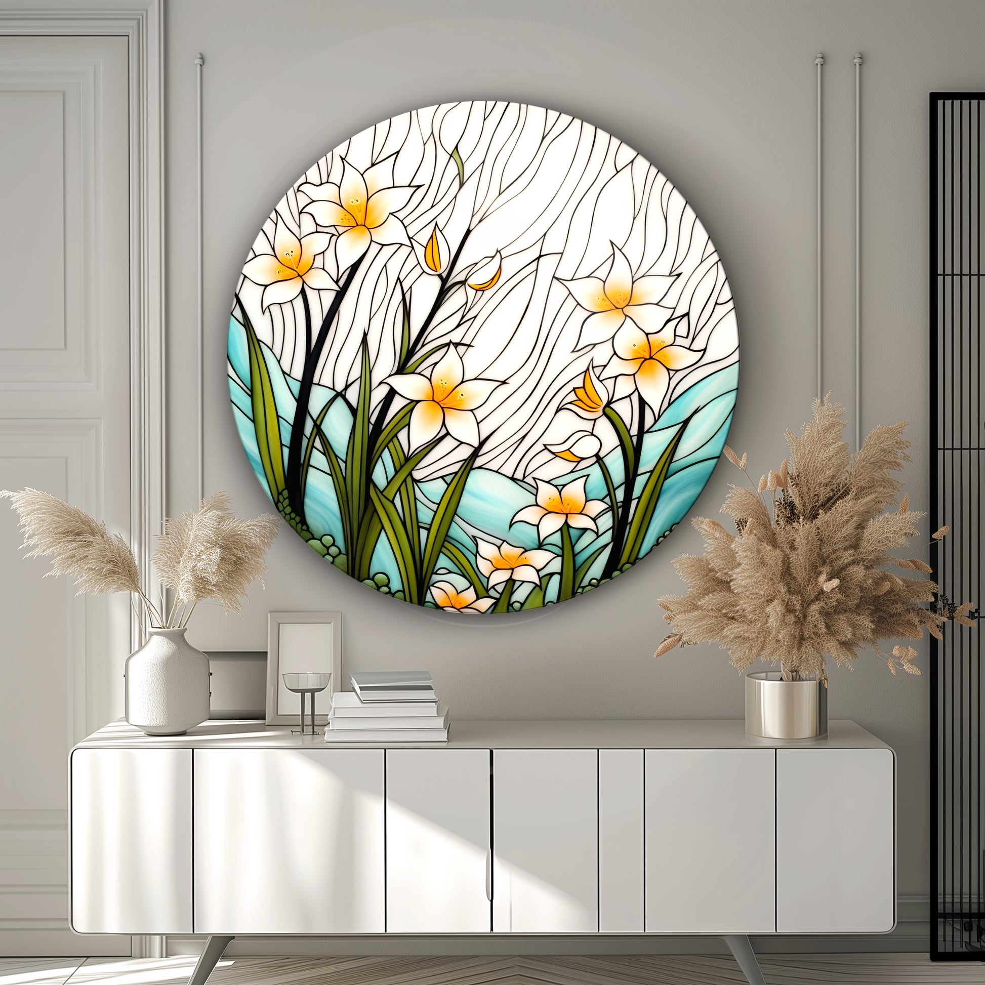 Seramik Desen Beyaz Çiçekler Yuvarlak Cam Tablo