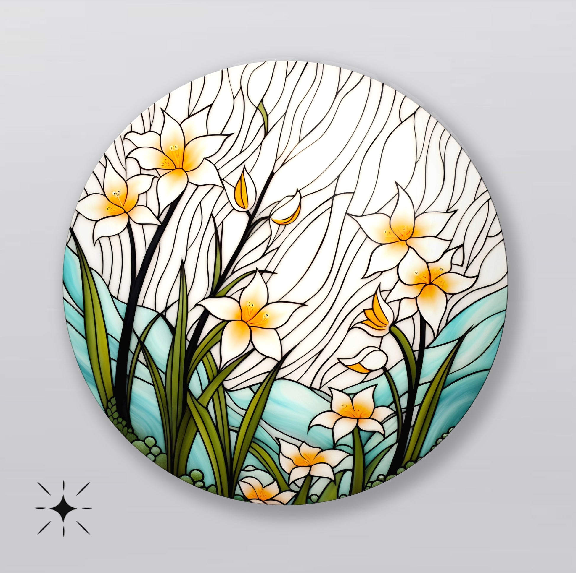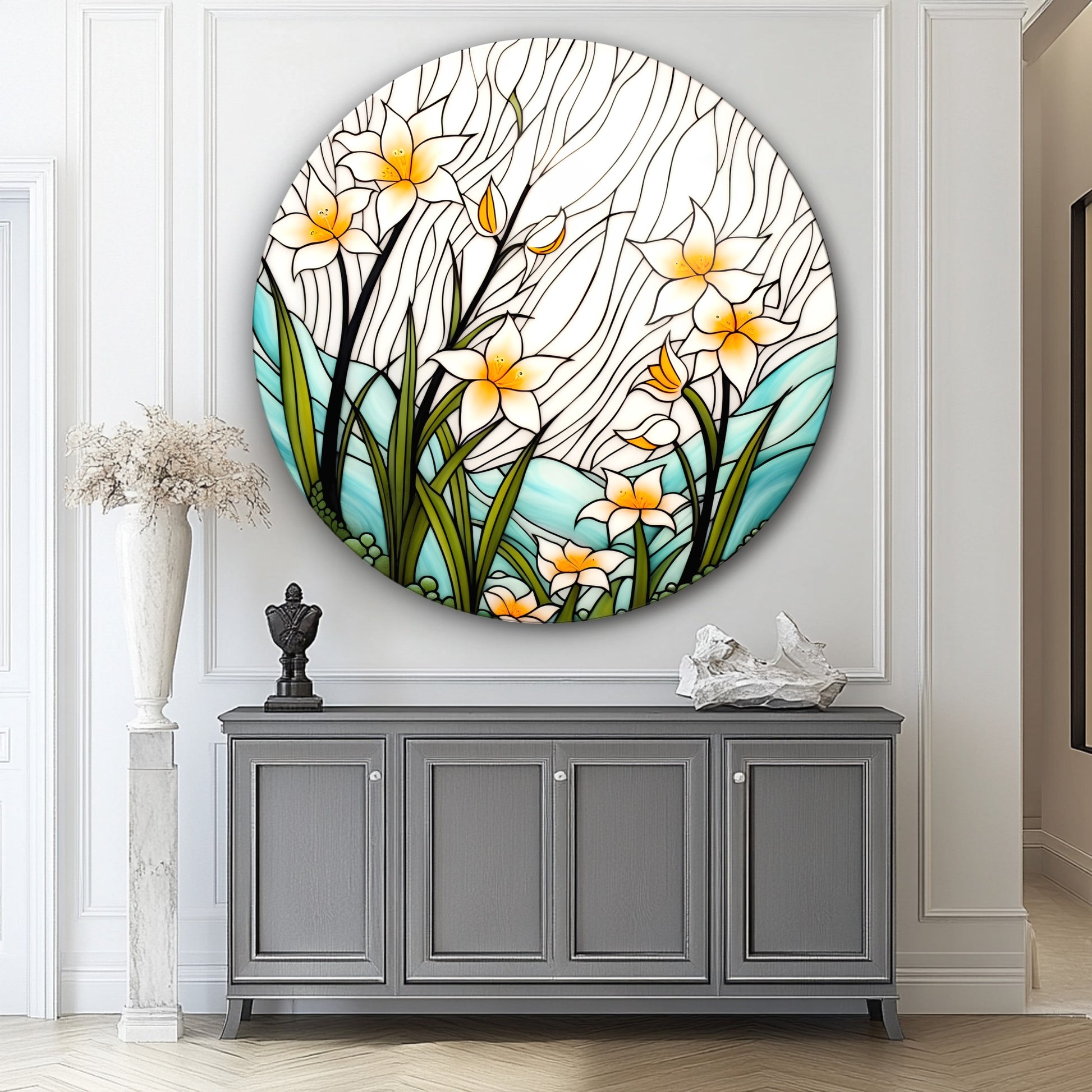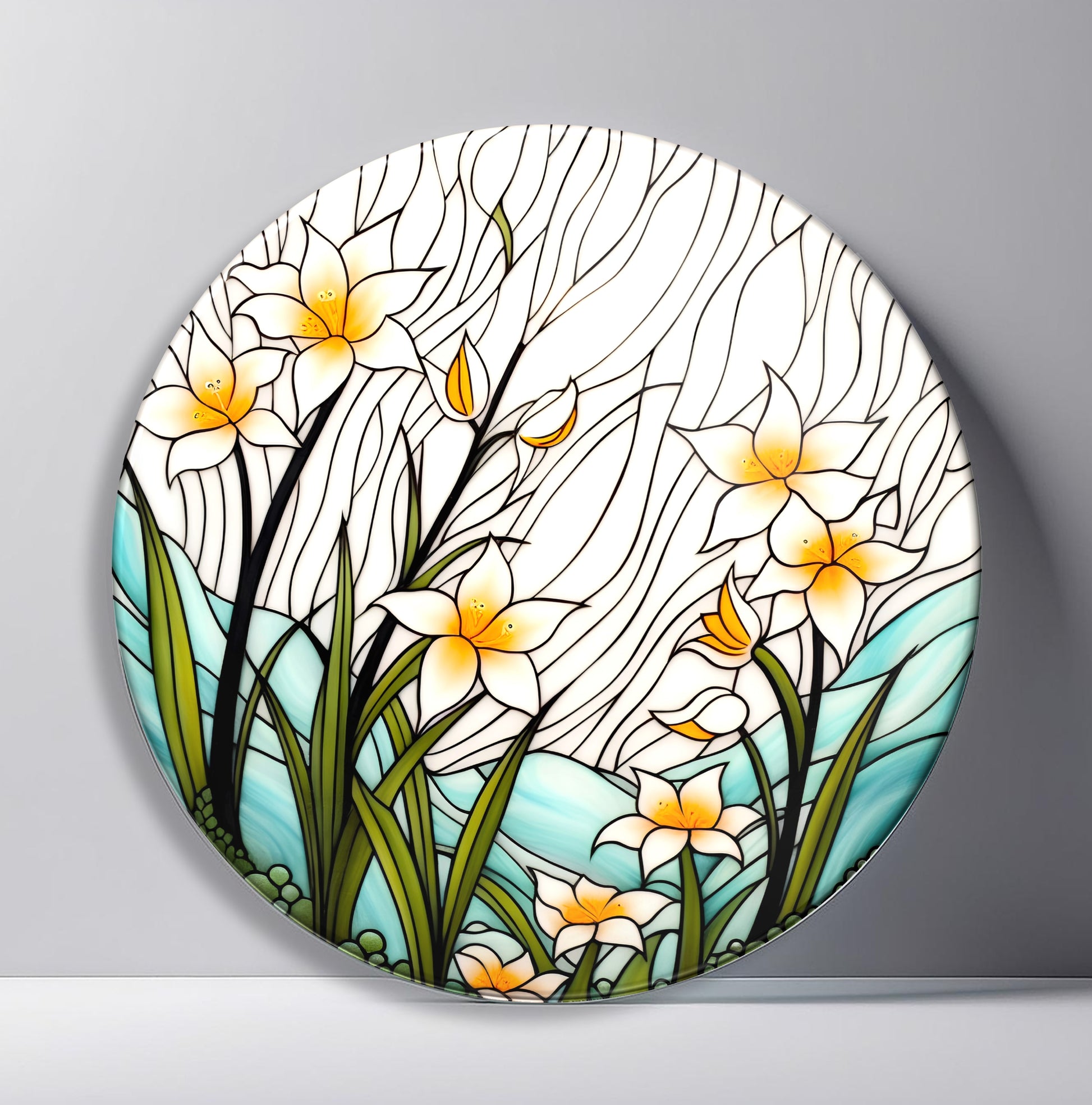 Seramik Desen Beyaz Çiçekler Yuvarlak Cam Tablo