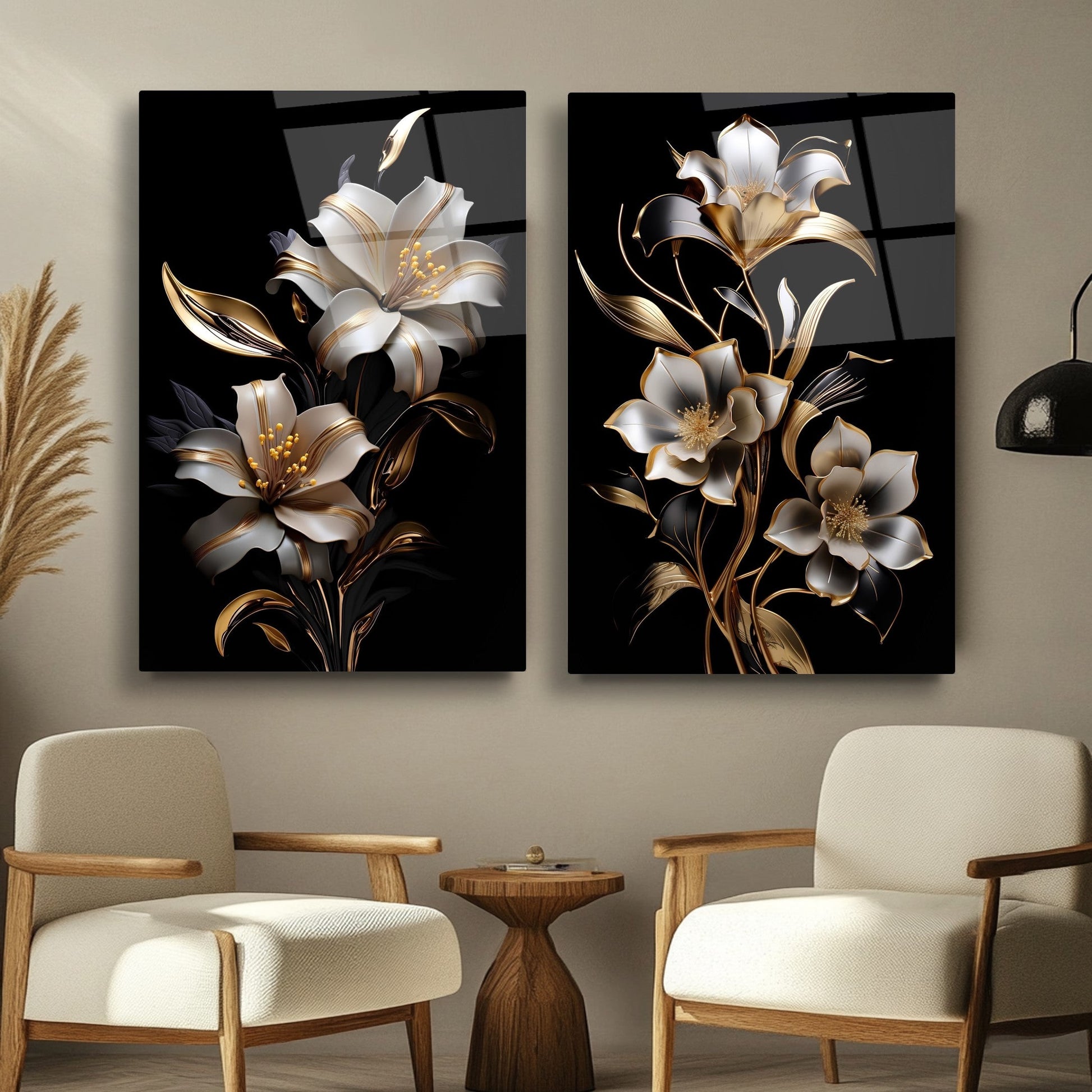 Beyaz Gold Çiçekler İkili Set Cam Tablo