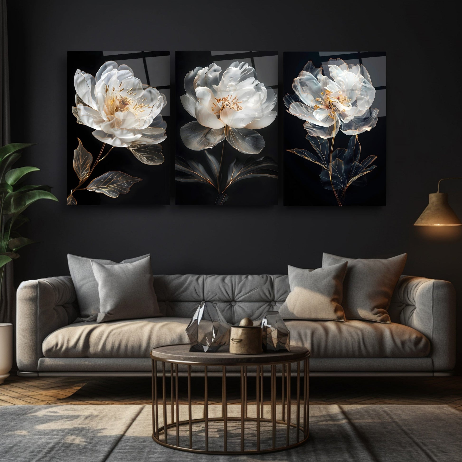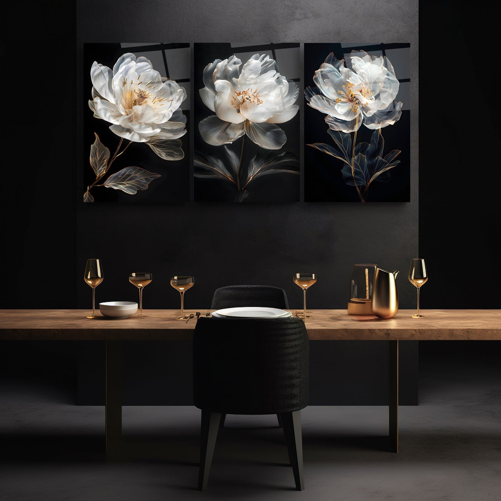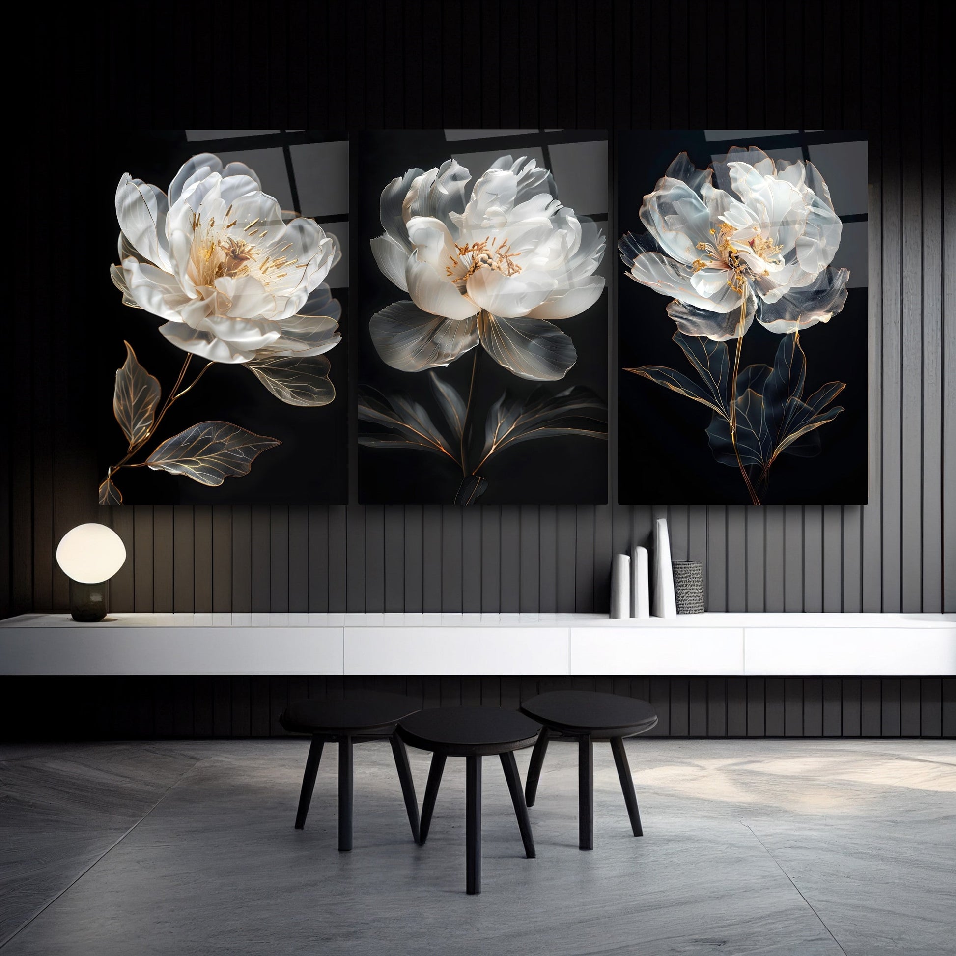 Siyah arka plan üzerine beyaz ve gold detaylarla tasarlanan bu üçlü cam tablo seti, güçlü kontrastı ve modern çizgileriyle dikkat çeker. Lüks ve sofistike bir atmosfer yaratmak isteyenler için ideal olan bu tasarım, özellikle ofis, salon ve giriş alanlarında etkileyici bir vurgu sunar. UV baskı teknolojisiyle canlı ve net desenler sunan tablo, kırılmaz temperli cam yüzeyi sayesinde uzun ömürlü ve dayanıklıdır. Modern cam baskı sanatının en şık örneklerinden biri olan bu set, dekorasyona derinlik ve zarafet katmak isteyenler için özel bir seçimdir.