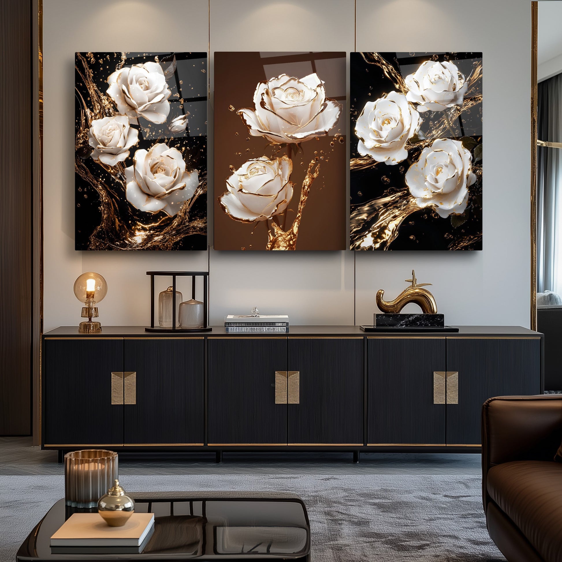 Siyah arka plan üzerinde gold ve beyaz detaylarla üç boyutlu etki yaratan bu modern üçlü cam tablo seti, mekânınıza lüks ve sofistike bir hava katar. Kırılmaz temperli cam ve UV baskı teknolojisiyle üretilen tablolar, dayanıklılık ve parlak renkler sunar. Ofis, salon veya çalışma alanlarında kullanıma uygundur. Minimalist ama etkileyici tasarımıyla hem modern dekorasyonları tamamlar hem de dikkat çekici bir odak noktası oluşturur. Cam tablo ile yaşam alanlarınıza şıklık ve kaliteyi bir arada getirir.