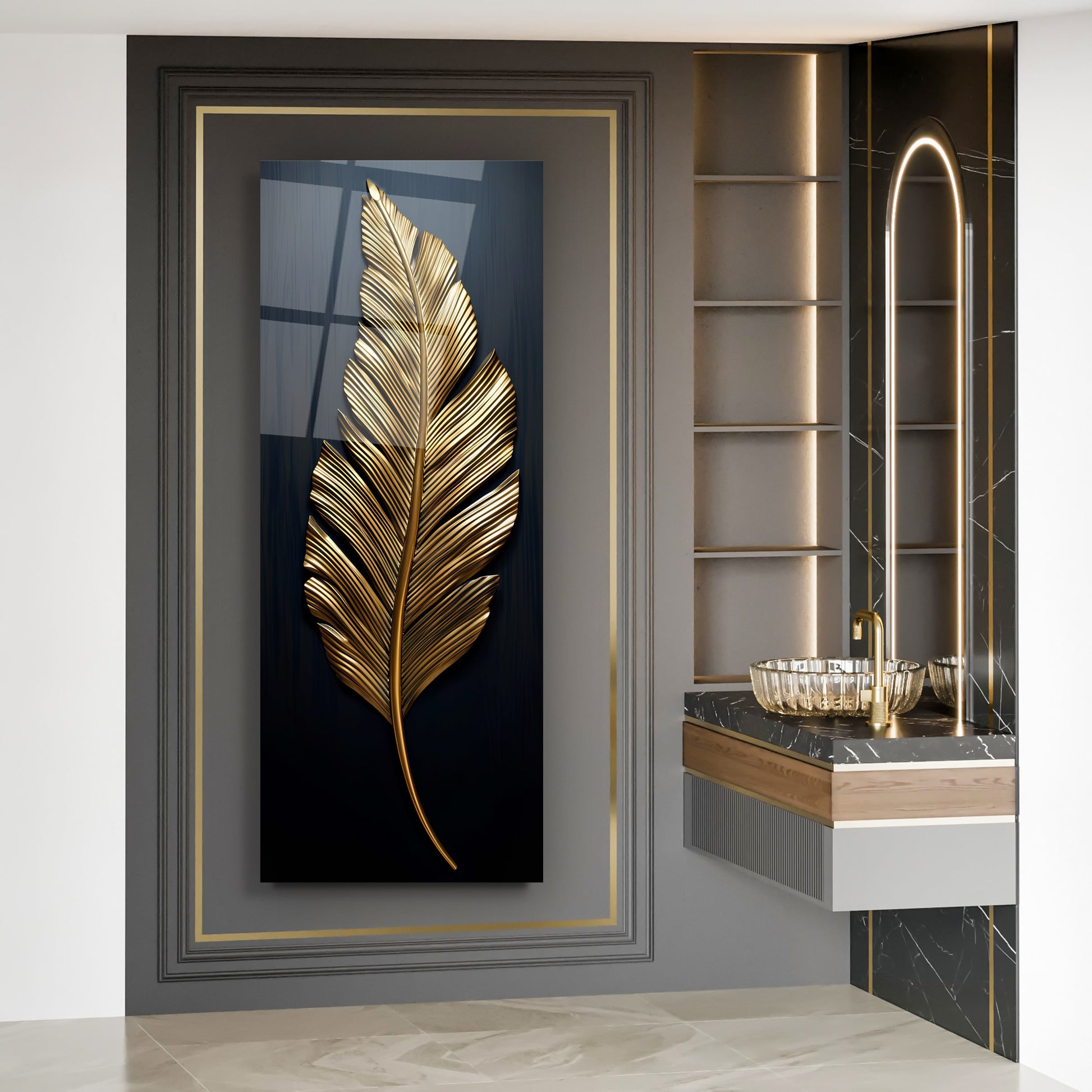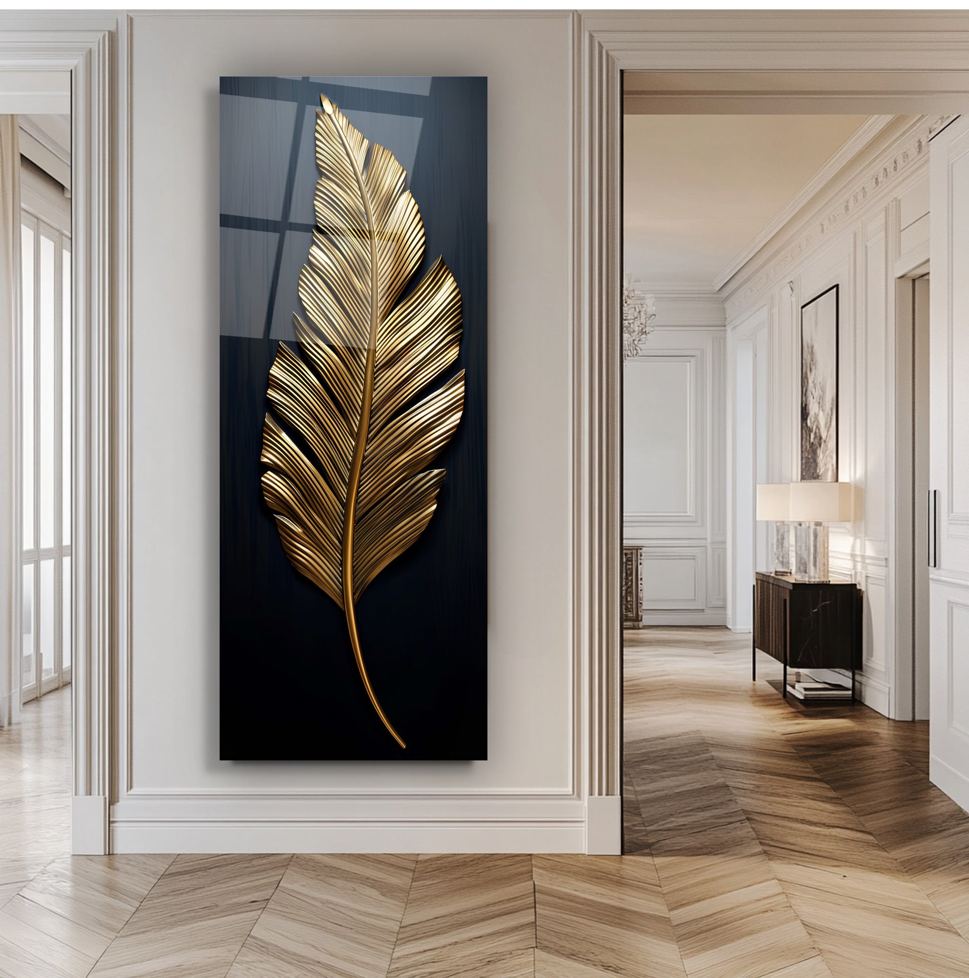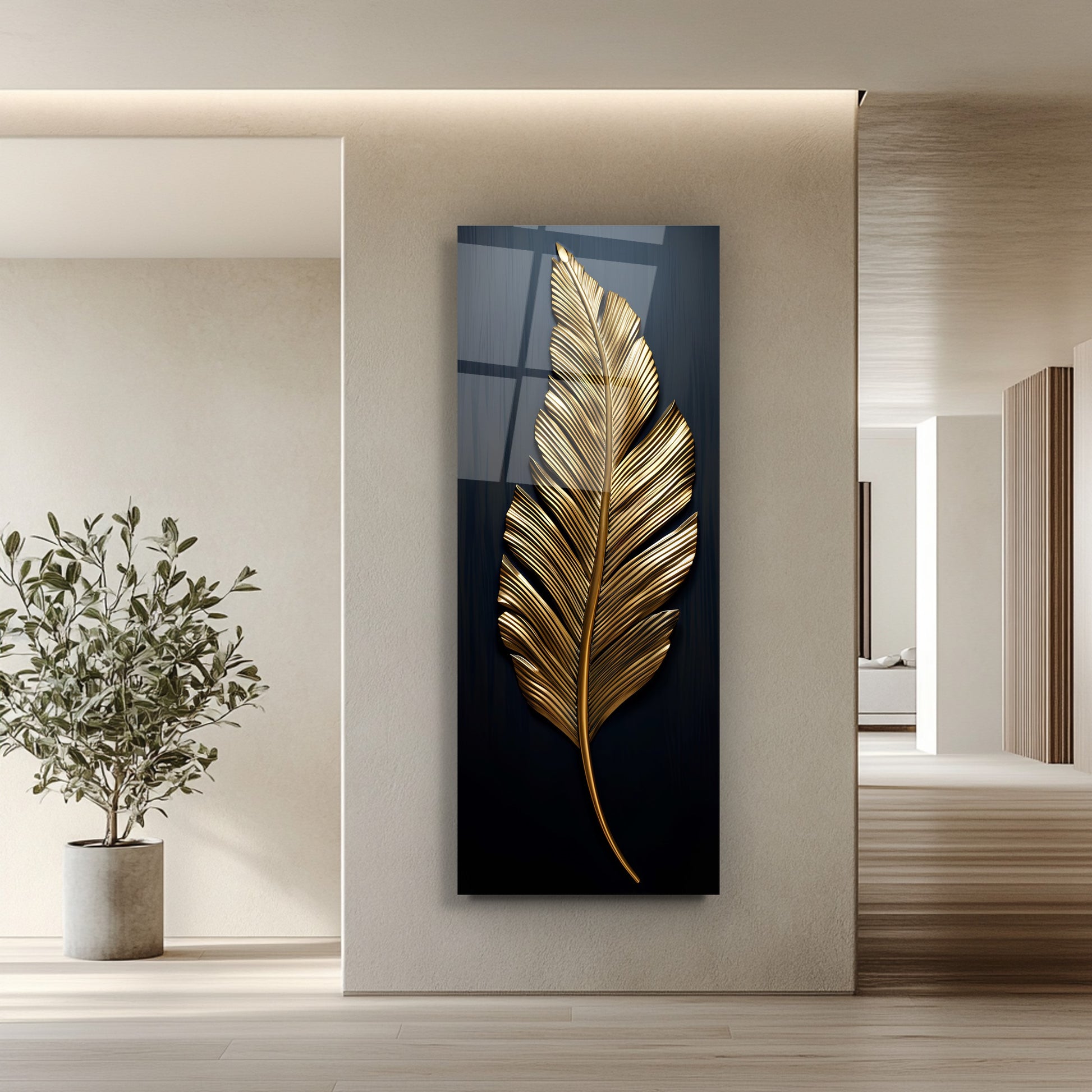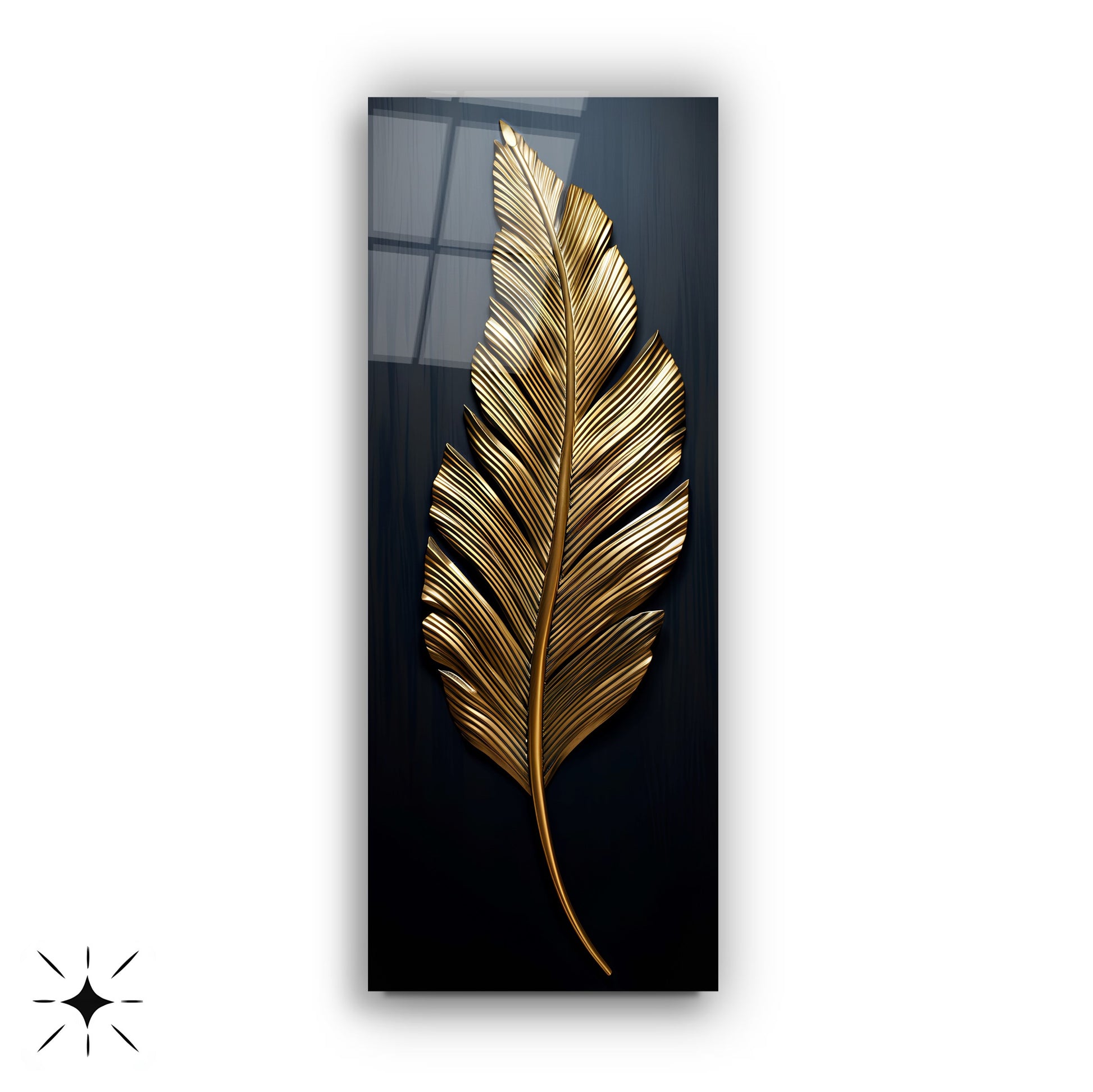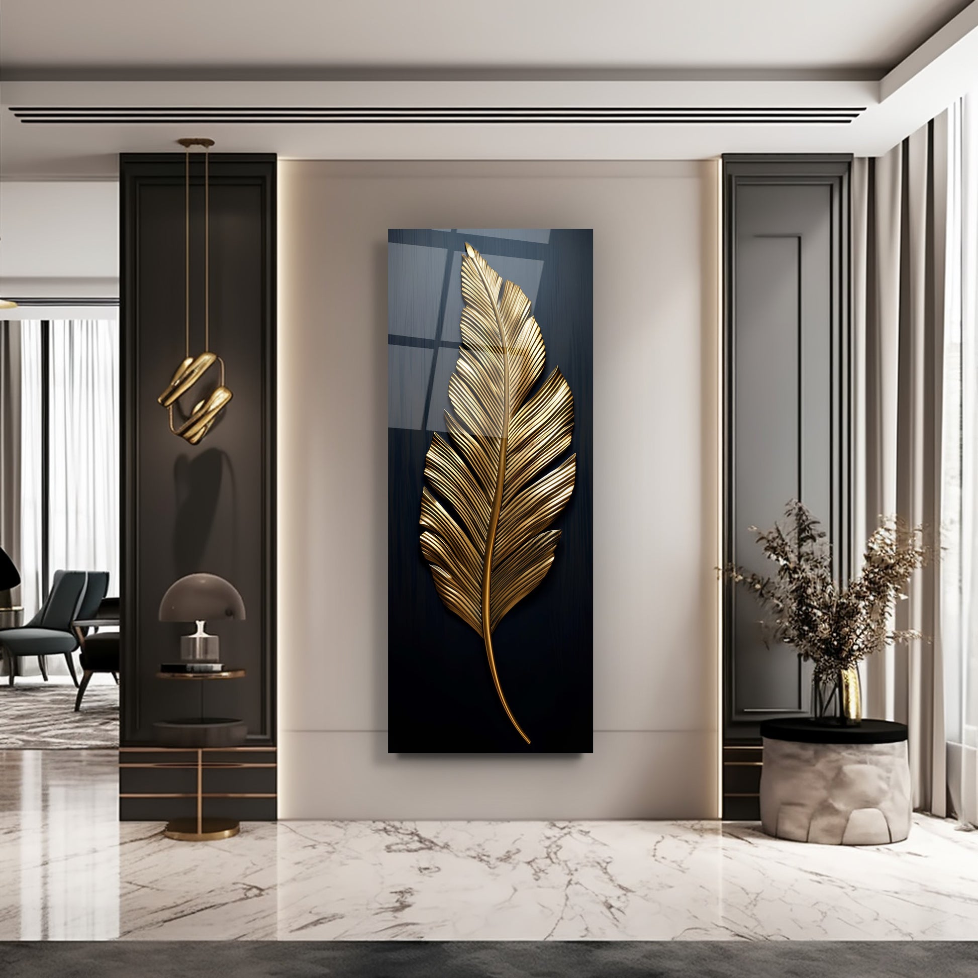 Siyah zemin üzerinde gold ve bronz yaprak ve tüy detaylarıyla tasarlanan bu panoramik gerçek cam tablo, şıklık ve zarafeti modern dokunuşlarla birleştirir. Kırılmaz cam yapısı uzun ömürlü ve dayanıklıdır. Geniş panoramik formu, yaşam alanlarında dengeli ve göz alıcı bir atmosfer yaratır. Modern dekorasyonlarda sofistike ve dikkat çekici bir tercih olarak öne çıkar.