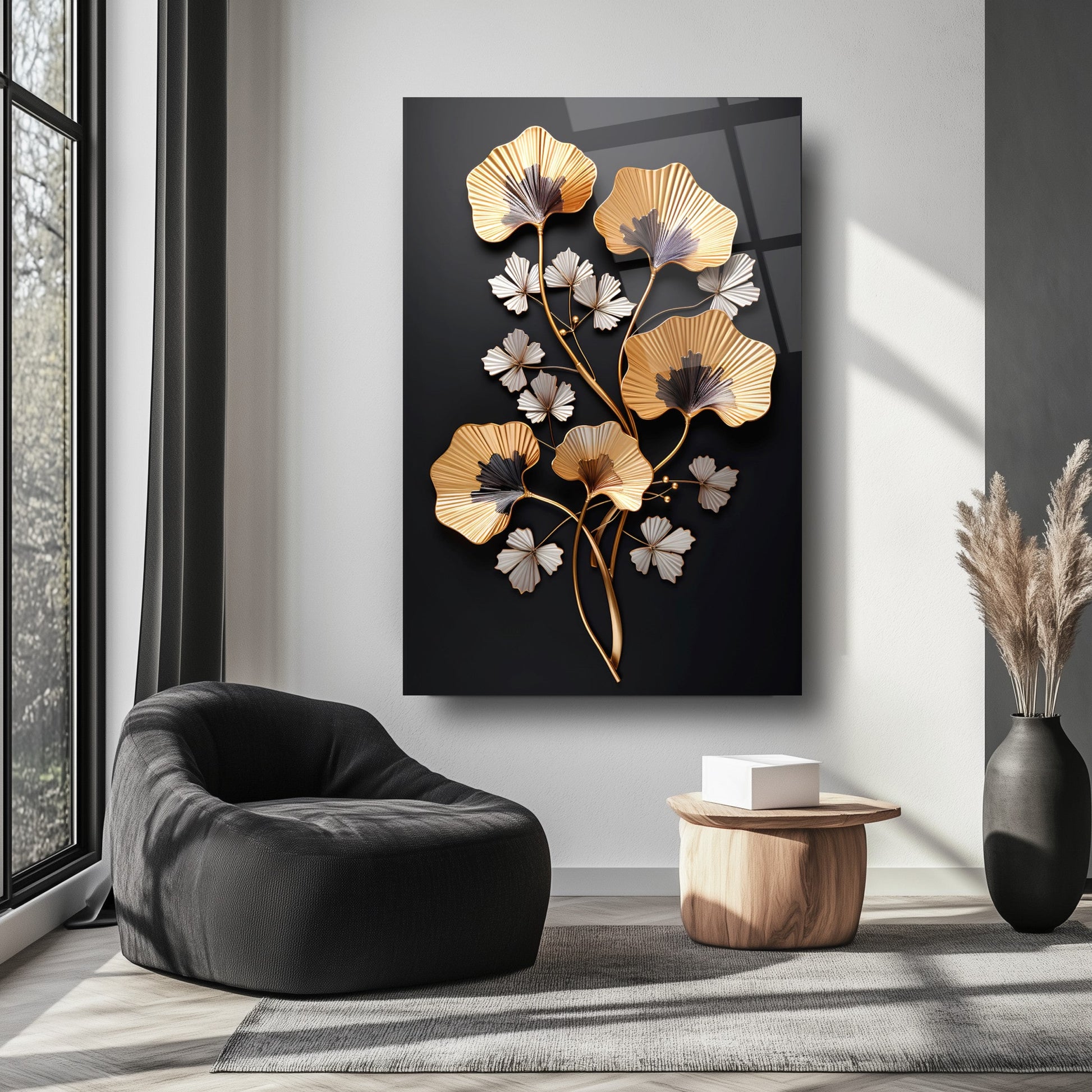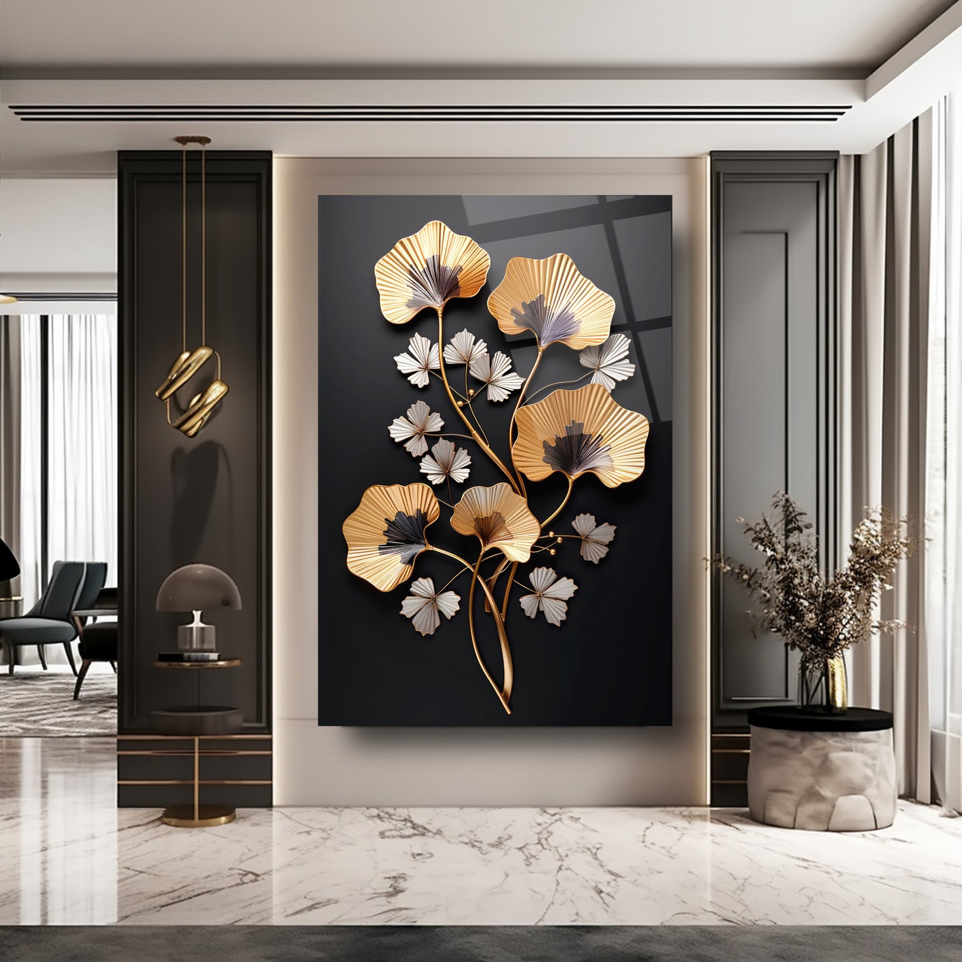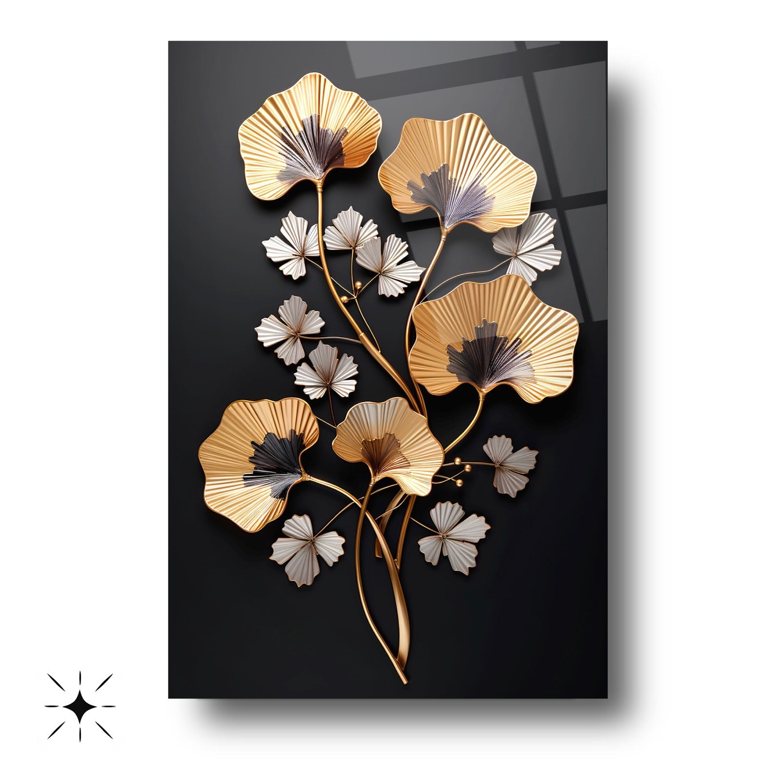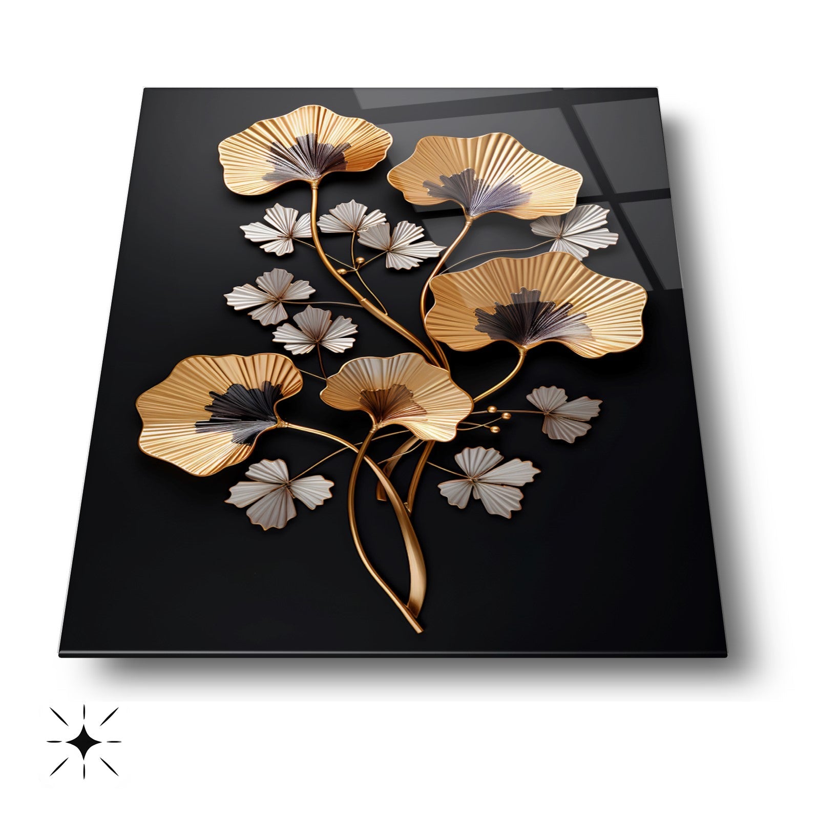 Zarafetin ve şıklığın buluştuğu nokta: Siyah arka plan üzerinde kabartmalı üç boyutlu gold ve beyaz çiçek detaylarıyla tasarlanan bu tablo, yaşam alanlarınıza lüks ve estetik bir dokunuş katıyor. Ultra-clear temperli cam malzeme, standart camlara göre 10 kat daha dayanıklıdır ve rodajlanmış kenarlarıyla güvenli kullanım sağlar. UV dijital baskı teknolojisiyle uygulanan yüksek çözünürlüklü baskı, renklerin solmasını engeller ve uzun ömürlü kullanım sunar. Kolay montajı sayesinde hemen duvarınıza asılabilir. Salon, oturma odası veya ofis gibi farklı alanlarda şıklığıyla öne çıkar. Evinize veya iş yerinize modern bir atmosfer kazandırmak için bu tablo mükemmel bir tercih olacaktır.