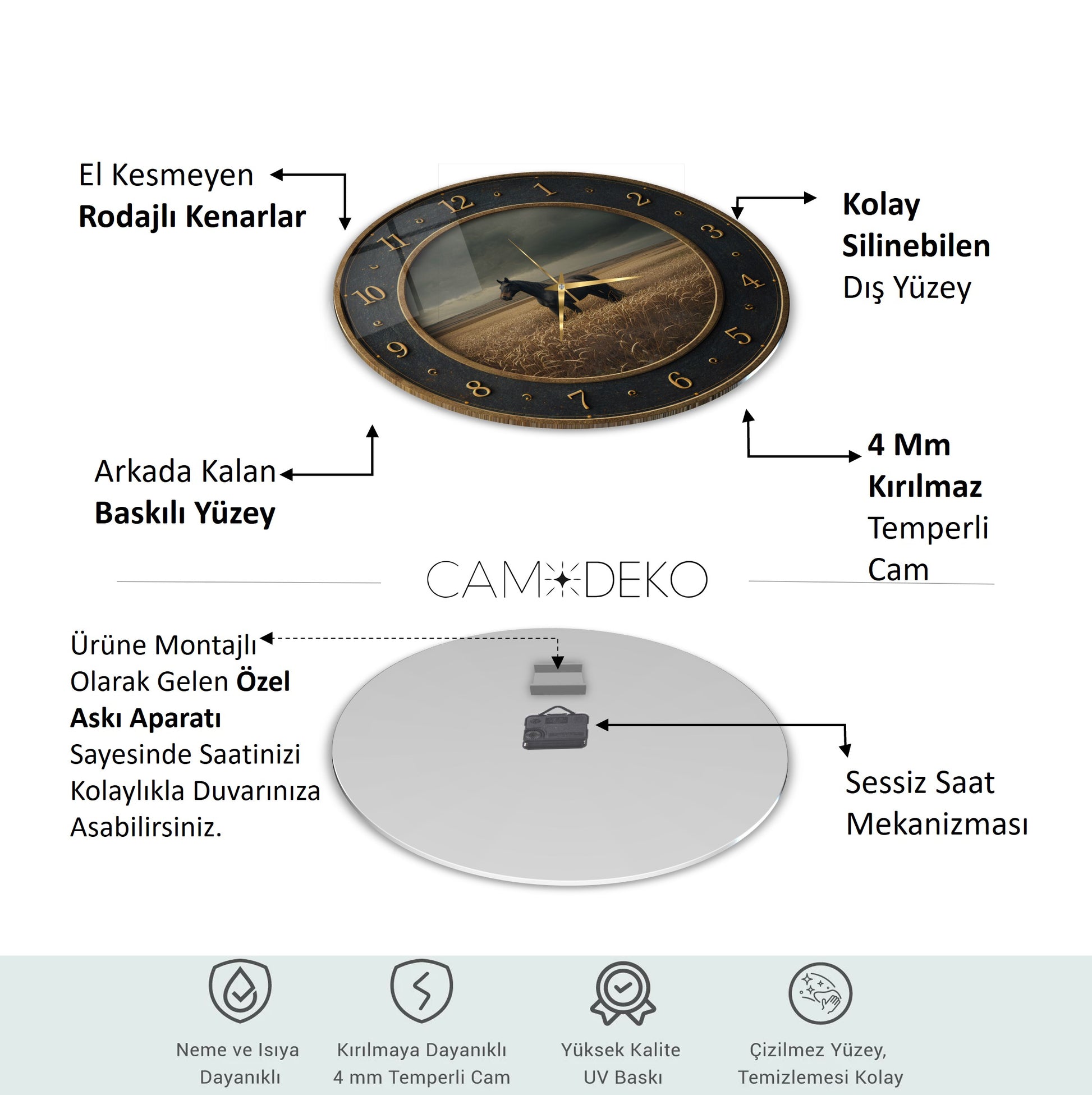 Saatlerimizde 4 mm kalınlığında ultra clear temperli cam kullanılır. Rodajlanmış (el kesmeyen) kenarları, hem güvenli hem de estetik bir görünüm sunar. Zamansız tasarımıyla ev ve ofis dekorasyonuna şıklık katar.