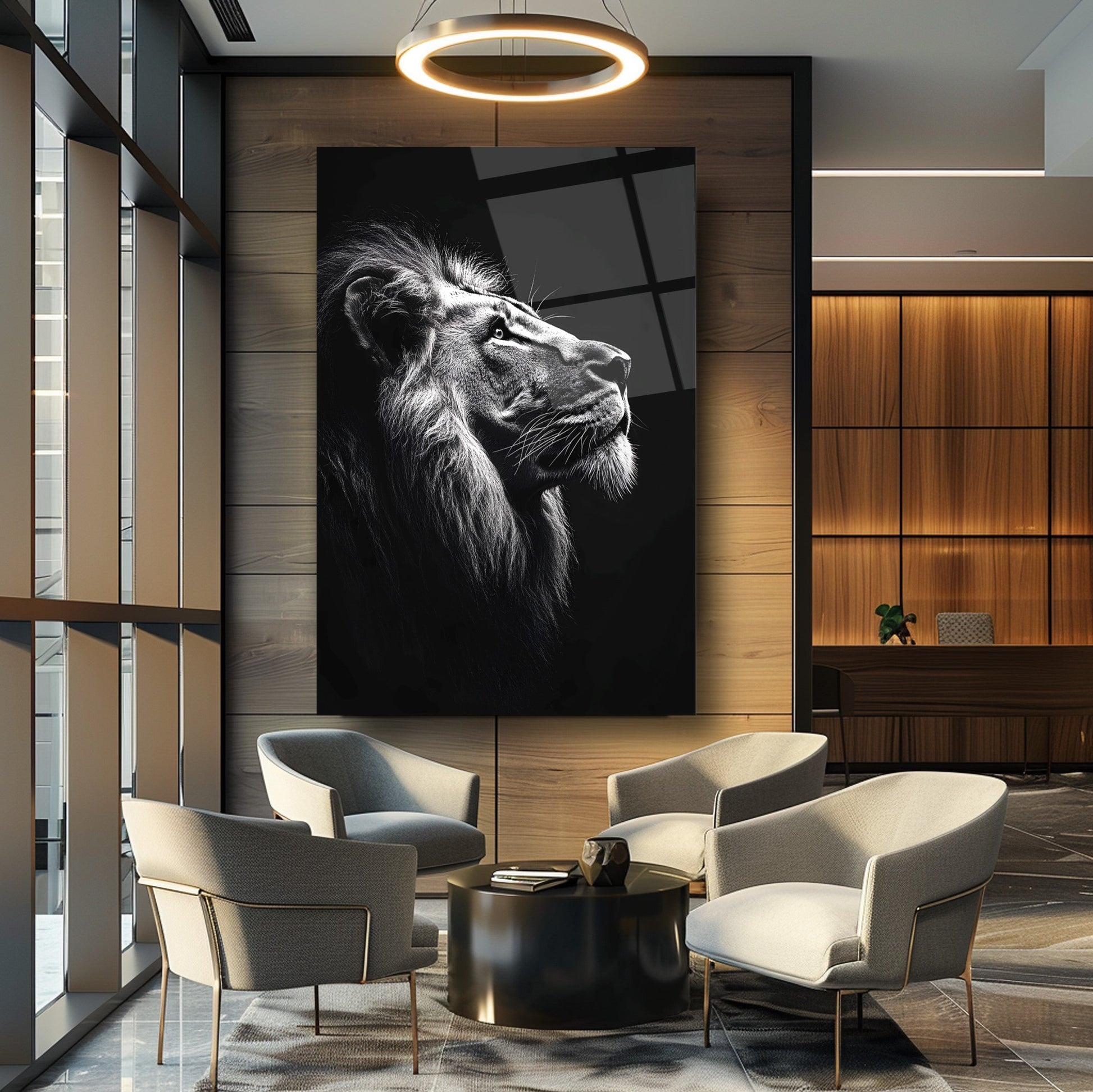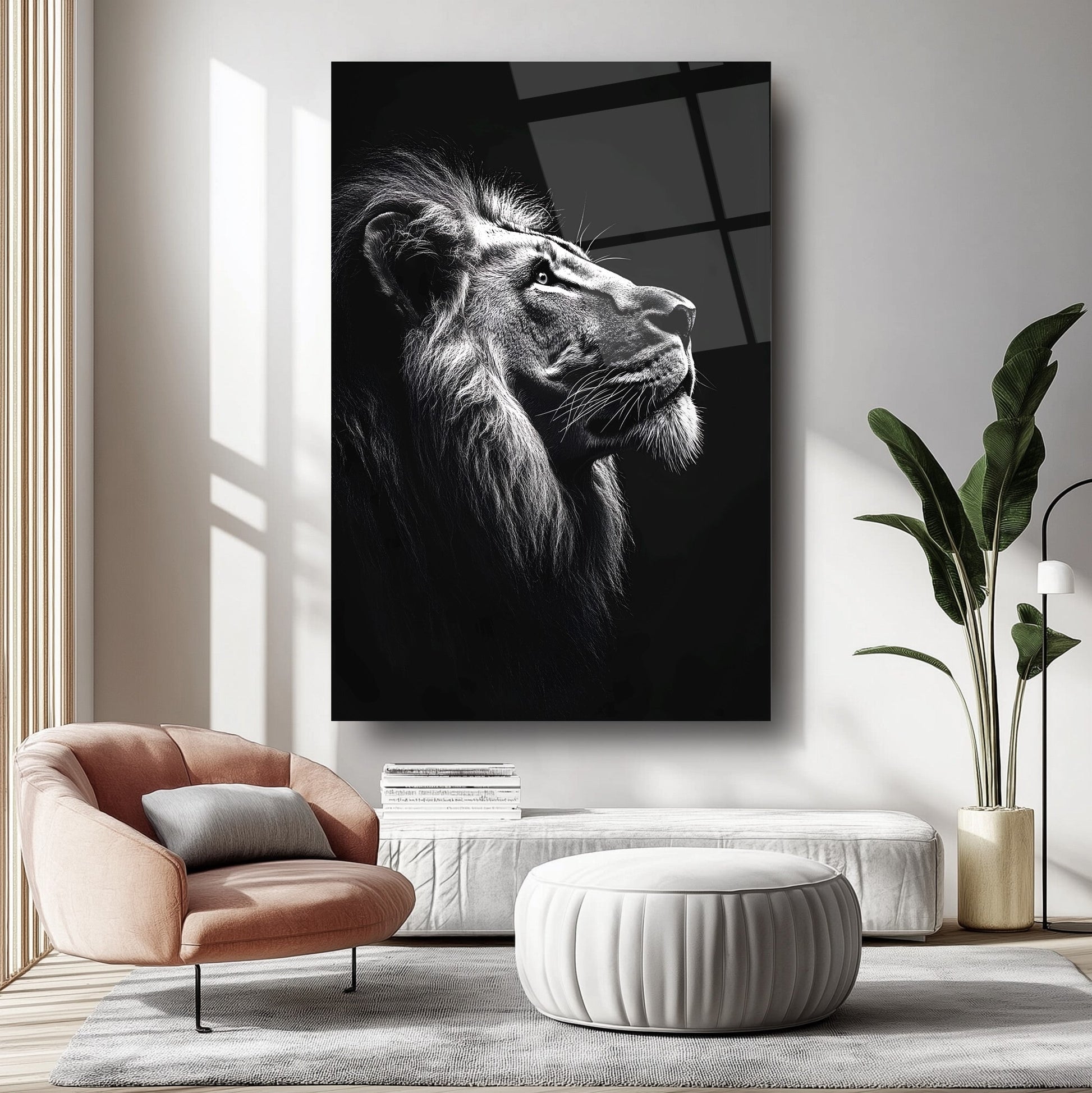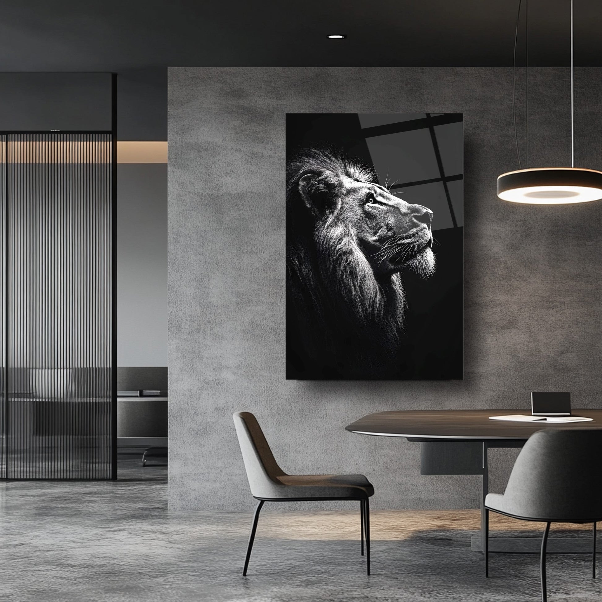 Vahşi Doğanın Asaleti: Siyah Beyaz Aslan Modern Kırılmaz Cam Tablo
