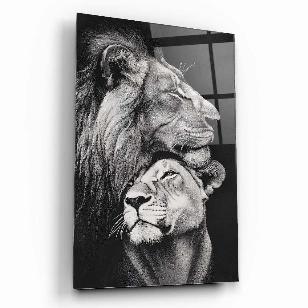 Gücün ve Uyumun Sembolü: Siyah Beyaz Erkek ve Dişi Aslan Cam Tablo