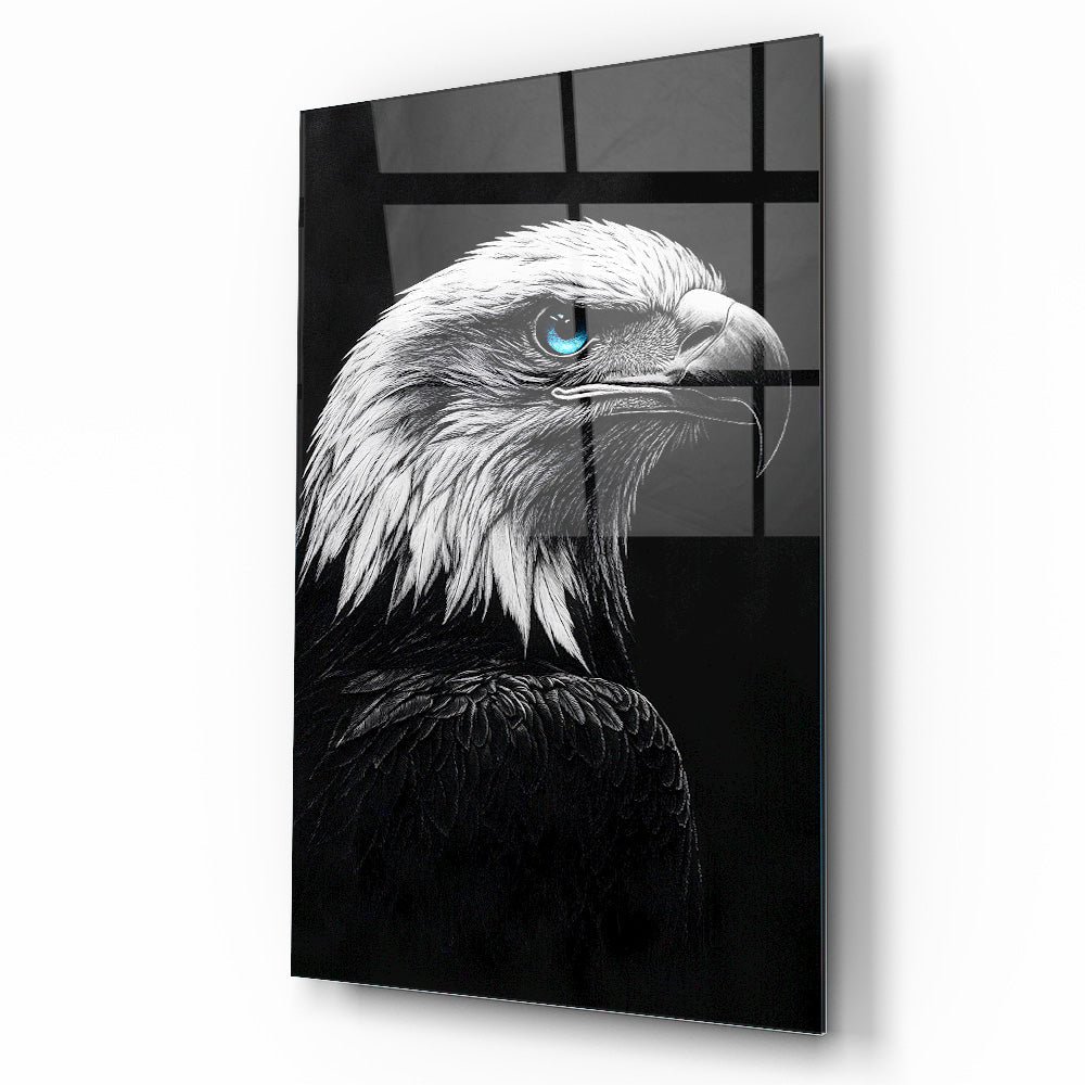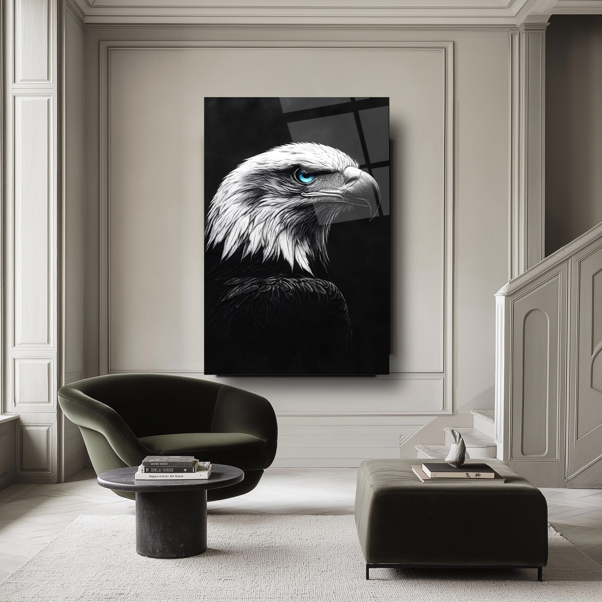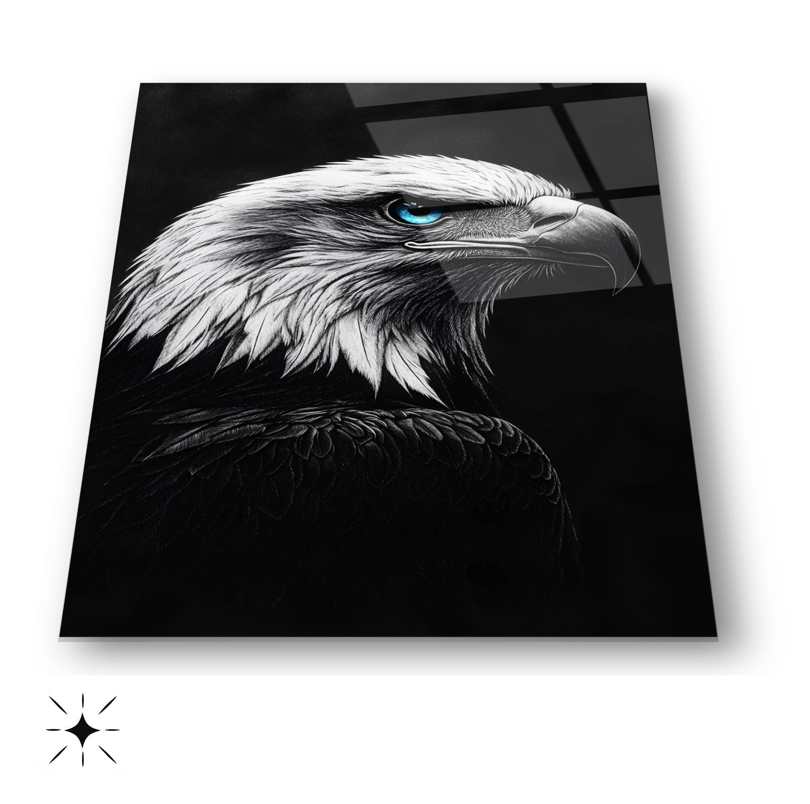 Gücün ve Asaletin Keskin Bakışı: Siyah Beyaz Mavi Gözlü Kartal Cam Tablo