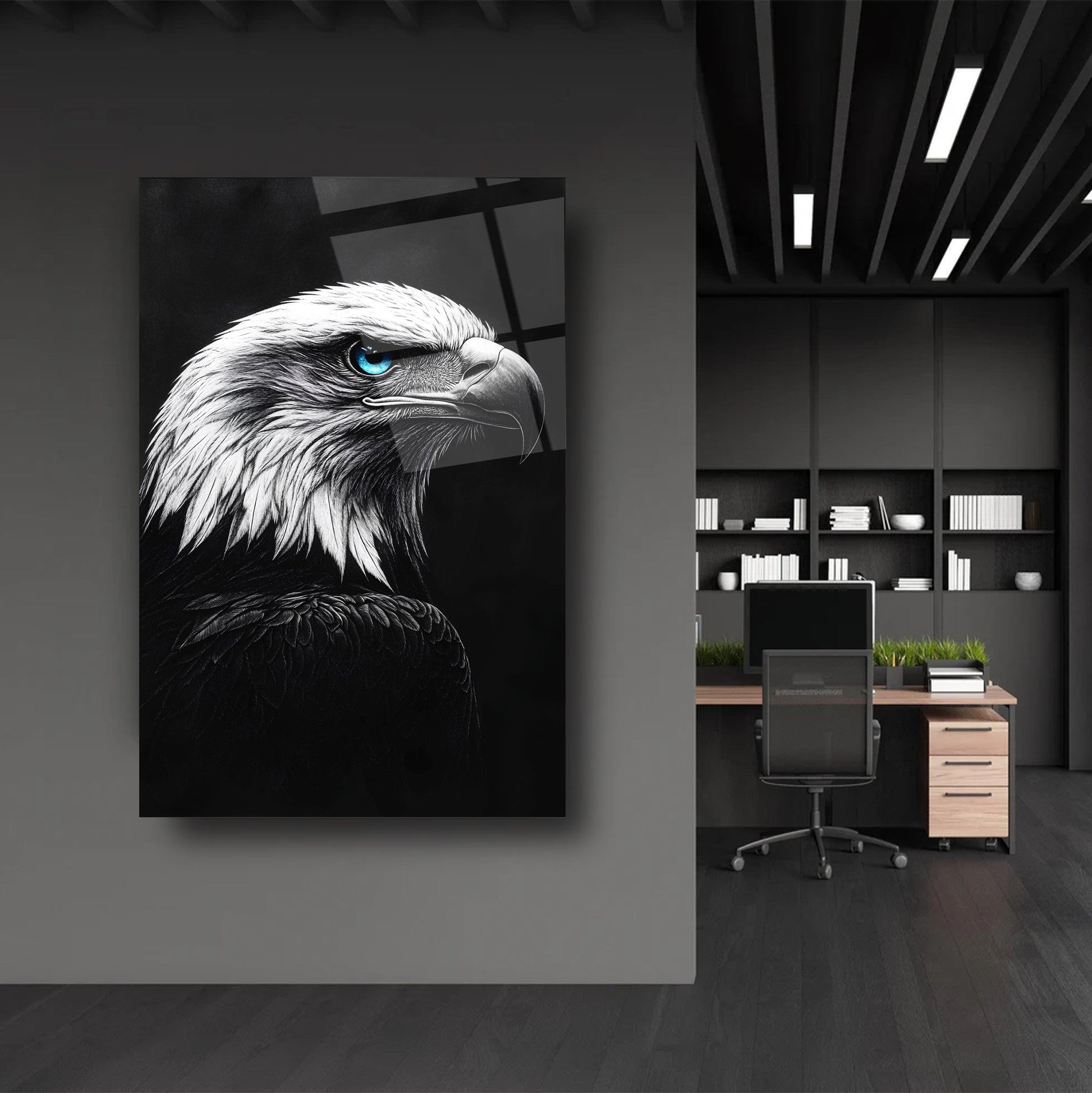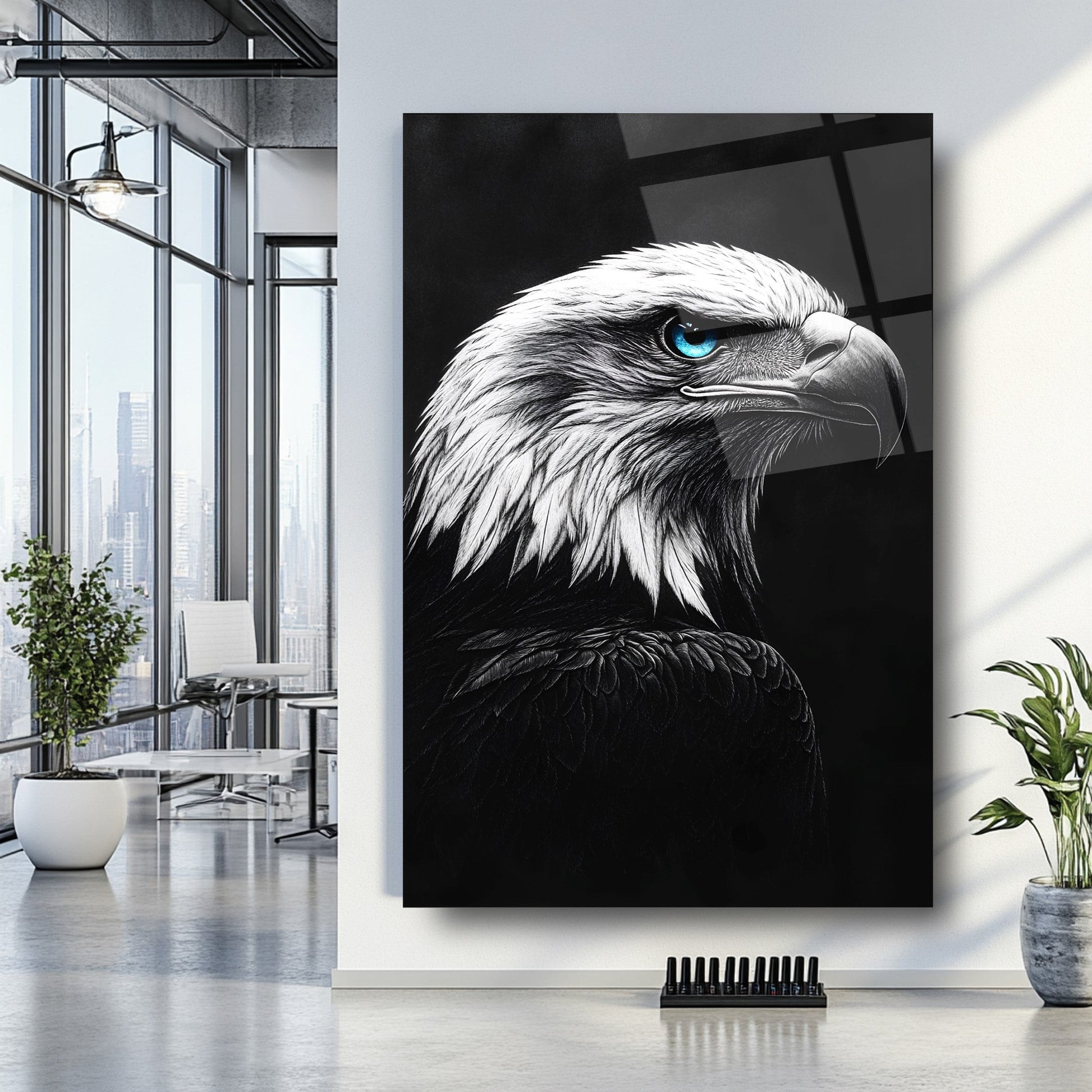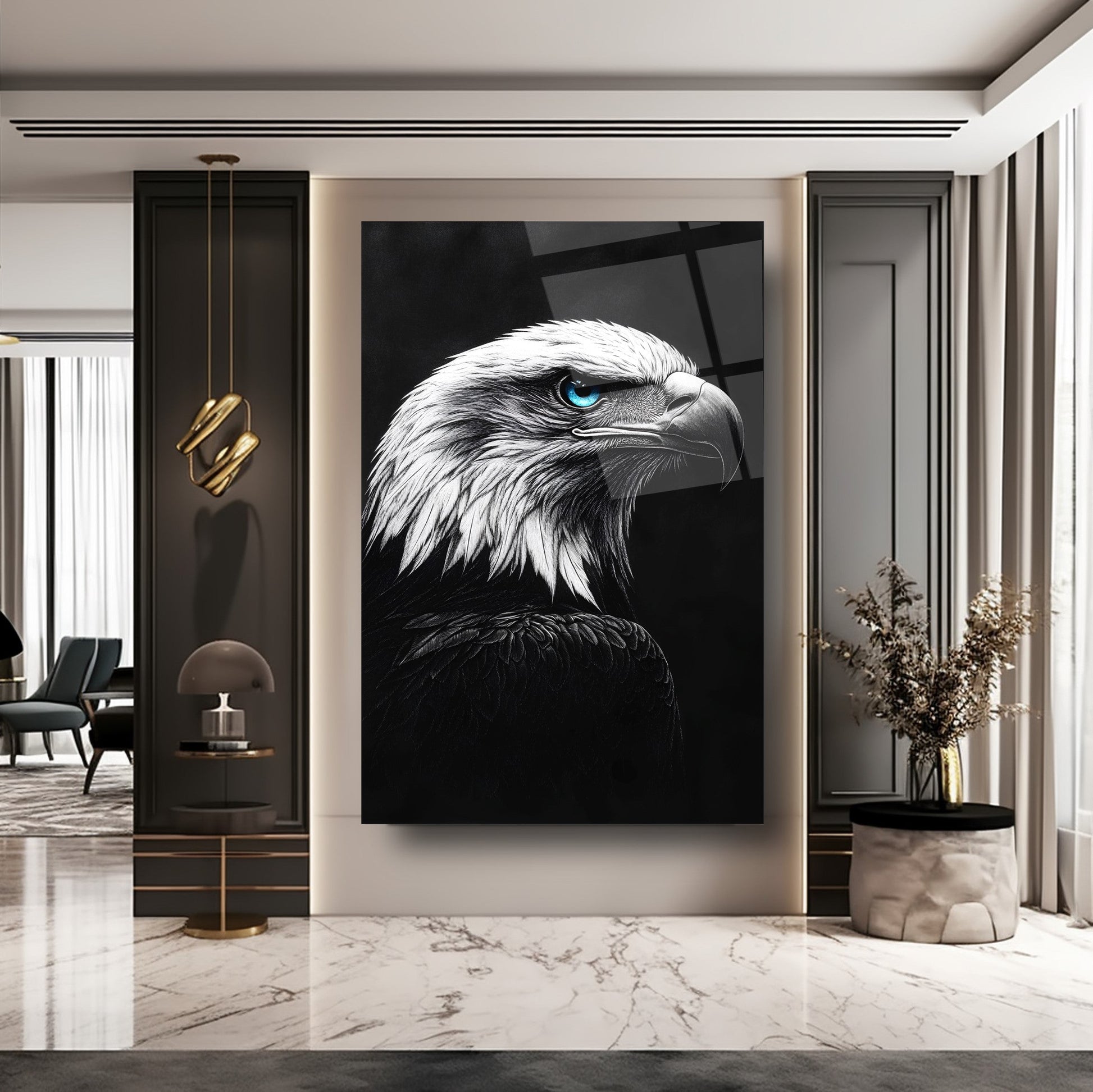 Gücün ve Asaletin Keskin Bakışı: Siyah Beyaz Mavi Gözlü Kartal Cam Tablo