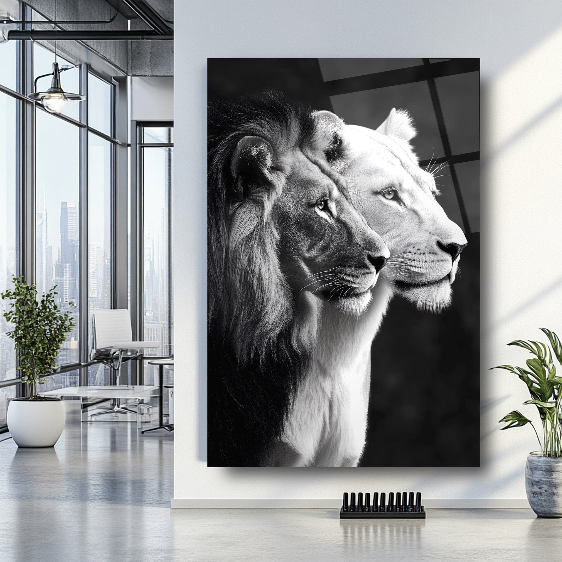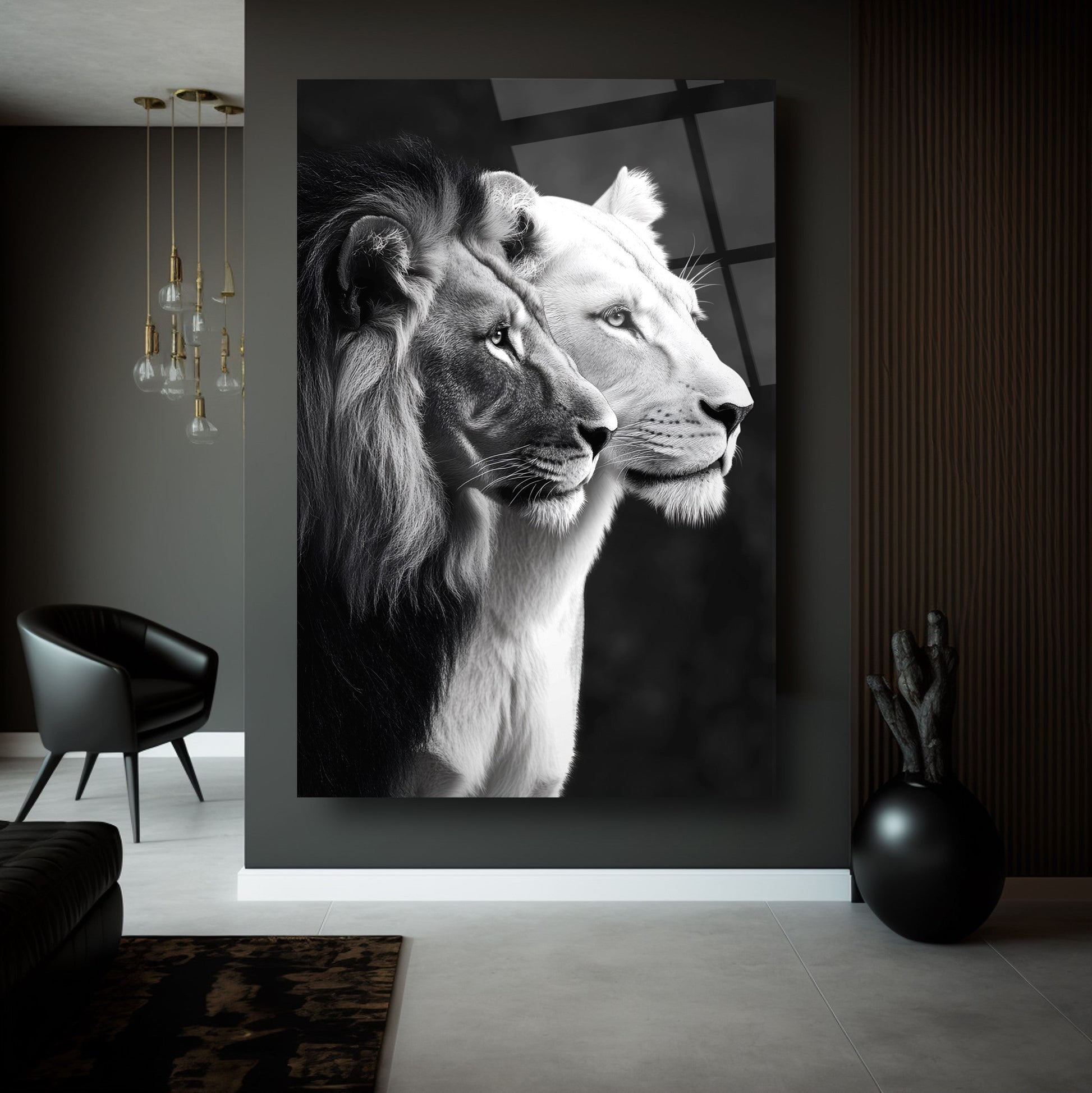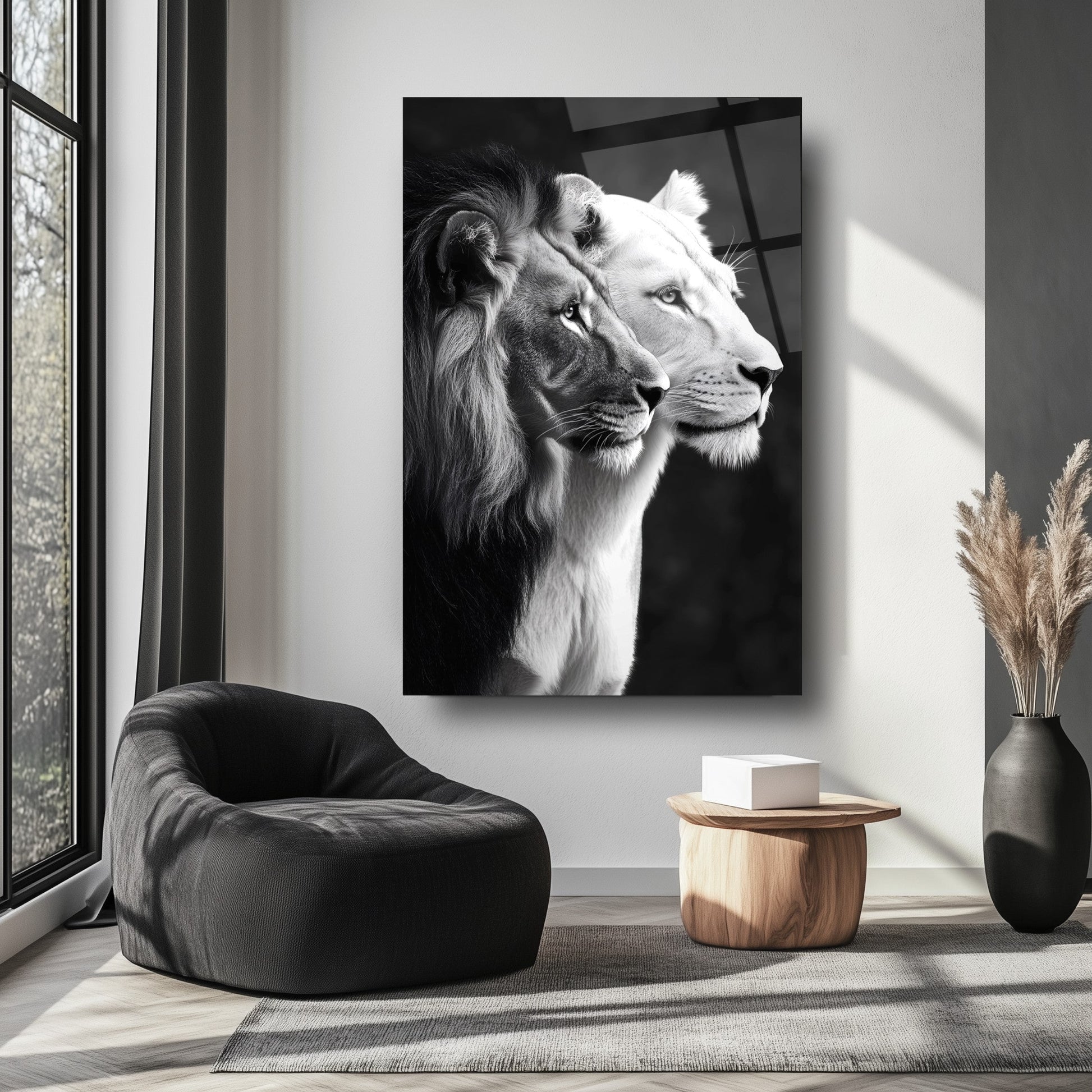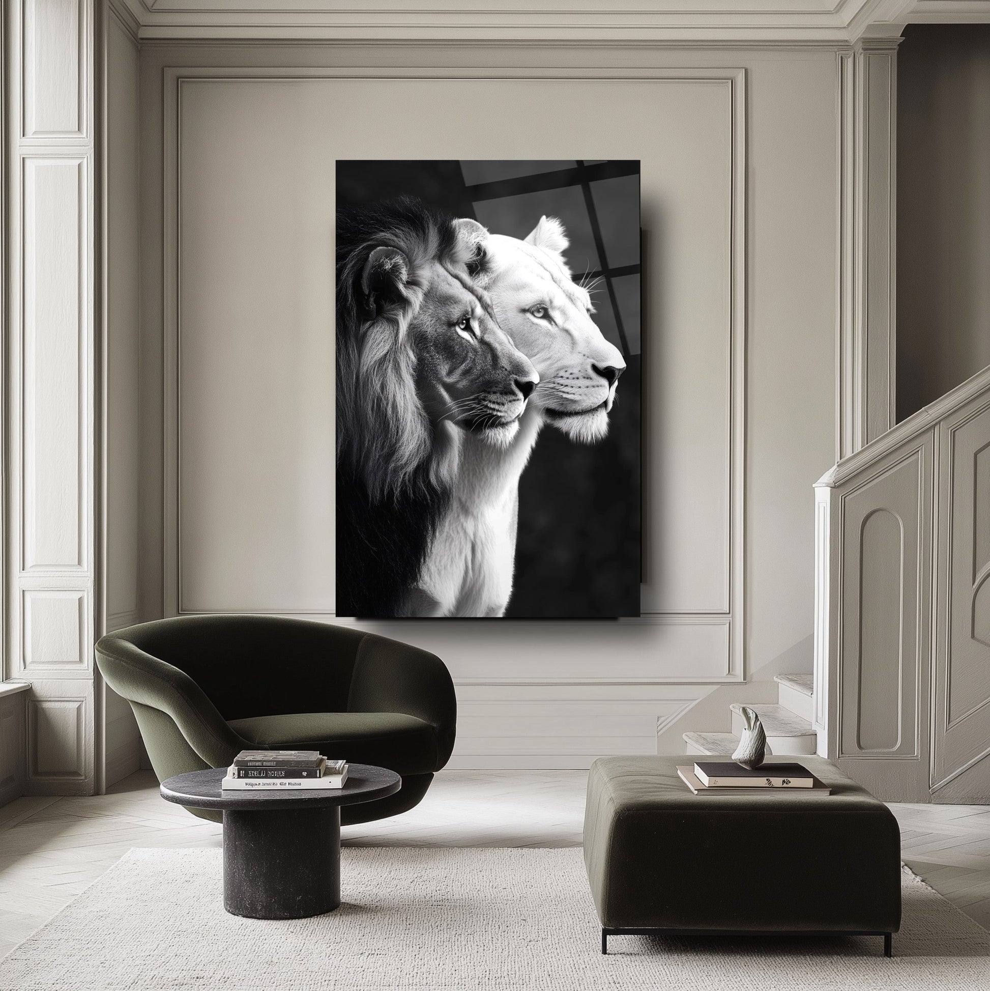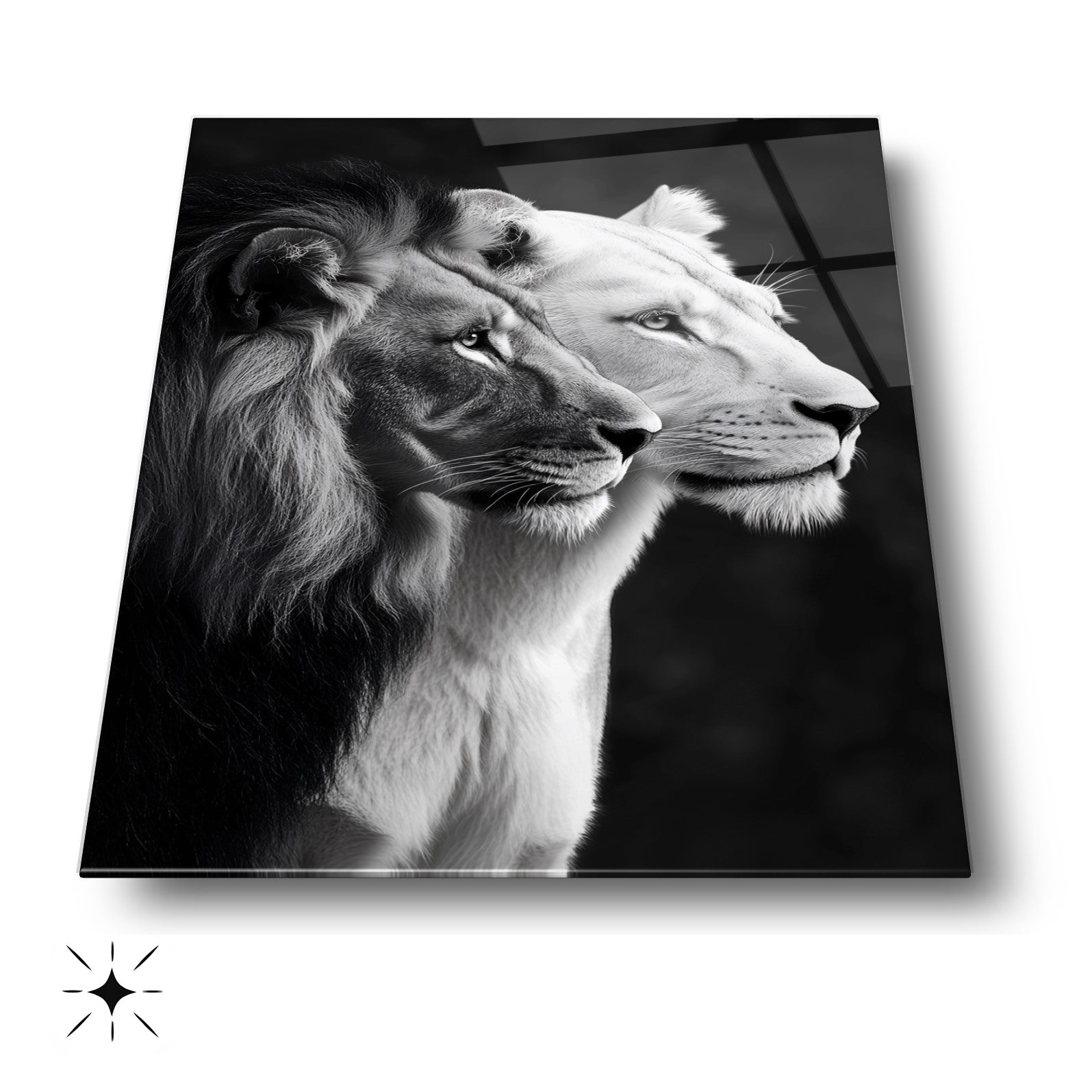 Gücün ve Uyumun Yansıması: Siyah Beyaz Erkek ve Dişi Aslan Cam Tablo