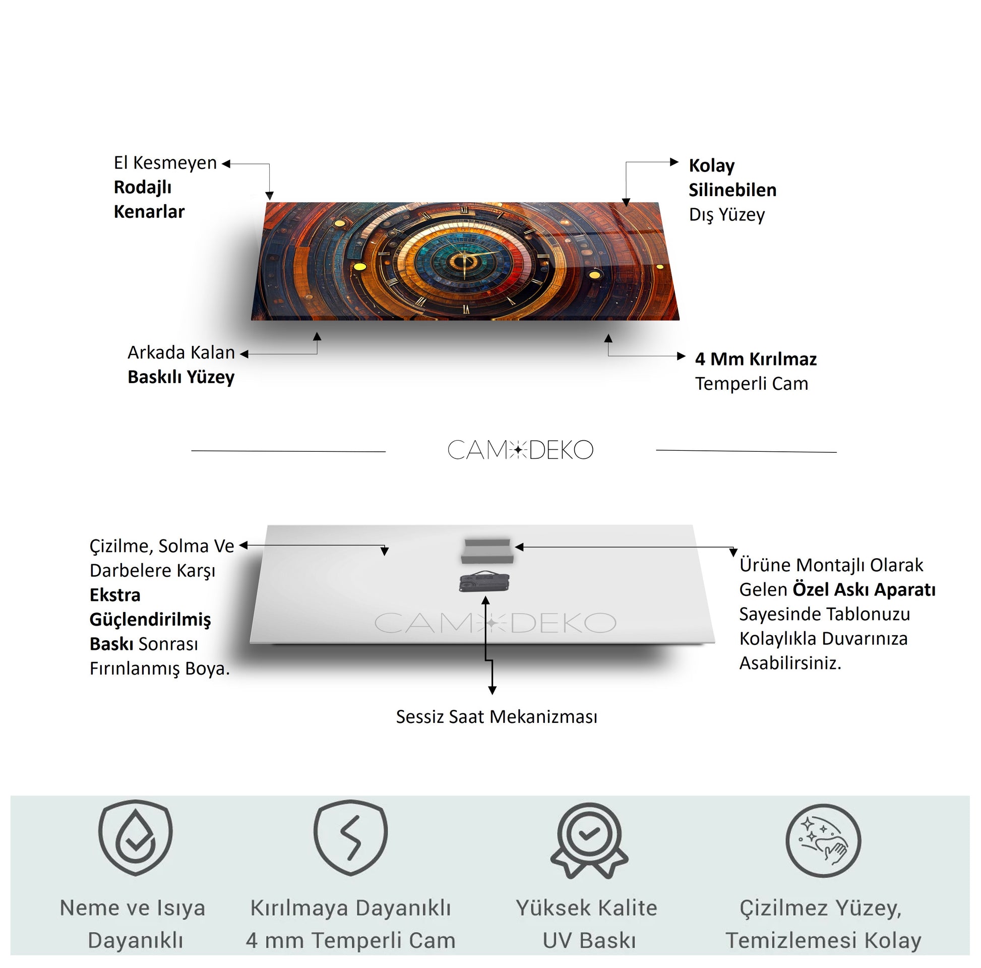 Cam saatlerimiz, son teknoloji UV baskı makineleriyle doğrudan cama uygulanır. Kağıt veya folyo yapıştırma kullanılmaz; baskılar camın arka yüzeyine işlenerek uzun ömürlü ve dayanıklı hale getirilir. Ek olarak, fırınlama boya işlemi ile güçlendirilerek solmaya ve deformasyona karşı ekstra koruma sağlanır.